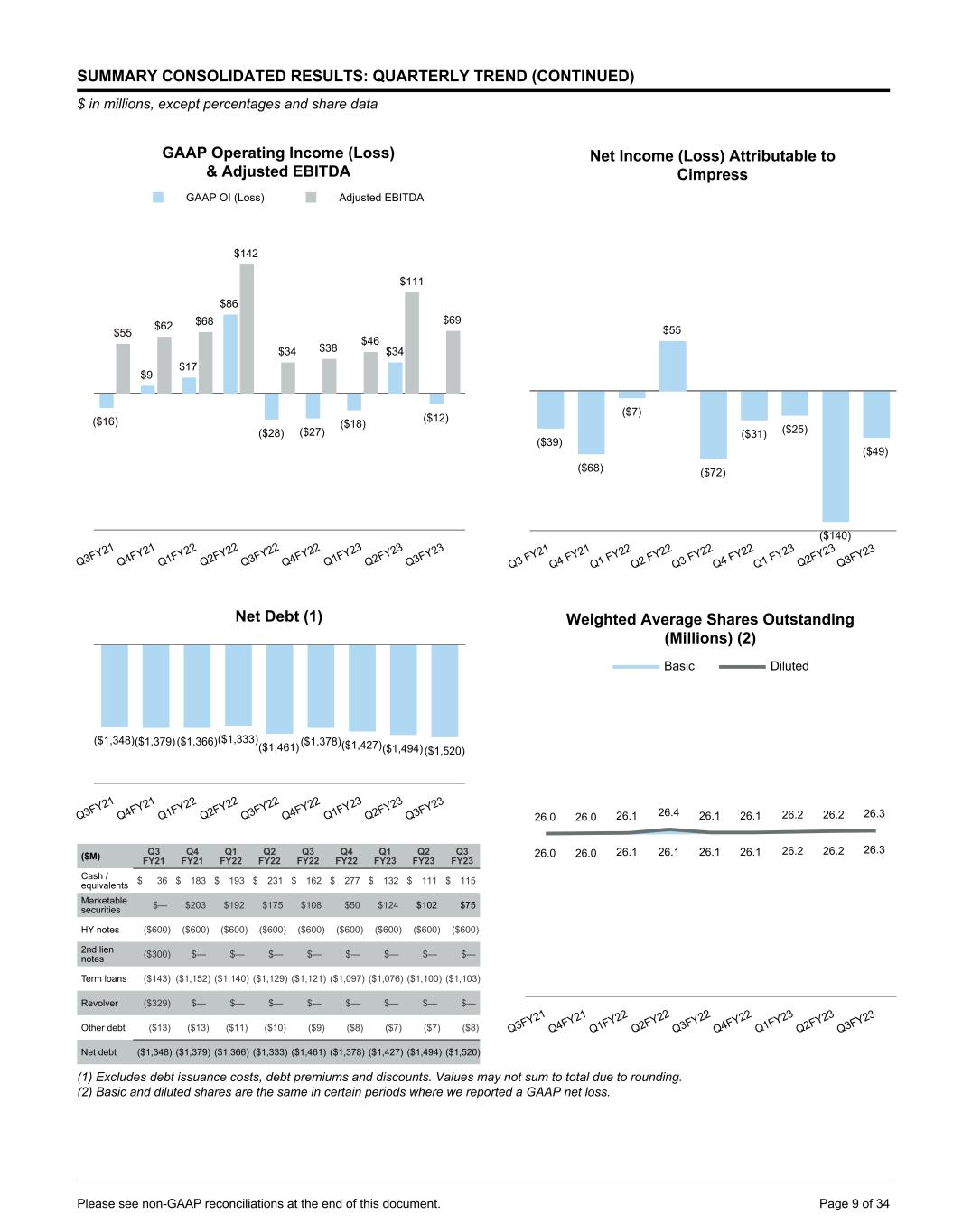 SUMMARY CONSOLIDATED RESULTS: QUARTERLY TREND (CONTINUED) $ in millions, except percentages and share data GAAP Operating Income (Loss) & Adjusted EBITDA ($16) $9 $17 $86 ($28) ($27) ($18) $34 ($12) $55 $62 $68 $142 $34 $38 $46 $111 $69 GAAP OI (Loss) Adjusted EBITDA Q3FY21 Q4FY21 Q1FY22 Q2FY22 Q3FY22 Q4FY22 Q1FY23 Q2FY23 Q3FY23 Net Debt (1) ($1,348)($1,379) ($1,366)($1,333) ($1,461) ($1,378)($1,427)($1,494) ($1,520) Q3FY21 Q4FY21 Q1FY22 Q2FY22 Q3FY22 Q4FY22 Q1FY23 Q2FY23 Q3FY23 ($M) Q3 FY21 Q4 FY21 Q1 FY22 Q2 FY22 Q3 FY22 Q4 FY22 Q1 FY23 Q2 FY23 Q3 FY23 Cash / equivalents $ 36 $ 183 $ 193 $ 231 $ 162 $ 277 $ 132 $ 111 $ 115 Marketable securities $— $203 $192 $175 $108 $50 $124 $102 $75 HY notes ($600) ($600) ($600) ($600) ($600) ($600) ($600) ($600) ($600) 2nd lien notes ($300) $— $— $— $— $— $— $— $— Term loans ($143) ($1,152) ($1,140) ($1,129) ($1,121) ($1,097) ($1,076) ($1,100) ($1,103) Revolver ($329) $— $— $— $— $— $— $— $— Other debt ($13) ($13) ($11) ($10) ($9) ($8) ($7) ($7) ($8) Net debt ($1,348) ($1,379) ($1,366) ($1,333) ($1,461) ($1,378) ($1,427) ($1,494) ($1,520) Net Income (Loss) Attributable to Cimpress ($39) ($68) ($7) $55 ($72) ($31) ($25) ($140) ($49) Q3 FY21 Q4 FY21 Q1 FY22 Q2 FY22 Q3 FY22 Q4 FY22 Q1 FY23 Q2FY23 Q3FY23 Weighted Average Shares Outstanding (Millions) (2) 26.0 26.0 26.1 26.1 26.1 26.1 26.2 26.2 26.3 26.0 26.0 26.1 26.4 26.1 26.1 26.2 26.2 26.3 Basic Diluted Q3FY21 Q4FY21 Q1FY22 Q2FY22 Q3FY22 Q4FY22 Q1FY23 Q2FY23 Q3FY23 (1) Excludes debt issuance costs, debt premiums and discounts. Values may not sum to total due to rounding. (2) Basic and diluted shares are the same in certain periods where we reported a GAAP net loss. Please see non-GAAP reconciliations at the end of this document. Page 9 of 34