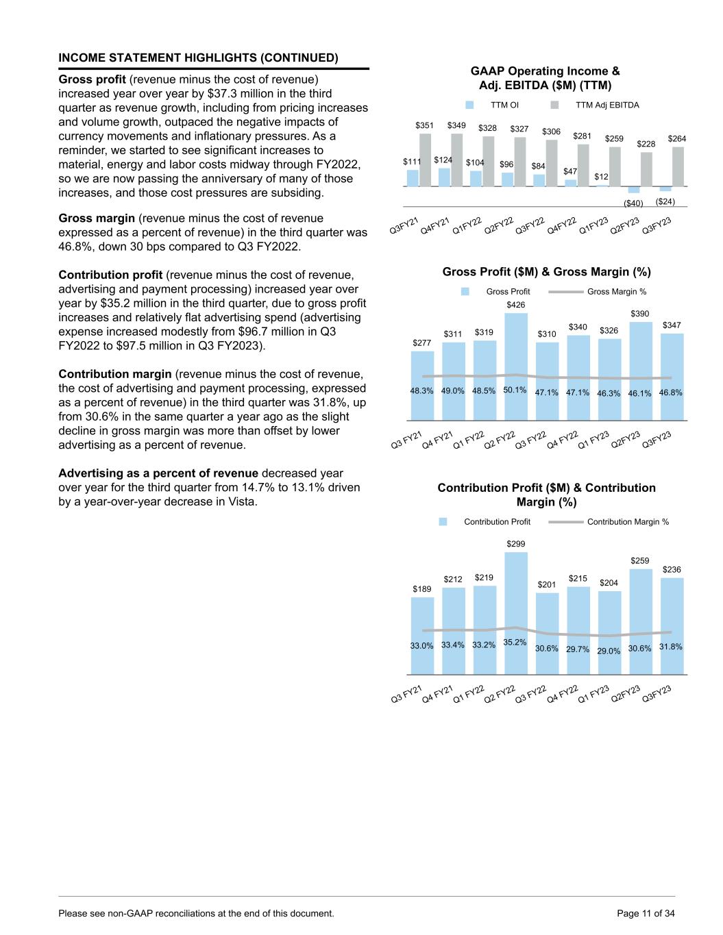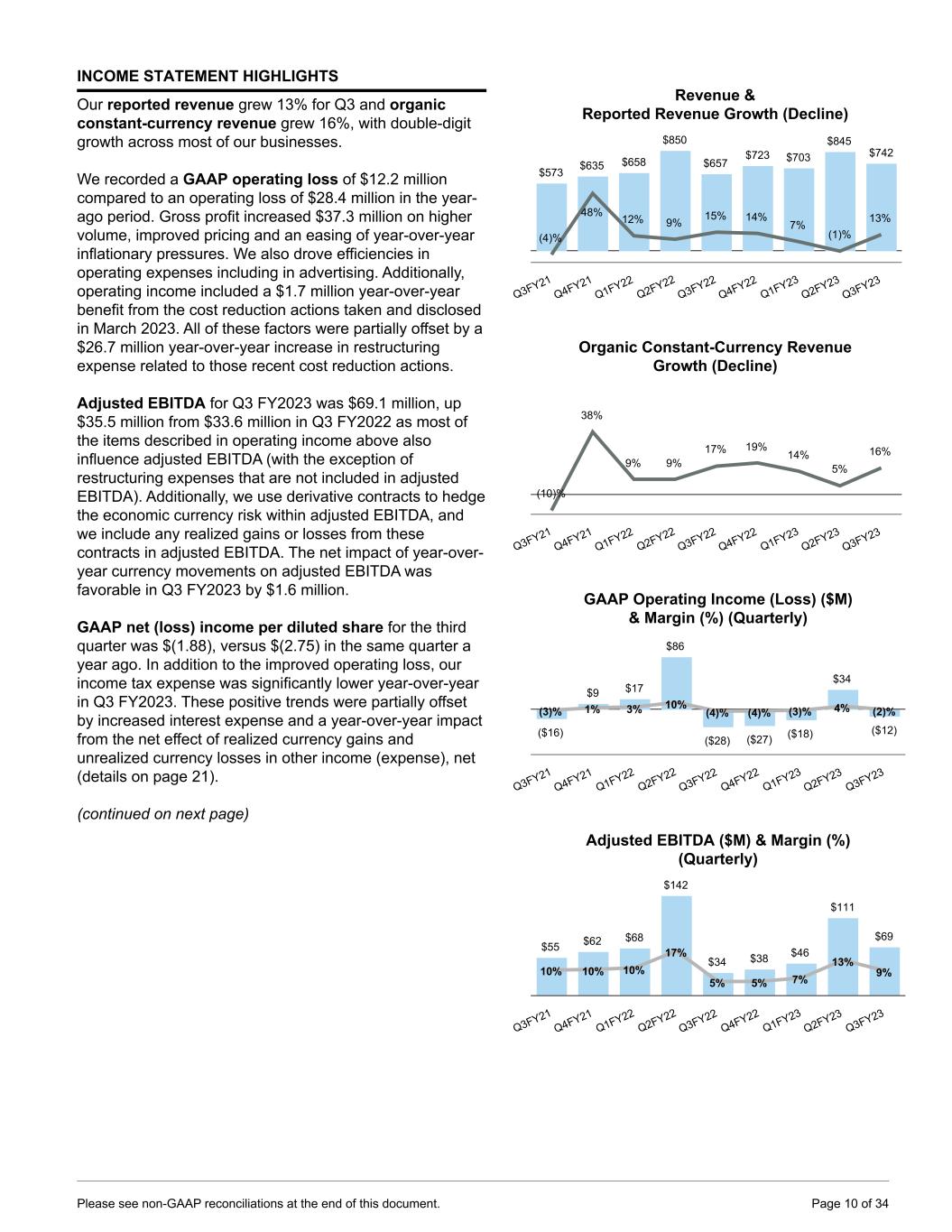 INCOME STATEMENT HIGHLIGHTS Our reported revenue grew 13% for Q3 and organic constant-currency revenue grew 16%, with double-digit growth across most of our businesses. We recorded a GAAP operating loss of $12.2 million compared to an operating loss of $28.4 million in the year- ago period. Gross profit increased $37.3 million on higher volume, improved pricing and an easing of year-over-year inflationary pressures. We also drove efficiencies in operating expenses including in advertising. Additionally, operating income included a $1.7 million year-over-year benefit from the cost reduction actions taken and disclosed in March 2023. All of these factors were partially offset by a $26.7 million year-over-year increase in restructuring expense related to those recent cost reduction actions. Adjusted EBITDA for Q3 FY2023 was $69.1 million, up $35.5 million from $33.6 million in Q3 FY2022 as most of the items described in operating income above also influence adjusted EBITDA (with the exception of restructuring expenses that are not included in adjusted EBITDA). Additionally, we use derivative contracts to hedge the economic currency risk within adjusted EBITDA, and we include any realized gains or losses from these contracts in adjusted EBITDA. The net impact of year-over- year currency movements on adjusted EBITDA was favorable in Q3 FY2023 by $1.6 million. GAAP net (loss) income per diluted share for the third quarter was $(1.88), versus $(2.75) in the same quarter a year ago. In addition to the improved operating loss, our income tax expense was significantly lower year-over-year in Q3 FY2023. These positive trends were partially offset by increased interest expense and a year-over-year impact from the net effect of realized currency gains and unrealized currency losses in other income (expense), net (details on page 21). (continued on next page) Revenue & Reported Revenue Growth (Decline) $573 $635 $658 $850 $657 $723 $703 $845 $742 (4)% 48% 12% 9% 15% 14% 7% (1)% 13% Q3FY21 Q4FY21 Q1FY22 Q2FY22 Q3FY22 Q4FY22 Q1FY23 Q2FY23 Q3FY23 Organic Constant-Currency Revenue Growth (Decline) (10)% 38% 9% 9% 17% 19% 14% 5% 16% Q3FY21 Q4FY21 Q1FY22 Q2FY22 Q3FY22 Q4FY22 Q1FY23 Q2FY23 Q3FY23 GAAP Operating Income (Loss) ($M) & Margin (%) (Quarterly) ($16) $9 $17 $86 ($28) ($27) ($18) $34 ($12) (3)% 1% 3% 10% (4)% (4)% (3)% 4% (2)% Q3FY21 Q4FY21 Q1FY22 Q2FY22 Q3FY22 Q4FY22 Q1FY23 Q2FY23 Q3FY23 Adjusted EBITDA ($M) & Margin (%) (Quarterly) $55 $62 $68 $142 $34 $38 $46 $111 $69 10% 10% 10% 17% 5% 5% 7% 13% 9% Q3FY21 Q4FY21 Q1FY22 Q2FY22 Q3FY22 Q4FY22 Q1FY23 Q2FY23 Q3FY23 Please see non-GAAP reconciliations at the end of this document. Page 10 of 34
