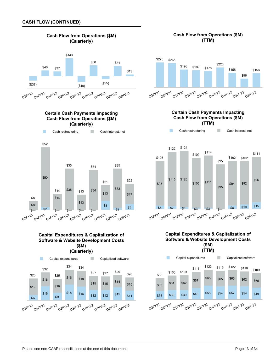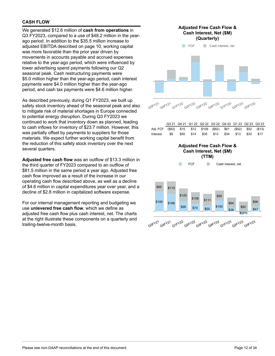 CASH FLOW We generated $12.6 million of cash from operations in Q3 FY2023, compared to a use of $48.2 million in the year- ago period. In addition to the $35.5 million increase to adjusted EBITDA described on page 10, working capital was more favorable than the prior year driven by movements in accounts payable and accrued expenses relative to the year-ago period, which were influenced by lower advertising spend payments following our Q2 seasonal peak. Cash restructuring payments were $5.0 million higher than the year-ago period, cash interest payments were $4.0 million higher than the year-ago period, and cash tax payments were $4.6 million higher. As described previously, during Q1 FY2023, we built up safety stock inventory ahead of the seasonal peak and also to mitigate risk of material shortages in Europe connected to potential energy disruption. During Q3 FY2023 we continued to work that inventory down as planned, leading to cash inflows for inventory of $23.7 million. However, this was partially offset by payments to suppliers for those materials. We expect further working capital benefit from the reduction of this safety stock inventory over the next several quarters. Adjusted free cash flow was an outflow of $13.3 million in the third quarter of FY2023 compared to an outflow of $81.5 million in the same period a year ago. Adjusted free cash flow improved as a result of the increase in our operating cash flow described above, as well as a decline of $4.6 million in capital expenditures year over year, and a decline of $2.8 million in capitalized software expense. For our internal management reporting and budgeting we use unlevered free cash flow, which we define as adjusted free cash flow plus cash interest, net. The charts at the right illustrate these components on a quarterly and trailing-twelve-month basis. Adjusted Free Cash Flow & Cash Interest, Net ($M) (Quarterly) FCF Cash interest, net Q3FY21 Q4FY21 Q1FY22 Q2FY22 Q3FY22 Q4FY22 Q1FY23 Q2FY23 Q3FY23 Q3 21 Q4 21 Q1 22 Q2 22 Q3 22 Q4 22 Q1 23 Q2 23 Q3 23 Adj. FCF ($62) $15 $12 $109 ($82) $61 ($52) $52 ($13) Interest $8 $50 $14 $35 $13 $34 $13 $33 $17 Adjusted Free Cash Flow & Cash Interest, Net ($M) (TTM) $185 $166 $96 $74 $55 $100 $36 $(21) $47 $95 $115 $120 $106 $111 $95 $94 $92 $96 FCF Cash interest, net Q3FY21 Q4FY21 Q1FY22 Q2FY22 Q3FY22 Q4FY22 Q1FY23 Q2FY23 Q3FY23 Please see non-GAAP reconciliations at the end of this document. Page 12 of 34