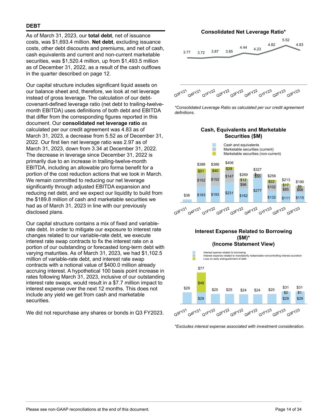 DEBT As of March 31, 2023, our total debt, net of issuance costs, was $1,693.4 million. Net debt, excluding issuance costs, other debt discounts and premiums, and net of cash, cash equivalents and current and non-current marketable securities, was $1,520.4 million, up from $1,493.5 million as of December 31, 2022, as a result of the cash outflows in the quarter described on page 12. Our capital structure includes significant liquid assets on our balance sheet and, therefore, we look at net leverage instead of gross leverage. The calculation of our debt- covenant-defined leverage ratio (net debt to trailing-twelve- month EBITDA) uses definitions of both debt and EBITDA that differ from the corresponding figures reported in this document. Our consolidated net leverage ratio as calculated per our credit agreement was 4.83 as of March 31, 2023, a decrease from 5.52 as of December 31, 2022. Our first lien net leverage ratio was 2.97 as of March 31, 2023, down from 3.34 at December 31, 2022. The decrease in leverage since December 31, 2022 is primarily due to an increase in trailing-twelve-month EBITDA, including an allowable pro forma benefit for a portion of the cost reduction actions that we took in March. We remain committed to reducing our net leverage significantly through adjusted EBITDA expansion and reducing net debt, and we expect our liquidity to build from the $189.8 million of cash and marketable securities we had as of March 31, 2023 in line with our previously disclosed plans. Our capital structure contains a mix of fixed and variable- rate debt. In order to mitigate our exposure to interest rate changes related to our variable-rate debt, we execute interest rate swap contracts to fix the interest rate on a portion of our outstanding or forecasted long-term debt with varying maturities. As of March 31, 2023, we had $1,102.5 million of variable-rate debt, and interest rate swap contracts with a notional value of $400.0 million already accruing interest. A hypothetical 100 basis point increase in rates following March 31, 2023, inclusive of our outstanding interest rate swaps, would result in a $7.7 million impact to interest expense over the next 12 months. This does not include any yield we get from cash and marketable securities. We did not repurchase any shares or bonds in Q3 FY2023. Consolidated Net Leverage Ratio* 3.77 3.72 3.87 3.85 4.44 4.23 4.82 5.52 4.83 Q3FY21 Q4FY21 Q1FY22 Q2FY22 Q3FY22 Q4FY22 Q1FY23 Q2FY23 Q3FY23 *Consolidated Leverage Ratio as calculated per our credit agreement definitions. Cash, Equivalents and Marketable Securities ($M) $36 $386 $386 $406 $269 $327 $256 $213 $190 $183 $193 $231 $162 $277 $132 $111 $115 $152 $152 $147 $96 $50 $102 $85 $68 $51 $40 $28 $12 $— $22 $17 $6 Cash and equivalents Marketable securities (current) Marketable securities (non-current) Q3FY21 Q4FY21 Q1FY22 Q2FY22 Q3FY22 Q4FY22 Q1FY23 Q2FY23 Q3FY23 Interest Expense Related to Borrowing ($M)* (Income Statement View) $29 $25 $25 $24 $24 $25 $31 $31 $77 $29 $29 $29 $2 $1 $48 Interest epense related to borrowing Interest expense related to mandatorily redeemable noncontrolling interest accretion Loss on early extinguishment of debt Q3FY21 Q4FY21 Q1FY22 Q2FY22 Q3FY22 Q4FY22 Q1FY23 Q2FY23 Q3FY23 *Excludes interest expense associated with investment consideration. Please see non-GAAP reconciliations at the end of this document. Page 14 of 34