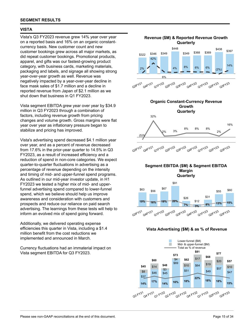 SEGMENT RESULTS VISTA Vista's Q3 FY2023 revenue grew 14% year over year on a reported basis and 16% on an organic constant- currency basis. New customer count and new customer bookings grew across all major markets, as did repeat customer bookings. Promotional products, apparel, and gifts was our fastest-growing product category, with business cards, marketing materials, packaging and labels, and signage all showing strong year-over-year growth as well. Revenue was negatively impacted by a year-over-year decline in face mask sales of $1.7 million and a decline in reported revenue from Japan of $2.1 million as we shut down that business in Q1 FY2023. Vista segment EBITDA grew year over year by $34.9 million in Q3 FY2023 through a combination of factors, including revenue growth from pricing changes and volume growth. Gross margins were flat year over year as inflationary pressure began to stabilize and pricing has improved. Vista's advertising spend decreased $4.1 million year over year, and as a percent of revenue decreased from 17.6% in the prior-year quarter to 14.5% in Q3 FY2023, as a result of increased efficiency and a reduction of spend in non-core categories. We expect quarter-to-quarter fluctuations in advertising as a percentage of revenue depending on the intensity and timing of mid- and upper-funnel spend programs. As outlined in our mid-year investor update, in H1 FY2023 we tested a higher mix of mid- and upper- funnel advertising spend compared to lower-funnel spend, which we believe should help us improve awareness and consideration with customers and prospects and reduce our reliance on paid search advertising. The learnings from these tests will help to inform an evolved mix of spend going forward. Additionally, we delivered operating expense efficiencies this quarter in Vista, including a $1.4 million benefit from the cost reductions we implemented and announced in March. Currency fluctuations had an immaterial impact on Vista segment EBITDA for Q3 FY2023. Revenue ($M) & Reported Revenue Growth Quarterly $322 $346 $349 $448 $349 $368 $369 $438 $397 2% 42% 6% 4% 8% 6% 6% (2%) 14% Q3FY21 Q4FY21 Q1FY22 Q2FY22 Q3FY22 Q4FY22 Q1FY23 Q2FY23 Q3FY23 Organic Constant-Currency Revenue Growth Quarterly (5)% 32% 2% 3% 8% 8% 8% 2% 16% Q3FY21 Q4FY21 Q1FY22 Q2FY22 Q3FY22 Q4FY22 Q1FY23 Q2FY23 Q3FY23 Segment EBITDA ($M) & Segment EBITDA Margin Quarterly $63 $56 $67 $91 $26 $12 $31 $55 $60 19% 16% 19% 20% 7% 3% 8% 13% 15% Q3FY21 Q4FY21 Q1FY22 Q2FY22 Q3FY22 Q4FY22 Q1FY23 Q2FY23 Q3FY23 Vista Advertising ($M) & as % of Revenue $45 $60 $48 $73 $62 $81 $68 $77 $57 $37 $46 $45 $69 $51 $64 $49 $57 $47$8 $14 $3 $4 $10 $17 $19 $20 $10 14% 17% 14% 16% 18% 22% 18% 18% 15% Lower-funnel ($M) Mid- & upper-funnel ($M) Total as % of revenue Q3 FY21 Q4 FY21 Q1 FY22 Q2 FY22 Q3 FY22 Q4 FY22 Q1 FY23 Q2FY23 Q3FY23 Please see non-GAAP reconciliations at the end of this document. Page 15 of 34