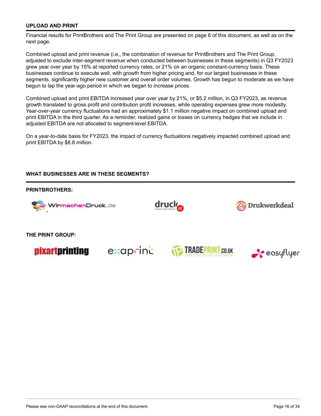 UPLOAD AND PRINT Financial results for PrintBrothers and The Print Group are presented on page 6 of this document, as well as on the next page. Combined upload and print revenue (i.e., the combination of revenue for PrintBrothers and The Print Group, adjusted to exclude inter-segment revenue when conducted between businesses in these segments) in Q3 FY2023 grew year over year by 15% at reported currency rates, or 21% on an organic constant-currency basis. These businesses continue to execute well, with growth from higher pricing and, for our largest businesses in these segments, significantly higher new customer and overall order volumes. Growth has begun to moderate as we have begun to lap the year-ago period in which we began to increase prices. Combined upload and print EBITDA increased year over year by 21%, or $5.2 million, in Q3 FY2023, as revenue growth translated to gross profit and contribution profit increases, while operating expenses grew more modestly. Year-over-year currency fluctuations had an approximately $1.1 million negative impact on combined upload and print EBITDA in the third quarter. As a reminder, realized gains or losses on currency hedges that we include in adjusted EBITDA are not allocated to segment-level EBITDA. On a year-to-date basis for FY2023, the impact of currency fluctuations negatively impacted combined upload and print EBITDA by $8.8 million. WHAT BUSINESSES ARE IN THESE SEGMENTS? PRINTBROTHERS: THE PRINT GROUP: Please see non-GAAP reconciliations at the end of this document. Page 16 of 34