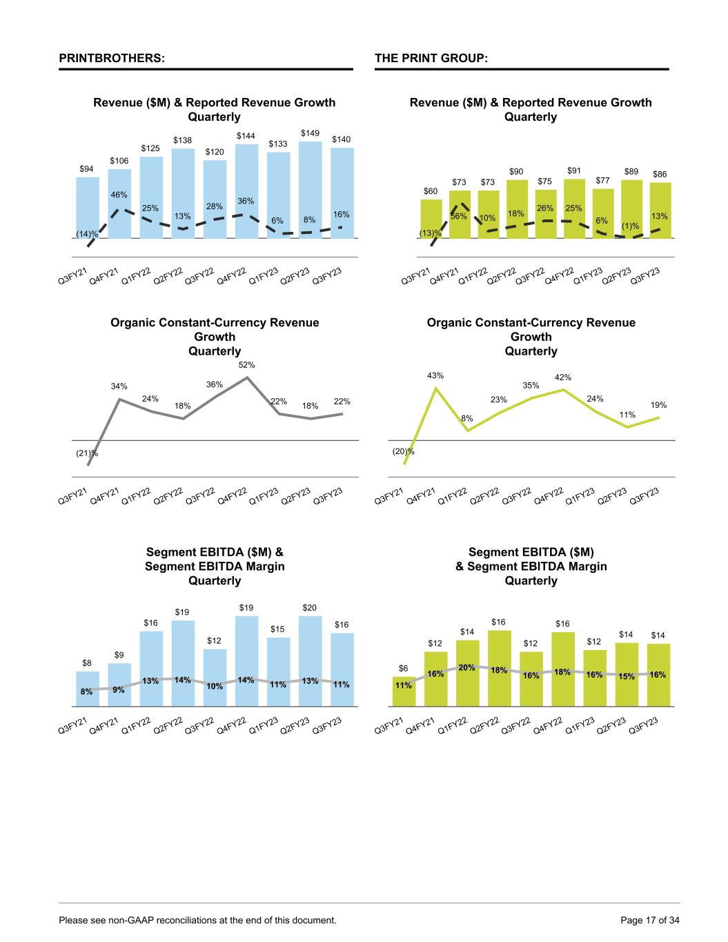 PRINTBROTHERS: Revenue ($M) & Reported Revenue Growth Quarterly $94 $106 $125 $138 $120 $144 $133 $149 $140 (14)% 46% 25% 13% 28% 36% 6% 8% 16% Q3FY21 Q4FY21 Q1FY22 Q2FY22 Q3FY22 Q4FY22 Q1FY23 Q2FY23 Q3FY23 Organic Constant-Currency Revenue Growth Quarterly (21)% 34% 24% 18% 36% 52% 22% 18% 22% Q3FY21 Q4FY21 Q1FY22 Q2FY22 Q3FY22 Q4FY22 Q1FY23 Q2FY23 Q3FY23 Segment EBITDA ($M) & Segment EBITDA Margin Quarterly $8 $9 $16 $19 $12 $19 $15 $20 $16 8% 9% 13% 14% 10% 14% 11% 13% 11% Q3FY21 Q4FY21 Q1FY22 Q2FY22 Q3FY22 Q4FY22 Q1FY23 Q2FY23 Q3FY23 THE PRINT GROUP: Revenue ($M) & Reported Revenue Growth Quarterly $60 $73 $73 $90 $75 $91 $77 $89 $86 (13)% 56% 10% 18% 26% 25% 6% (1)% 13% Q3FY21 Q4FY21 Q1FY22 Q2FY22 Q3FY22 Q4FY22 Q1FY23 Q2FY23 Q3FY23 0 100 Organic Constant-Currency Revenue Growth Quarterly (20)% 43% 8% 23% 35% 42% 24% 11% 19% Q3FY21 Q4FY21 Q1FY22 Q2FY22 Q3FY22 Q4FY22 Q1FY23 Q2FY23 Q3FY23 Segment EBITDA ($M) & Segment EBITDA Margin Quarterly $6 $12 $14 $16 $12 $16 $12 $14 $14 11% 16% 20% 18% 16% 18% 16% 15% 16% Q3FY21 Q4FY21 Q1FY22 Q2FY22 Q3FY22 Q4FY22 Q1FY23 Q2FY23 Q3FY23 Please see non-GAAP reconciliations at the end of this document. Page 17 of 34