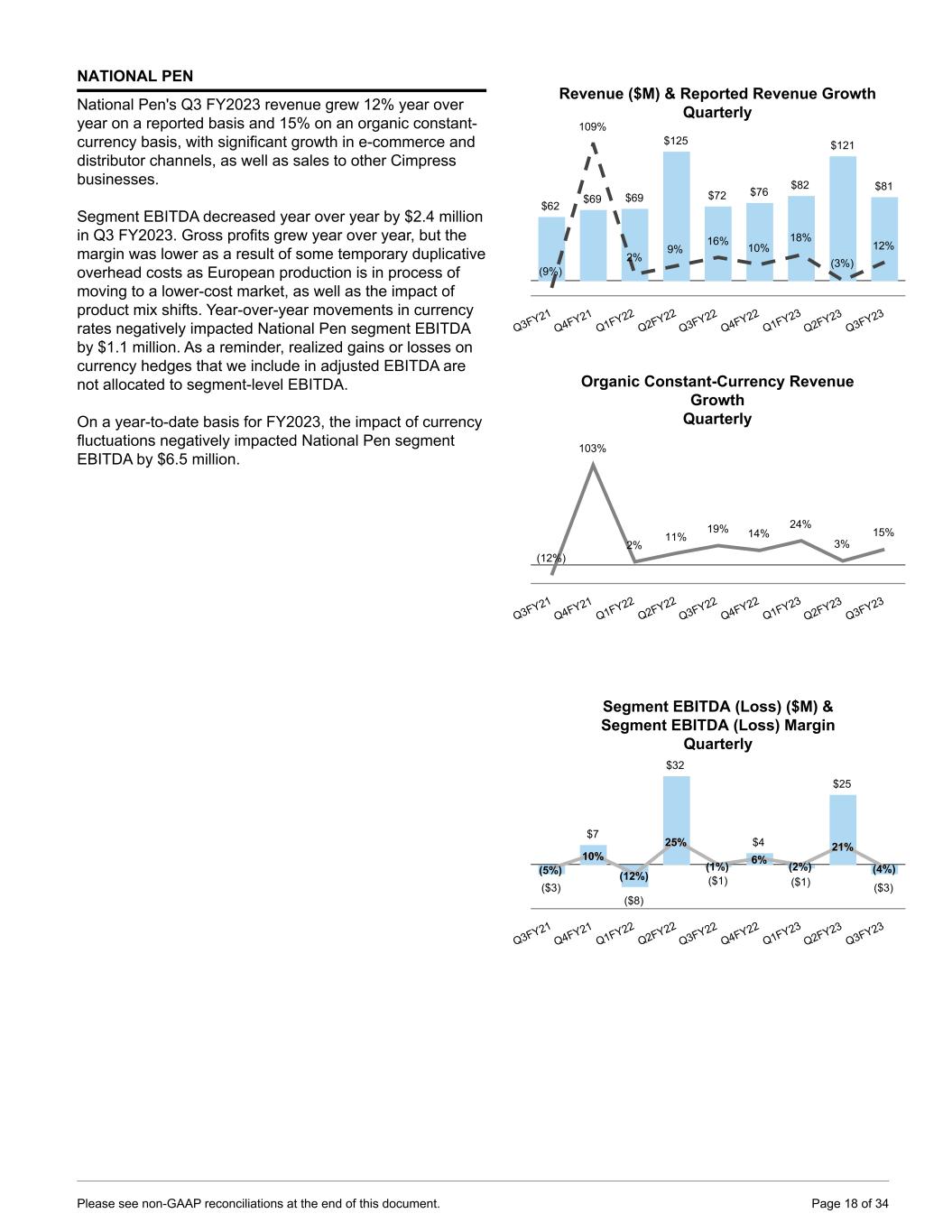 NATIONAL PEN National Pen's Q3 FY2023 revenue grew 12% year over year on a reported basis and 15% on an organic constant- currency basis, with significant growth in e-commerce and distributor channels, as well as sales to other Cimpress businesses. Segment EBITDA decreased year over year by $2.4 million in Q3 FY2023. Gross profits grew year over year, but the margin was lower as a result of some temporary duplicative overhead costs as European production is in process of moving to a lower-cost market, as well as the impact of product mix shifts. Year-over-year movements in currency rates negatively impacted National Pen segment EBITDA by $1.1 million. As a reminder, realized gains or losses on currency hedges that we include in adjusted EBITDA are not allocated to segment-level EBITDA. On a year-to-date basis for FY2023, the impact of currency fluctuations negatively impacted National Pen segment EBITDA by $6.5 million. Revenue ($M) & Reported Revenue Growth Quarterly $62 $69 $69 $125 $72 $76 $82 $121 $81 (9%) 109% 2% 9% 16% 10% 18% (3%) 12% Q3FY21 Q4FY21 Q1FY22 Q2FY22 Q3FY22 Q4FY22 Q1FY23 Q2FY23 Q3FY23 Organic Constant-Currency Revenue Growth Quarterly (12%) 103% 2% 11% 19% 14% 24% 3% 15% Q3FY21 Q4FY21 Q1FY22 Q2FY22 Q3FY22 Q4FY22 Q1FY23 Q2FY23 Q3FY23 Segment EBITDA (Loss) ($M) & Segment EBITDA (Loss) Margin Quarterly ($3) $7 ($8) $32 ($1) $4 ($1) $25 ($3) (5%) 10% (12%) 25% (1%) 6% (2%) 21% (4%) Q3FY21 Q4FY21 Q1FY22 Q2FY22 Q3FY22 Q4FY22 Q1FY23 Q2FY23 Q3FY23 Please see non-GAAP reconciliations at the end of this document. Page 18 of 34
