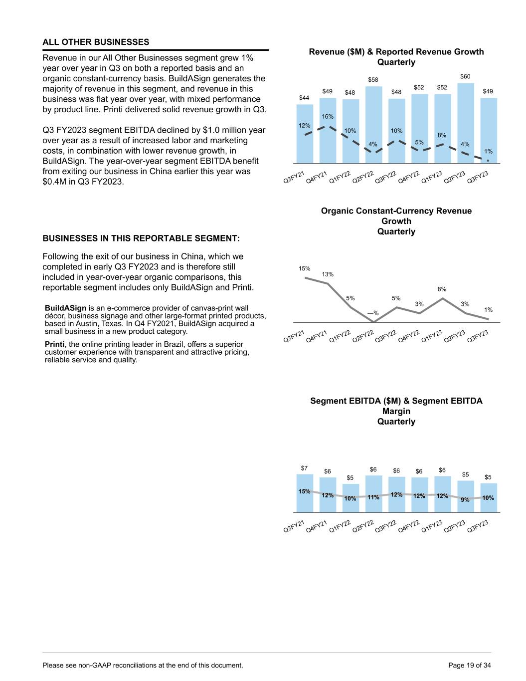 ALL OTHER BUSINESSES Revenue in our All Other Businesses segment grew 1% year over year in Q3 on both a reported basis and an organic constant-currency basis. BuildASign generates the majority of revenue in this segment, and revenue in this business was flat year over year, with mixed performance by product line. Printi delivered solid revenue growth in Q3. Q3 FY2023 segment EBITDA declined by $1.0 million year over year as a result of increased labor and marketing costs, in combination with lower revenue growth, in BuildASign. The year-over-year segment EBITDA benefit from exiting our business in China earlier this year was $0.4M in Q3 FY2023. BUSINESSES IN THIS REPORTABLE SEGMENT: Following the exit of our business in China, which we completed in early Q3 FY2023 and is therefore still included in year-over-year organic comparisons, this reportable segment includes only BuildASign and Printi. BuildASign is an e-commerce provider of canvas-print wall décor, business signage and other large-format printed products, based in Austin, Texas. In Q4 FY2021, BuildASign acquired a small business in a new product category. Printi, the online printing leader in Brazil, offers a superior customer experience with transparent and attractive pricing, reliable service and quality. Revenue ($M) & Reported Revenue Growth Quarterly $44 $49 $48 $58 $48 $52 $52 $60 $49 12% 16% 10% 4% 10% 5% 8% 4% 1% Q3FY21 Q4FY21 Q1FY22 Q2FY22 Q3FY22 Q4FY22 Q1FY23 Q2FY23 Q3FY23 Organic Constant-Currency Revenue Growth Quarterly 15% 13% 5% —% 5% 3% 8% 3% 1% Q3FY21 Q4FY21 Q1FY22 Q2FY22 Q3FY22 Q4FY22 Q1FY23 Q2FY23 Q3FY23 Segment EBITDA ($M) & Segment EBITDA Margin Quarterly $7 $6 $5 $6 $6 $6 $6 $5 $5 15% 12% 10% 11% 12% 12% 12% 9% 10% Q3FY21 Q4FY21 Q1FY22 Q2FY22 Q3FY22 Q4FY22 Q1FY23 Q2FY23 Q3FY23 Please see non-GAAP reconciliations at the end of this document. Page 19 of 34