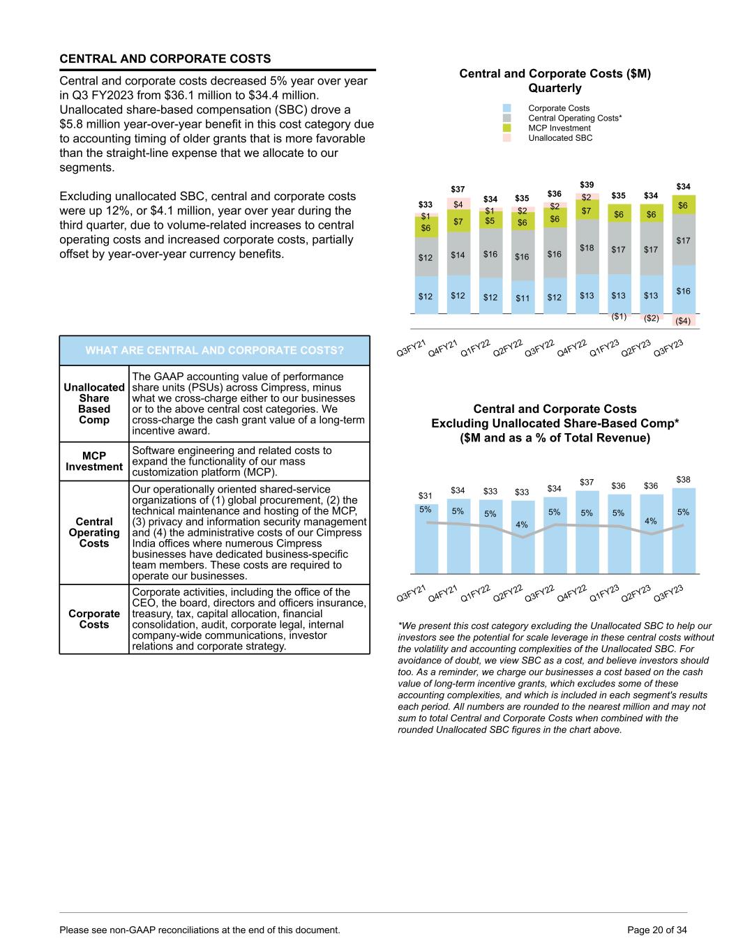 CENTRAL AND CORPORATE COSTS Central and corporate costs decreased 5% year over year in Q3 FY2023 from $36.1 million to $34.4 million. Unallocated share-based compensation (SBC) drove a $5.8 million year-over-year benefit in this cost category due to accounting timing of older grants that is more favorable than the straight-line expense that we allocate to our segments. Excluding unallocated SBC, central and corporate costs were up 12%, or $4.1 million, year over year during the third quarter, due to volume-related increases to central operating costs and increased corporate costs, partially offset by year-over-year currency benefits. WHAT ARE CENTRAL AND CORPORATE COSTS? Unallocated Share Based Comp The GAAP accounting value of performance share units (PSUs) across Cimpress, minus what we cross-charge either to our businesses or to the above central cost categories. We cross-charge the cash grant value of a long-term incentive award. MCP Investment Software engineering and related costs to expand the functionality of our mass customization platform (MCP). Central Operating Costs Our operationally oriented shared-service organizations of (1) global procurement, (2) the technical maintenance and hosting of the MCP, (3) privacy and information security management and (4) the administrative costs of our Cimpress India offices where numerous Cimpress businesses have dedicated business-specific team members. These costs are required to operate our businesses. Corporate Costs Corporate activities, including the office of the CEO, the board, directors and officers insurance, treasury, tax, capital allocation, financial consolidation, audit, corporate legal, internal company-wide communications, investor relations and corporate strategy. Central and Corporate Costs ($M) Quarterly $12 $12 $12 $11 $12 $13 $13 $13 $16 $12 $14 $16 $16 $16 $18 $17 $17 $17 $6 $7 $5 $6 $6 $7 $6 $6 $6 $1 $4 $1 $2 $2 $2 ($1) ($2) ($4) $33 $37 $34 $35 $36 $39 $35 $34 $34 Corporate Costs Central Operating Costs* MCP Investment Unallocated SBC Q3FY21 Q4FY21 Q1FY22 Q2FY22 Q3FY22 Q4FY22 Q1FY23 Q2FY23 Q3FY23 Central and Corporate Costs Excluding Unallocated Share-Based Comp* ($M and as a % of Total Revenue) $31 $34 $33 $33 $34 $37 $36 $36 $38 5% 5% 5% 4% 5% 5% 5% 4% 5% Q3FY21 Q4FY21 Q1FY22 Q2FY22 Q3FY22 Q4FY22 Q1FY23 Q2FY23 Q3FY23 *We present this cost category excluding the Unallocated SBC to help our investors see the potential for scale leverage in these central costs without the volatility and accounting complexities of the Unallocated SBC. For avoidance of doubt, we view SBC as a cost, and believe investors should too. As a reminder, we charge our businesses a cost based on the cash value of long-term incentive grants, which excludes some of these accounting complexities, and which is included in each segment's results each period. All numbers are rounded to the nearest million and may not sum to total Central and Corporate Costs when combined with the rounded Unallocated SBC figures in the chart above. Please see non-GAAP reconciliations at the end of this document. Page 20 of 34