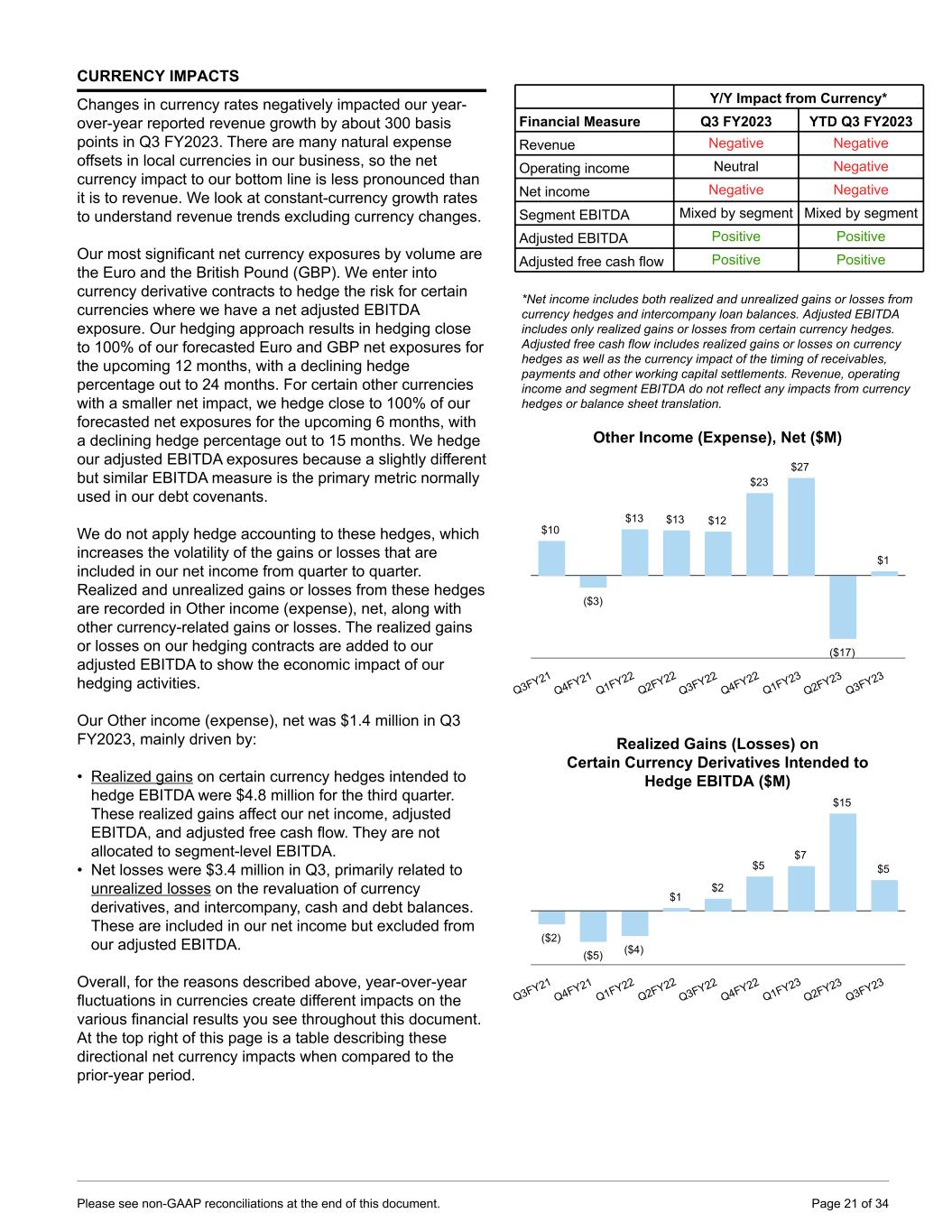 CURRENCY IMPACTS Changes in currency rates negatively impacted our year- over-year reported revenue growth by about 300 basis points in Q3 FY2023. There are many natural expense offsets in local currencies in our business, so the net currency impact to our bottom line is less pronounced than it is to revenue. We look at constant-currency growth rates to understand revenue trends excluding currency changes. Our most significant net currency exposures by volume are the Euro and the British Pound (GBP). We enter into currency derivative contracts to hedge the risk for certain currencies where we have a net adjusted EBITDA exposure. Our hedging approach results in hedging close to 100% of our forecasted Euro and GBP net exposures for the upcoming 12 months, with a declining hedge percentage out to 24 months. For certain other currencies with a smaller net impact, we hedge close to 100% of our forecasted net exposures for the upcoming 6 months, with a declining hedge percentage out to 15 months. We hedge our adjusted EBITDA exposures because a slightly different but similar EBITDA measure is the primary metric normally used in our debt covenants. We do not apply hedge accounting to these hedges, which increases the volatility of the gains or losses that are included in our net income from quarter to quarter. Realized and unrealized gains or losses from these hedges are recorded in Other income (expense), net, along with other currency-related gains or losses. The realized gains or losses on our hedging contracts are added to our adjusted EBITDA to show the economic impact of our hedging activities. Our Other income (expense), net was $1.4 million in Q3 FY2023, mainly driven by: • Realized gains on certain currency hedges intended to hedge EBITDA were $4.8 million for the third quarter. These realized gains affect our net income, adjusted EBITDA, and adjusted free cash flow. They are not allocated to segment-level EBITDA. • Net losses were $3.4 million in Q3, primarily related to unrealized losses on the revaluation of currency derivatives, and intercompany, cash and debt balances. These are included in our net income but excluded from our adjusted EBITDA. Overall, for the reasons described above, year-over-year fluctuations in currencies create different impacts on the various financial results you see throughout this document. At the top right of this page is a table describing these directional net currency impacts when compared to the prior-year period. Y/Y Impact from Currency* Financial Measure Q3 FY2023 YTD Q3 FY2023 Revenue Negative Negative Operating income Neutral Negative Net income Negative Negative Segment EBITDA Mixed by segment Mixed by segment Adjusted EBITDA Positive Positive Adjusted free cash flow Positive Positive *Net income includes both realized and unrealized gains or losses from currency hedges and intercompany loan balances. Adjusted EBITDA includes only realized gains or losses from certain currency hedges. Adjusted free cash flow includes realized gains or losses on currency hedges as well as the currency impact of the timing of receivables, payments and other working capital settlements. Revenue, operating income and segment EBITDA do not reflect any impacts from currency hedges or balance sheet translation. Other Income (Expense), Net ($M) $10 ($3) $13 $13 $12 $23 $27 ($17) $1 Q3FY21 Q4FY21 Q1FY22 Q2FY22 Q3FY22 Q4FY22 Q1FY23 Q2FY23 Q3FY23 Realized Gains (Losses) on Certain Currency Derivatives Intended to Hedge EBITDA ($M) ($2) ($5) ($4) $1 $2 $5 $7 $15 $5 Q3FY21 Q4FY21 Q1FY22 Q2FY22 Q3FY22 Q4FY22 Q1FY23 Q2FY23 Q3FY23 Please see non-GAAP reconciliations at the end of this document. Page 21 of 34