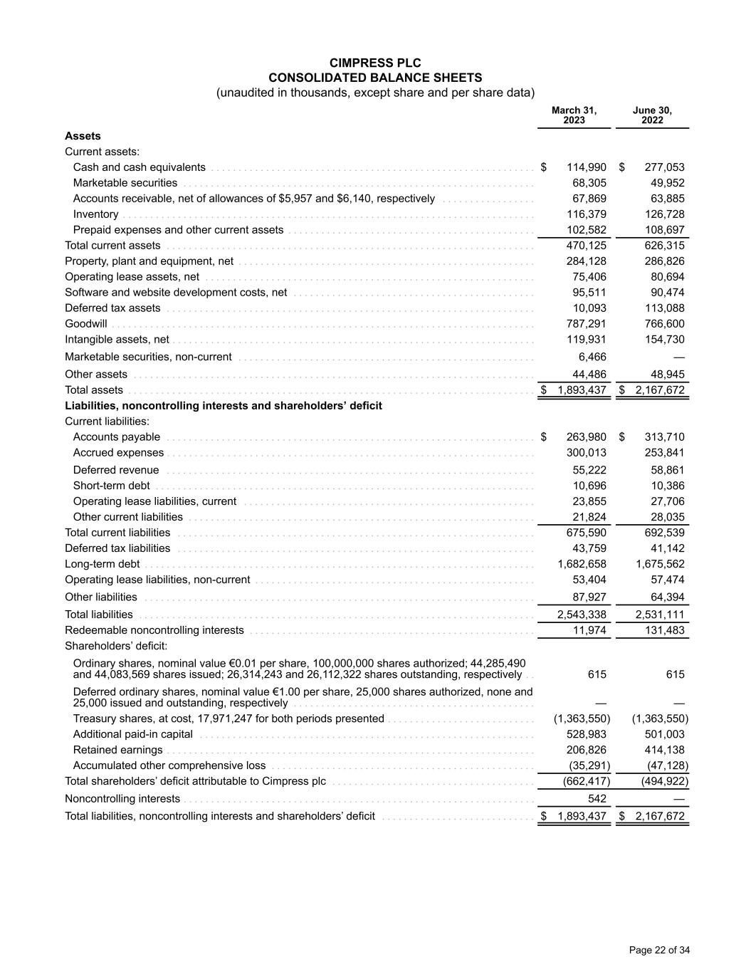 CIMPRESS PLC CONSOLIDATED BALANCE SHEETS (unaudited in thousands, except share and per share data) March 31, 2023 June 30, 2022 Assets Current assets: Cash and cash equivalents . . . . . . . . . . . . . . . . . . . . . . . . . . . . . . . . . . . . . . . . . . . . . . . . . . . . . . . . . . . $ 114,990 $ 277,053 Marketable securities . . . . . . . . . . . . . . . . . . . . . . . . . . . . . . . . . . . . . . . . . . . . . . . . . . . . . . . . . . . . . . . . 68,305 49,952 Accounts receivable, net of allowances of $5,957 and $6,140, respectively . . . . . . . . . . . . . . . . . 67,869 63,885 Inventory . . . . . . . . . . . . . . . . . . . . . . . . . . . . . . . . . . . . . . . . . . . . . . . . . . . . . . . . . . . . . . . . . . . . . . . . . . . 116,379 126,728 Prepaid expenses and other current assets . . . . . . . . . . . . . . . . . . . . . . . . . . . . . . . . . . . . . . . . . . . . . 102,582 108,697 Total current assets . . . . . . . . . . . . . . . . . . . . . . . . . . . . . . . . . . . . . . . . . . . . . . . . . . . . . . . . . . . . . . . . . . . 470,125 626,315 Property, plant and equipment, net . . . . . . . . . . . . . . . . . . . . . . . . . . . . . . . . . . . . . . . . . . . . . . . . . . . . . . 284,128 286,826 Operating lease assets, net . . . . . . . . . . . . . . . . . . . . . . . . . . . . . . . . . . . . . . . . . . . . . . . . . . . . . . . . . . . . 75,406 80,694 Software and website development costs, net . . . . . . . . . . . . . . . . . . . . . . . . . . . . . . . . . . . . . . . . . . . . 95,511 90,474 Deferred tax assets . . . . . . . . . . . . . . . . . . . . . . . . . . . . . . . . . . . . . . . . . . . . . . . . . . . . . . . . . . . . . . . . . . . 10,093 113,088 Goodwill . . . . . . . . . . . . . . . . . . . . . . . . . . . . . . . . . . . . . . . . . . . . . . . . . . . . . . . . . . . . . . . . . . . . . . . . . . . . . 787,291 766,600 Intangible assets, net . . . . . . . . . . . . . . . . . . . . . . . . . . . . . . . . . . . . . . . . . . . . . . . . . . . . . . . . . . . . . . . . . . 119,931 154,730 Marketable securities, non-current . . . . . . . . . . . . . . . . . . . . . . . . . . . . . . . . . . . . . . . . . . . . . . . . . . . . . . 6,466 — Other assets . . . . . . . . . . . . . . . . . . . . . . . . . . . . . . . . . . . . . . . . . . . . . . . . . . . . . . . . . . . . . . . . . . . . . . . . . 44,486 48,945 Total assets . . . . . . . . . . . . . . . . . . . . . . . . . . . . . . . . . . . . . . . . . . . . . . . . . . . . . . . . . . . . . . . . . . . . . . . . . . $ 1,893,437 $ 2,167,672 Liabilities, noncontrolling interests and shareholders’ deficit Current liabilities: Accounts payable . . . . . . . . . . . . . . . . . . . . . . . . . . . . . . . . . . . . . . . . . . . . . . . . . . . . . . . . . . . . . . . . . . . $ 263,980 $ 313,710 Accrued expenses . . . . . . . . . . . . . . . . . . . . . . . . . . . . . . . . . . . . . . . . . . . . . . . . . . . . . . . . . . . . . . . . . . . 300,013 253,841 Deferred revenue . . . . . . . . . . . . . . . . . . . . . . . . . . . . . . . . . . . . . . . . . . . . . . . . . . . . . . . . . . . . . . . . . . . 55,222 58,861 Short-term debt . . . . . . . . . . . . . . . . . . . . . . . . . . . . . . . . . . . . . . . . . . . . . . . . . . . . . . . . . . . . . . . . . . . . . 10,696 10,386 Operating lease liabilities, current . . . . . . . . . . . . . . . . . . . . . . . . . . . . . . . . . . . . . . . . . . . . . . . . . . . . . 23,855 27,706 Other current liabilities . . . . . . . . . . . . . . . . . . . . . . . . . . . . . . . . . . . . . . . . . . . . . . . . . . . . . . . . . . . . . . . 21,824 28,035 Total current liabilities . . . . . . . . . . . . . . . . . . . . . . . . . . . . . . . . . . . . . . . . . . . . . . . . . . . . . . . . . . . . . . . . . 675,590 692,539 Deferred tax liabilities . . . . . . . . . . . . . . . . . . . . . . . . . . . . . . . . . . . . . . . . . . . . . . . . . . . . . . . . . . . . . . . . . 43,759 41,142 Long-term debt . . . . . . . . . . . . . . . . . . . . . . . . . . . . . . . . . . . . . . . . . . . . . . . . . . . . . . . . . . . . . . . . . . . . . . . 1,682,658 1,675,562 Operating lease liabilities, non-current . . . . . . . . . . . . . . . . . . . . . . . . . . . . . . . . . . . . . . . . . . . . . . . . . . . 53,404 57,474 Other liabilities . . . . . . . . . . . . . . . . . . . . . . . . . . . . . . . . . . . . . . . . . . . . . . . . . . . . . . . . . . . . . . . . . . . . . . . 87,927 64,394 Total liabilities . . . . . . . . . . . . . . . . . . . . . . . . . . . . . . . . . . . . . . . . . . . . . . . . . . . . . . . . . . . . . . . . . . . . . . . . 2,543,338 2,531,111 Redeemable noncontrolling interests . . . . . . . . . . . . . . . . . . . . . . . . . . . . . . . . . . . . . . . . . . . . . . . . . . . . 11,974 131,483 Shareholders’ deficit: Ordinary shares, nominal value €0.01 per share, 100,000,000 shares authorized; 44,285,490 and 44,083,569 shares issued; 26,314,243 and 26,112,322 shares outstanding, respectively . . 615 615 Deferred ordinary shares, nominal value €1.00 per share, 25,000 shares authorized, none and 25,000 issued and outstanding, respectively . . . . . . . . . . . . . . . . . . . . . . . . . . . . . . . . . . . . . . . . . . . . — — Treasury shares, at cost, 17,971,247 for both periods presented . . . . . . . . . . . . . . . . . . . . . . . . . . . (1,363,550) (1,363,550) Additional paid-in capital . . . . . . . . . . . . . . . . . . . . . . . . . . . . . . . . . . . . . . . . . . . . . . . . . . . . . . . . . . . . . 528,983 501,003 Retained earnings . . . . . . . . . . . . . . . . . . . . . . . . . . . . . . . . . . . . . . . . . . . . . . . . . . . . . . . . . . . . . . . . . . . 206,826 414,138 Accumulated other comprehensive loss . . . . . . . . . . . . . . . . . . . . . . . . . . . . . . . . . . . . . . . . . . . . . . . . (35,291) (47,128) Total shareholders’ deficit attributable to Cimpress plc . .