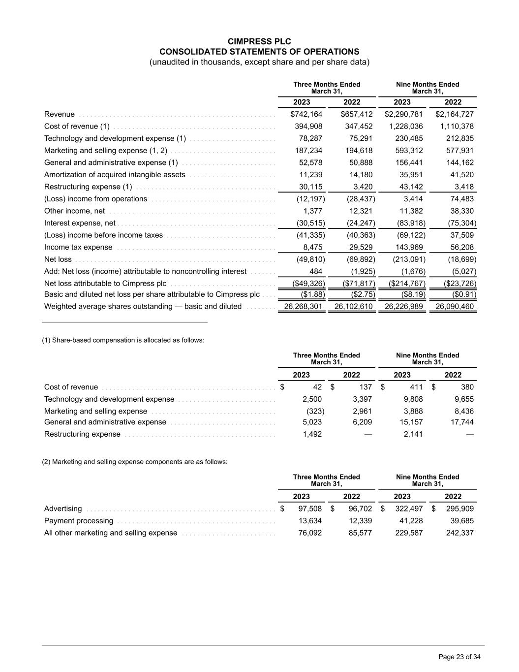 CIMPRESS PLC CONSOLIDATED STATEMENTS OF OPERATIONS (unaudited in thousands, except share and per share data) Three Months Ended March 31, Nine Months Ended March 31, 2023 2022 2023 2022 Revenue . . . . . . . . . . . . . . . . . . . . . . . . . . . . . . . . . . . . . . . . . . . . . . . . . . . . $742,164 $657,412 $2,290,781 $2,164,727 Cost of revenue (1) . . . . . . . . . . . . . . . . . . . . . . . . . . . . . . . . . . . . . . . . . . . 394,908 347,452 1,228,036 1,110,378 Technology and development expense (1) . . . . . . . . . . . . . . . . . . . . . . . 78,287 75,291 230,485 212,835 Marketing and selling expense (1, 2) . . . . . . . . . . . . . . . . . . . . . . . . . . . . 187,234 194,618 593,312 577,931 General and administrative expense (1) . . . . . . . . . . . . . . . . . . . . . . . . . 52,578 50,888 156,441 144,162 Amortization of acquired intangible assets . . . . . . . . . . . . . . . . . . . . . . . 11,239 14,180 35,951 41,520 Restructuring expense (1) . . . . . . . . . . . . . . . . . . . . . . . . . . . . . . . . . . . . . 30,115 3,420 43,142 3,418 (Loss) income from operations . . . . . . . . . . . . . . . . . . . . . . . . . . . . . . . . . (12,197) (28,437) 3,414 74,483 Other income, net . . . . . . . . . . . . . . . . . . . . . . . . . . . . . . . . . . . . . . . . . . . . 1,377 12,321 11,382 38,330 Interest expense, net . . . . . . . . . . . . . . . . . . . . . . . . . . . . . . . . . . . . . . . . . . (30,515) (24,247) (83,918) (75,304) (Loss) income before income taxes . . . . . . . . . . . . . . . . . . . . . . . . . . . . . (41,335) (40,363) (69,122) 37,509 Income tax expense . . . . . . . . . . . . . . . . . . . . . . . . . . . . . . . . . . . . . . . . . . 8,475 29,529 143,969 56,208 Net loss . . . . . . . . . . . . . . . . . . . . . . . . . . . . . . . . . . . . . . . . . . . . . . . . . . . . . (49,810) (69,892) (213,091) (18,699) Add: Net loss (income) attributable to noncontrolling interest . . . . . . . 484 (1,925) (1,676) (5,027) Net loss attributable to Cimpress plc . . . . . . . . . . . . . . . . . . . . . . . . . . . . ($49,326) ($71,817) ($214,767) ($23,726) Basic and diluted net loss per share attributable to Cimpress plc . . . . ($1.88) ($2.75) ($8.19) ($0.91) Weighted average shares outstanding — basic and diluted . . . . . . . . 26,268,301 26,102,610 26,226,989 26,090,460 ____________________________________________ (1) Share-based compensation is allocated as follows: Three Months Ended March 31, Nine Months Ended March 31, 2023 2022 2023 2022 Cost of revenue . . . . . . . . . . . . . . . . . . . . . . . . . . . . . . . . . . . . . . . . . . . . . . $ 42 $ 137 $ 411 $ 380 Technology and development expense . . . . . . . . . . . . . . . . . . . . . . . . . . 2,500 3,397 9,808 9,655 Marketing and selling expense . . . . . . . . . . . . . . . . . . . . . . . . . . . . . . . . . (323) 2,961 3,888 8,436 General and administrative expense . . . . . . . . . . . . . . . . . . . . . . . . . . . . 5,023 6,209 15,157 17,744 Restructuring expense . . . . . . . . . . . . . . . . . . . . . . . . . . . . . . . . . . . . . . . . 1,492 — 2,141 — (2) Marketing and selling expense components are as follows: Three Months Ended March 31, Nine Months Ended March 31, 2023 2022 2023 2022 Advertising . . . . . . . . . . . . . . . . . . . . . . . . . . . . . . . . . . . . . . . . . . . . . . . . . . $ 97,508 $ 96,702 $ 322,497 $ 295,909 Payment processing . . . . . . . . . . . . . . . . . . . . . . . . . . . . . . . . . . . . . . . . . . 13,634 12,339 41,228 39,685 All other marketing and selling expense . . . . . . . . . . . . . . . . . . . . . . . . . 76,092 85,577 229,587 242,337 Page 23 of 34