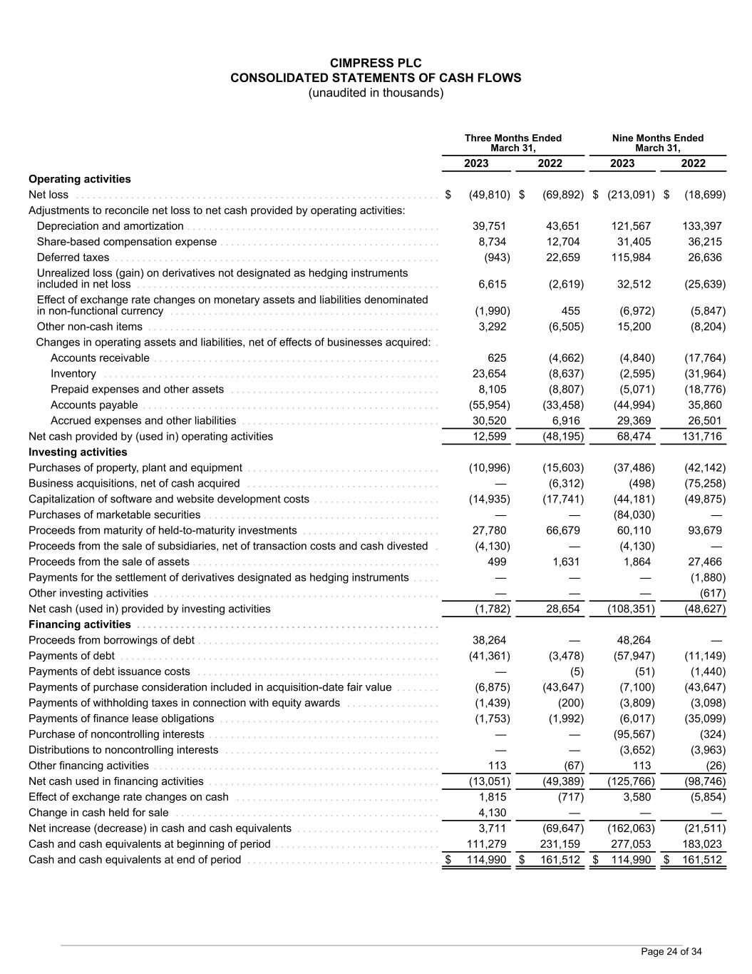 CIMPRESS PLC CONSOLIDATED STATEMENTS OF CASH FLOWS (unaudited in thousands) Three Months Ended March 31, Nine Months Ended March 31, 2023 2022 2023 2022 Operating activities Net loss . . . . . . . . . . . . . . . . . . . . . . . . . . . . . . . . . . . . . . . . . . . . . . . . . . . . . . . . . . . . . . . . . . $ (49,810) $ (69,892) $ (213,091) $ (18,699) Adjustments to reconcile net loss to net cash provided by operating activities: Depreciation and amortization . . . . . . . . . . . . . . . . . . . . . . . . . . . . . . . . . . . . . . . . . . . . . . 39,751 43,651 121,567 133,397 Share-based compensation expense . . . . . . . . . . . . . . . . . . . . . . . . . . . . . . . . . . . . . . . . 8,734 12,704 31,405 36,215 Deferred taxes . . . . . . . . . . . . . . . . . . . . . . . . . . . . . . . . . . . . . . . . . . . . . . . . . . . . . . . . . . . (943) 22,659 115,984 26,636 Unrealized loss (gain) on derivatives not designated as hedging instruments included in net loss . . . . . . . . . . . . . . . . . . . . . . . . . . . . . . . . . . . . . . . . . . . . . . . . . . . . . . . 6,615 (2,619) 32,512 (25,639) Effect of exchange rate changes on monetary assets and liabilities denominated in non-functional currency . . . . . . . . . . . . . . . . . . . . . . . . . . . . . . . . . . . . . . . . . . . . . . . . . (1,990) 455 (6,972) (5,847) Other non-cash items . . . . . . . . . . . . . . . . . . . . . . . . . . . . . . . . . . . . . . . . . . . . . . . . . . . . . 3,292 (6,505) 15,200 (8,204) Changes in operating assets and liabilities, net of effects of businesses acquired: . Accounts receivable . . . . . . . . . . . . . . . . . . . . . . . . . . . . . . . . . . . . . . . . . . . . . . . . . . . . 625 (4,662) (4,840) (17,764) Inventory . . . . . . . . . . . . . . . . . . . . . . . . . . . . . . . . . . . . . . . . . . . . . . . . . . . . . . . . . . . . . 23,654 (8,637) (2,595) (31,964) Prepaid expenses and other assets . . . . . . . . . . . . . . . . . . . . . . . . . . . . . . . . . . . . . . 8,105 (8,807) (5,071) (18,776) Accounts payable . . . . . . . . . . . . . . . . . . . . . . . . . . . . . . . . . . . . . . . . . . . . . . . . . . . . . . (55,954) (33,458) (44,994) 35,860 Accrued expenses and other liabilities . . . . . . . . . . . . . . . . . . . . . . . . . . . . . . . . . . . . 30,520 6,916 29,369 26,501 Net cash provided by (used in) operating activities 12,599 (48,195) 68,474 131,716 Investing activities Purchases of property, plant and equipment . . . . . . . . . . . . . . . . . . . . . . . . . . . . . . . . . . . (10,996) (15,603) (37,486) (42,142) Business acquisitions, net of cash acquired . . . . . . . . . . . . . . . . . . . . . . . . . . . . . . . . . . . — (6,312) (498) (75,258) Capitalization of software and website development costs . . . . . . . . . . . . . . . . . . . . . . . (14,935) (17,741) (44,181) (49,875) Purchases of marketable securities . . . . . . . . . . . . . . . . . . . . . . . . . . . . . . . . . . . . . . . . . . . — — (84,030) — Proceeds from maturity of held-to-maturity investments . . . . . . . . . . . . . . . . . . . . . . . . . 27,780 66,679 60,110 93,679 Proceeds from the sale of subsidiaries, net of transaction costs and cash divested . (4,130) — (4,130) — Proceeds from the sale of assets . . . . . . . . . . . . . . . . . . . . . . . . . . . . . . . . . . . . . . . . . . . . . 499 1,631 1,864 27,466 Payments for the settlement of derivatives designated as hedging instruments . . . . . — — — (1,880) Other investing activities . . . . . . . . . . . . . . . . . . . . . . . . . . . . . . . . . . . . . . . . . . . . . . . . . . . . — — — (617) Net cash (used in) provided by investing activities (1,782) 28,654 (108,351) (48,627) Financing activities . . . . . . . . . . . . . . . . . . . . . . . . . . . . . . . . . . . . . . . . . . . . . . . . . . . . . . . Proceeds from borrowings of debt . . . . . . . . . . . . . . . . . . . . . . . . . . . . . . . . . . . . . . . . . . . . 38,264 — 48,264 — Payments of debt . . . . . . . . . . . . . . . . . . . . . . . . . . . . . . . . . . . . . . . . . . . . . . . . . . . . . . . . . . (41,361) (3,478) (57,947) (11,149) Payments of debt issuance costs . . . . . . . . . . . . . . . . . . . . . . . . . . . . . . . . . . . . . . . . . . . . — (5) (51) (1,440) Payments of purchase consideration included in acquisition-date fair value . . . . . . . . (6,875) (43,647) (7,100) (43,647) Payments of withholding taxes in connection with equity awards . . . . . . . . . . . . . . . . . (1,439) (200) (3,809) (3,098) Payments of finance lease obligations . . . . . . . . . . . . . . . . . . . . . . . . . . . . . . . . . . . . . . . . (1,753) (1,992) (6,017) (35,099) Purchase of noncontrolling interests . . . . . . . . . . . . . . . . . . . . . . . . . . . . . . . . . . . . . . . . . . — — (95,567) (324) Distributions to noncontrolling interests . . . . . . . . . . . . . . . . . . . . . . . . . . . . . . . . . . . . . . . — — (3,652) (3,963) Other financing activities . . . . . . . . . . . . . . . . . . . . . . . . . . . . . . . . . . . . . . . . . . . . . . . . . . . . 113 (67) 113 (26) Net cash used in financing activities . . . . . . . . . . . . . . . . . . . . . . . . . . . . . . . . . . . . . . . . . . (13,051) (49,389) (125,766) (98,746) Effect of exchange rate changes on cash . . . . . . . . . . . . . . . . . . . . . . . . . . . . . . . . . . . . . 1,815 (717) 3,580 (5,854) Change in cash held for sale . . . . . . . . . . . . . . . . . . . . . . . . . . . . . . . . . . . . . . . . . . . . . . . . 4,130 — — — Net increase (decrease) in cash and cash equivalents . . . . . . . . . . . . . . . . . . . . . . . . . . 3,711 (69,647) (162,063) (21,511) Cash and cash equivalents at beginning of period . . . . . . . . . . . . . . . . . . . . . . . . . . . . . . 111,279 231,159 277,053 183,023 Cash and cash equivalents at end of period . . . . . . . . . . . . . . . . . . . . . . . . 