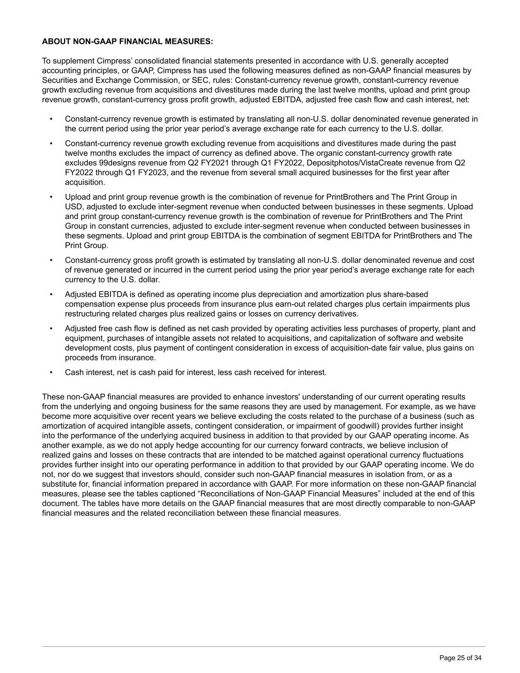ABOUT NON-GAAP FINANCIAL MEASURES: To supplement Cimpress’ consolidated financial statements presented in accordance with U.S. generally accepted accounting principles, or GAAP, Cimpress has used the following measures defined as non-GAAP financial measures by Securities and Exchange Commission, or SEC, rules: Constant-currency revenue growth, constant-currency revenue growth excluding revenue from acquisitions and divestitures made during the last twelve months, upload and print group revenue growth, constant-currency gross profit growth, adjusted EBITDA, adjusted free cash flow and cash interest, net: • Constant-currency revenue growth is estimated by translating all non-U.S. dollar denominated revenue generated in the current period using the prior year period’s average exchange rate for each currency to the U.S. dollar. • Constant-currency revenue growth excluding revenue from acquisitions and divestitures made during the past twelve months excludes the impact of currency as defined above. The organic constant-currency growth rate excludes 99designs revenue from Q2 FY2021 through Q1 FY2022, Depositphotos/VistaCreate revenue from Q2 FY2022 through Q1 FY2023, and the revenue from several small acquired businesses for the first year after acquisition. • Upload and print group revenue growth is the combination of revenue for PrintBrothers and The Print Group in USD, adjusted to exclude inter-segment revenue when conducted between businesses in these segments. Upload and print group constant-currency revenue growth is the combination of revenue for PrintBrothers and The Print Group in constant currencies, adjusted to exclude inter-segment revenue when conducted between businesses in these segments. Upload and print group EBITDA is the combination of segment EBITDA for PrintBrothers and The Print Group. • Constant-currency gross profit growth is estimated by translating all non-U.S. dollar denominated revenue and cost of revenue generated or incurred in the current period using the prior year period’s average exchange rate for each currency to the U.S. dollar. • Adjusted EBITDA is defined as operating income plus depreciation and amortization plus share-based compensation expense plus proceeds from insurance plus earn-out related charges plus certain impairments plus restructuring related charges plus realized gains or losses on currency derivatives. • Adjusted free cash flow is defined as net cash provided by operating activities less purchases of property, plant and equipment, purchases of intangible assets not related to acquisitions, and capitalization of software and website development costs, plus payment of contingent consideration in excess of acquisition-date fair value, plus gains on proceeds from insurance. • Cash interest, net is cash paid for interest, less cash received for interest. These non-GAAP financial measures are provided to enhance investors' understanding of our current operating results from the underlying and ongoing business for the same reasons they are used by management. For example, as we have become more acquisitive over recent years we believe excluding the costs related to the purchase of a business (such as amortization of acquired intangible assets, contingent consideration, or impairment of goodwill) provides further insight into the performance of the underlying acquired business in addition to that provided by our GAAP operating income. As another example, as we do not apply hedge accounting for our currency forward contracts, we believe inclusion of realized gains and losses on these contracts that are intended to be matched against operational currency fluctuations provides further insight into our operating performance in addition to that provided by our GAAP operating income. We do not, nor do we suggest that investors should, consider such non-GAAP financial measures in isolation from, or as a substitute for, financial information prepared in accordance with GAAP. For more information on these non-GAAP financial measures, please see the tables captioned “Reconciliations of Non-GAAP Financial Measures” included at the end of this document. The tables have more details on the GAAP financial measures that are most directly comparable to non-GAAP financial measures and the related reconciliation between these financial measures. Page 25 of 34
