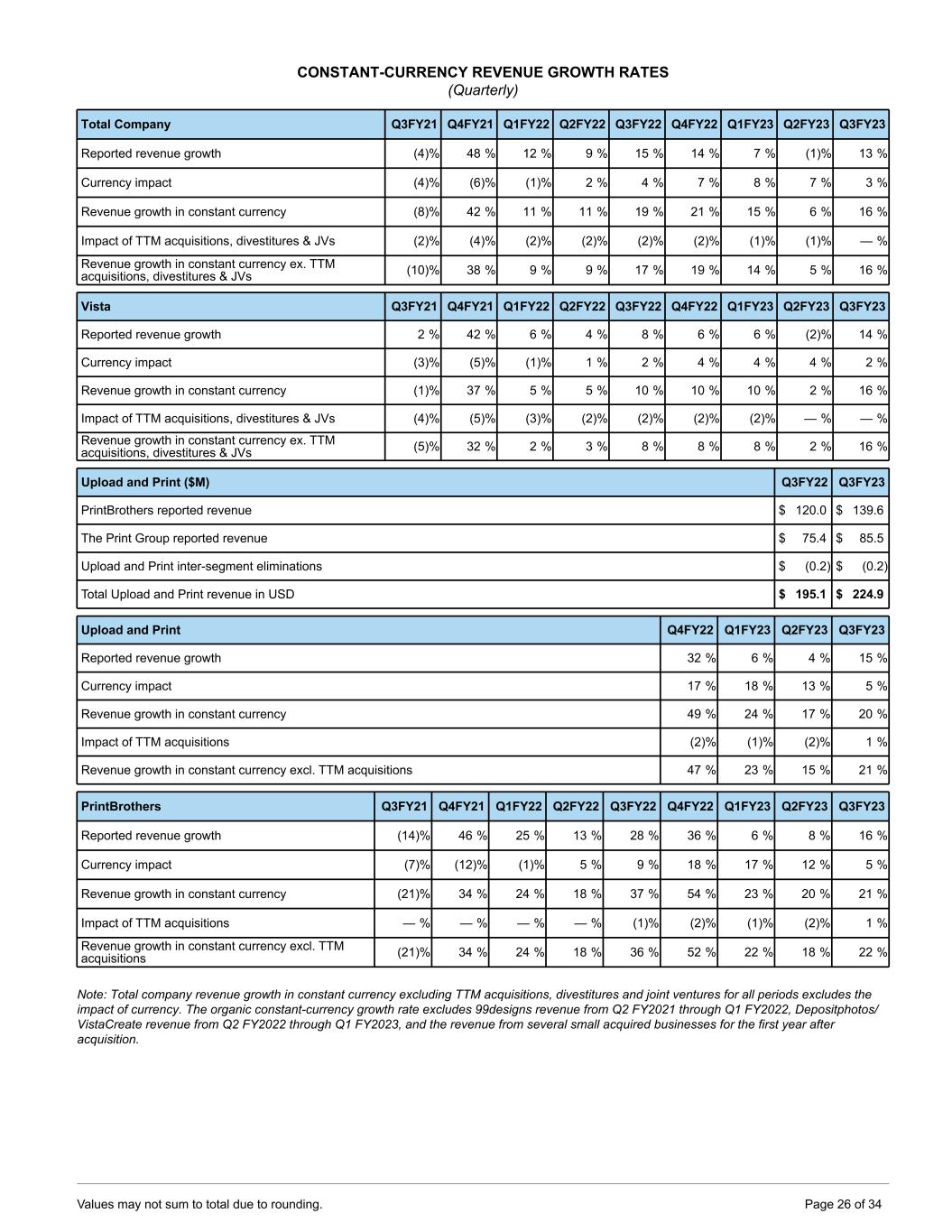 CONSTANT-CURRENCY REVENUE GROWTH RATES (Quarterly) Total Company Q3FY21 Q4FY21 Q1FY22 Q2FY22 Q3FY22 Q4FY22 Q1FY23 Q2FY23 Q3FY23 Reported revenue growth (4) % 48 % 12 % 9 % 15 % 14 % 7 % (1) % 13 % Currency impact (4) % (6) % (1) % 2 % 4 % 7 % 8 % 7 % 3 % Revenue growth in constant currency (8) % 42 % 11 % 11 % 19 % 21 % 15 % 6 % 16 % Impact of TTM acquisitions, divestitures & JVs (2) % (4) % (2) % (2) % (2) % (2) % (1) % (1) % — % Revenue growth in constant currency ex. TTM acquisitions, divestitures & JVs (10) % 38 % 9 % 9 % 17 % 19 % 14 % 5 % 16 % Vista Q3FY21 Q4FY21 Q1FY22 Q2FY22 Q3FY22 Q4FY22 Q1FY23 Q2FY23 Q3FY23 Reported revenue growth 2 % 42 % 6 % 4 % 8 % 6 % 6 % (2) % 14 % Currency impact (3) % (5) % (1) % 1 % 2 % 4 % 4 % 4 % 2 % Revenue growth in constant currency (1) % 37 % 5 % 5 % 10 % 10 % 10 % 2 % 16 % Impact of TTM acquisitions, divestitures & JVs (4) % (5) % (3) % (2) % (2) % (2) % (2) % — % — % Revenue growth in constant currency ex. TTM acquisitions, divestitures & JVs (5) % 32 % 2 % 3 % 8 % 8 % 8 % 2 % 16 % Upload and Print ($M) Q3FY22 Q3FY23 PrintBrothers reported revenue $ 120.0 $ 139.6 The Print Group reported revenue $ 75.4 $ 85.5 Upload and Print inter-segment eliminations $ (0.2) $ (0.2) Total Upload and Print revenue in USD $ 195.1 $ 224.9 Upload and Print Q4FY22 Q1FY23 Q2FY23 Q3FY23 Reported revenue growth 32 % 6 % 4 % 15 % Currency impact 17 % 18 % 13 % 5 % Revenue growth in constant currency 49 % 24 % 17 % 20 % Impact of TTM acquisitions (2) % (1) % (2) % 1 % Revenue growth in constant currency excl. TTM acquisitions 47 % 23 % 15 % 21 % PrintBrothers Q3FY21 Q4FY21 Q1FY22 Q2FY22 Q3FY22 Q4FY22 Q1FY23 Q2FY23 Q3FY23 Reported revenue growth (14) % 46 % 25 % 13 % 28 % 36 % 6 % 8 % 16 % Currency impact (7) % (12) % (1) % 5 % 9 % 18 % 17 % 12 % 5 % Revenue growth in constant currency (21) % 34 % 24 % 18 % 37 % 54 % 23 % 20 % 21 % Impact of TTM acquisitions — % — % — % — % (1) % (2) % (1) % (2) % 1 % Revenue growth in constant currency excl. TTM acquisitions (21) % 34 % 24 % 18 % 36 % 52 % 22 % 18 % 22 % Note: Total company revenue growth in constant currency excluding TTM acquisitions, divestitures and joint ventures for all periods excludes the impact of currency. The organic constant-currency growth rate excludes 99designs revenue from Q2 FY2021 through Q1 FY2022, Depositphotos/ VistaCreate revenue from Q2 FY2022 through Q1 FY2023, and the revenue from several small acquired businesses for the first year after acquisition. Values may not sum to total due to rounding. Page 26 of 34