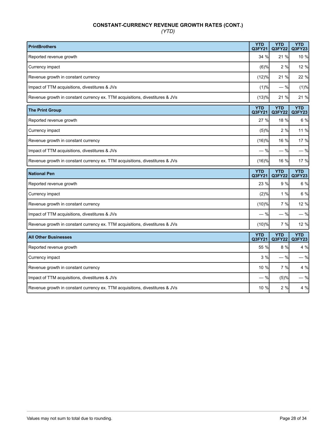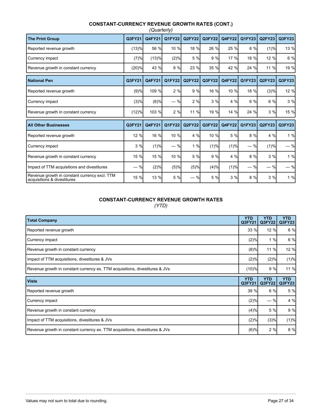 CONSTANT-CURRENCY REVENUE GROWTH RATES (CONT.) (Quarterly) The Print Group Q3FY21 Q4FY21 Q1FY22 Q2FY22 Q3FY22 Q4FY22 Q1FY23 Q2FY23 Q3FY23 Reported revenue growth (13) % 56 % 10 % 18 % 26 % 25 % 6 % (1) % 13 % Currency impact (7) % (13) % (2) % 5 % 9 % 17 % 18 % 12 % 6 % Revenue growth in constant currency (20) % 43 % 8 % 23 % 35 % 42 % 24 % 11 % 19 % National Pen Q3FY21 Q4FY21 Q1FY22 Q2FY22 Q3FY22 Q4FY22 Q1FY23 Q2FY23 Q3FY23 Reported revenue growth (9) % 109 % 2 % 9 % 16 % 10 % 18 % (3) % 12 % Currency impact (3) % (6) % — % 2 % 3 % 4 % 6 % 6 % 3 % Revenue growth in constant currency (12) % 103 % 2 % 11 % 19 % 14 % 24 % 3 % 15 % All Other Businesses Q3FY21 Q4FY21 Q1FY22 Q2FY22 Q3FY22 Q4FY22 Q1FY23 Q2FY23 Q3FY23 Reported revenue growth 12 % 16 % 10 % 4 % 10 % 5 % 8 % 4 % 1 % Currency impact 3 % (1) % — % 1 % (1) % (1) % — % (1) % — % Revenue growth in constant currency 15 % 15 % 10 % 5 % 9 % 4 % 8 % 3 % 1 % Impact of TTM acquisitions and divestitures — % (2) % (5) % (5) % (4) % (1) % — % — % — % Revenue growth in constant currency excl. TTM acquisitions & divestitures 15 % 13 % 5 % — % 5 % 3 % 8 % 3 % 1 % CONSTANT-CURRENCY REVENUE GROWTH RATES (YTD) Total Company YTD Q3FY21 YTD Q3FY22 YTD Q3FY23 Reported revenue growth 33 % 12 % 6 % Currency impact (2) % 1 % 6 % Revenue growth in constant currency (8) % 11 % 12 % Impact of TTM acquisitions, divestitures & JVs (2) % (2) % (1) % Revenue growth in constant currency ex. TTM acquisitions, divestitures & JVs (10) % 9 % 11 % Vista YTD Q3FY21 YTD Q3FY22 YTD Q3FY23 Reported revenue growth 39 % 6 % 5 % Currency impact (2) % — % 4 % Revenue growth in constant currency (4) % 5 % 9 % Impact of TTM acquisitions, divestitures & JVs (2) % (3) % (1) % Revenue growth in constant currency ex. TTM acquisitions, divestitures & JVs (6) % 2 % 8 % Values may not sum to total due to rounding. Page 27 of 34