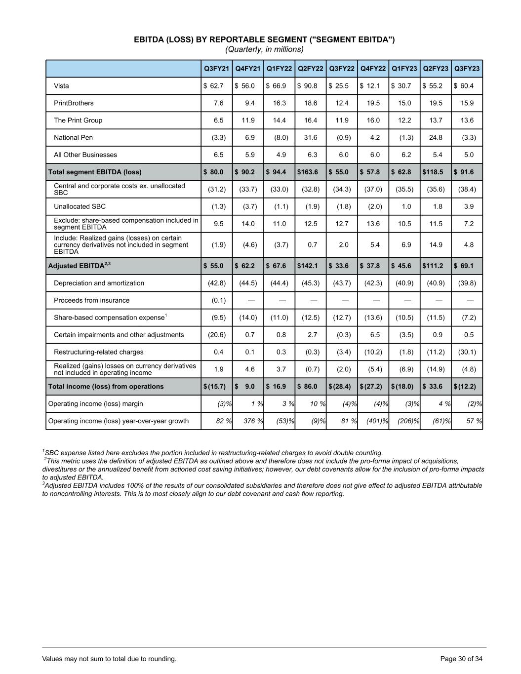 EBITDA (LOSS) BY REPORTABLE SEGMENT ("SEGMENT EBITDA") (Quarterly, in millions) Q3FY21 Q4FY21 Q1FY22 Q2FY22 Q3FY22 Q4FY22 Q1FY23 Q2FY23 Q3FY23 Vista $ 62.7 $ 56.0 $ 66.9 $ 90.8 $ 25.5 $ 12.1 $ 30.7 $ 55.2 $ 60.4 PrintBrothers 7.6 9.4 16.3 18.6 12.4 19.5 15.0 19.5 15.9 The Print Group 6.5 11.9 14.4 16.4 11.9 16.0 12.2 13.7 13.6 National Pen (3.3) 6.9 (8.0) 31.6 (0.9) 4.2 (1.3) 24.8 (3.3) All Other Businesses 6.5 5.9 4.9 6.3 6.0 6.0 6.2 5.4 5.0 Total segment EBITDA (loss) $ 80.0 $ 90.2 $ 94.4 $ 163.6 $ 55.0 $ 57.8 $ 62.8 $ 118.5 $ 91.6 Central and corporate costs ex. unallocated SBC (31.2) (33.7) (33.0) (32.8) (34.3) (37.0) (35.5) (35.6) (38.4) Unallocated SBC (1.3) (3.7) (1.1) (1.9) (1.8) (2.0) 1.0 1.8 3.9 Exclude: share-based compensation included in segment EBITDA 9.5 14.0 11.0 12.5 12.7 13.6 10.5 11.5 7.2 Include: Realized gains (losses) on certain currency derivatives not included in segment EBITDA (1.9) (4.6) (3.7) 0.7 2.0 5.4 6.9 14.9 4.8 Adjusted EBITDA2,3 $ 55.0 $ 62.2 $ 67.6 $ 142.1 $ 33.6 $ 37.8 $ 45.6 $ 111.2 $ 69.1 Depreciation and amortization (42.8) (44.5) (44.4) (45.3) (43.7) (42.3) (40.9) (40.9) (39.8) Proceeds from insurance (0.1) — — — — — — — — Share-based compensation expense1 (9.5) (14.0) (11.0) (12.5) (12.7) (13.6) (10.5) (11.5) (7.2) Certain impairments and other adjustments (20.6) 0.7 0.8 2.7 (0.3) 6.5 (3.5) 0.9 0.5 Restructuring-related charges 0.4 0.1 0.3 (0.3) (3.4) (10.2) (1.8) (11.2) (30.1) Realized (gains) losses on currency derivatives not included in operating income 1.9 4.6 3.7 (0.7) (2.0) (5.4) (6.9) (14.9) (4.8) Total income (loss) from operations $ (15.7) $ 9.0 $ 16.9 $ 86.0 $ (28.4) $ (27.2) $ (18.0) $ 33.6 $ (12.2) Operating income (loss) margin (3) % 1 % 3 % 10 % (4) % (4) % (3) % 4 % (2) % Operating income (loss) year-over-year growth 82 % 376 % (53) % (9) % 81 % (401) % (206) % (61) % 57 % 1SBC expense listed here excludes the portion included in restructuring-related charges to avoid double counting. 2This metric uses the definition of adjusted EBITDA as outlined above and therefore does not include the pro-forma impact of acquisitions, divestitures or the annualized benefit from actioned cost saving initiatives; however, our debt covenants allow for the inclusion of pro-forma impacts to adjusted EBITDA. 3Adjusted EBITDA includes 100% of the results of our consolidated subsidiaries and therefore does not give effect to adjusted EBITDA attributable to noncontrolling interests. This is to most closely align to our debt covenant and cash flow reporting. Values may not sum to total due to rounding. Page 30 of 34