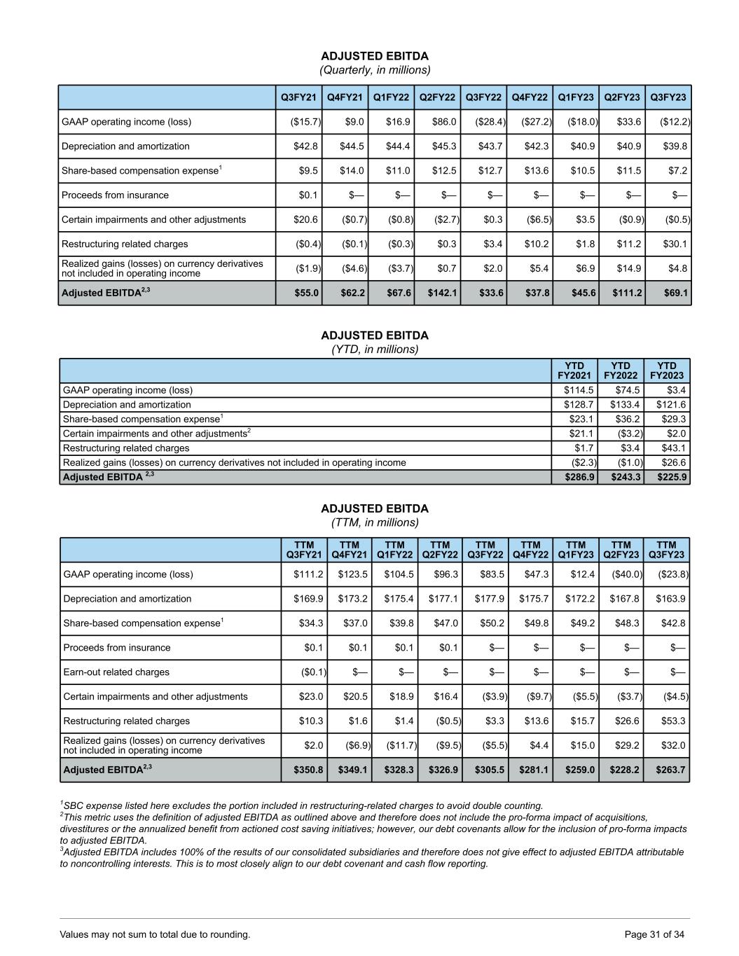 ADJUSTED EBITDA (Quarterly, in millions) Q3FY21 Q4FY21 Q1FY22 Q2FY22 Q3FY22 Q4FY22 Q1FY23 Q2FY23 Q3FY23 GAAP operating income (loss) ($15.7) $9.0 $16.9 $86.0 ($28.4) ($27.2) ($18.0) $33.6 ($12.2) Depreciation and amortization $42.8 $44.5 $44.4 $45.3 $43.7 $42.3 $40.9 $40.9 $39.8 Share-based compensation expense1 $9.5 $14.0 $11.0 $12.5 $12.7 $13.6 $10.5 $11.5 $7.2 Proceeds from insurance $0.1 $— $— $— $— $— $— $— $— Certain impairments and other adjustments $20.6 ($0.7) ($0.8) ($2.7) $0.3 ($6.5) $3.5 ($0.9) ($0.5) Restructuring related charges ($0.4) ($0.1) ($0.3) $0.3 $3.4 $10.2 $1.8 $11.2 $30.1 Realized gains (losses) on currency derivatives not included in operating income ($1.9) ($4.6) ($3.7) $0.7 $2.0 $5.4 $6.9 $14.9 $4.8 Adjusted EBITDA2,3 $55.0 $62.2 $67.6 $142.1 $33.6 $37.8 $45.6 $111.2 $69.1 ADJUSTED EBITDA (YTD, in millions) YTD FY2021 YTD FY2022 YTD FY2023 GAAP operating income (loss) $114.5 $74.5 $3.4 Depreciation and amortization $128.7 $133.4 $121.6 Share-based compensation expense1 $23.1 $36.2 $29.3 Certain impairments and other adjustments2 $21.1 ($3.2) $2.0 Restructuring related charges $1.7 $3.4 $43.1 Realized gains (losses) on currency derivatives not included in operating income ($2.3) ($1.0) $26.6 Adjusted EBITDA 2,3 $286.9 $243.3 $225.9 ADJUSTED EBITDA (TTM, in millions) TTM Q3FY21 TTM Q4FY21 TTM Q1FY22 TTM Q2FY22 TTM Q3FY22 TTM Q4FY22 TTM Q1FY23 TTM Q2FY23 TTM Q3FY23 GAAP operating income (loss) $111.2 $123.5 $104.5 $96.3 $83.5 $47.3 $12.4 ($40.0) ($23.8) Depreciation and amortization $169.9 $173.2 $175.4 $177.1 $177.9 $175.7 $172.2 $167.8 $163.9 Share-based compensation expense1 $34.3 $37.0 $39.8 $47.0 $50.2 $49.8 $49.2 $48.3 $42.8 Proceeds from insurance $0.1 $0.1 $0.1 $0.1 $— $— $— $— $— Earn-out related charges ($0.1) $— $— $— $— $— $— $— $— Certain impairments and other adjustments $23.0 $20.5 $18.9 $16.4 ($3.9) ($9.7) ($5.5) ($3.7) ($4.5) Restructuring related charges $10.3 $1.6 $1.4 ($0.5) $3.3 $13.6 $15.7 $26.6 $53.3 Realized gains (losses) on currency derivatives not included in operating income $2.0 ($6.9) ($11.7) ($9.5) ($5.5) $4.4 $15.0 $29.2 $32.0 Adjusted EBITDA2,3 $350.8 $349.1 $328.3 $326.9 $305.5 $281.1 $259.0 $228.2 $263.7 1SBC expense listed here excludes the portion included in restructuring-related charges to avoid double counting. 2This metric uses the definition of adjusted EBITDA as outlined above and therefore does not include the pro-forma impact of acquisitions, divestitures or the annualized benefit from actioned cost saving initiatives; however, our debt covenants allow for the inclusion of pro-forma impacts to adjusted EBITDA. 3Adjusted EBITDA includes 100% of the results of our consolidated subsidiaries and therefore does not give effect to adjusted EBITDA attributable to noncontrolling interests. This is to most closely align to our debt covenant and cash flow reporting. Values may not sum to total due to rounding. Page 31 of 34