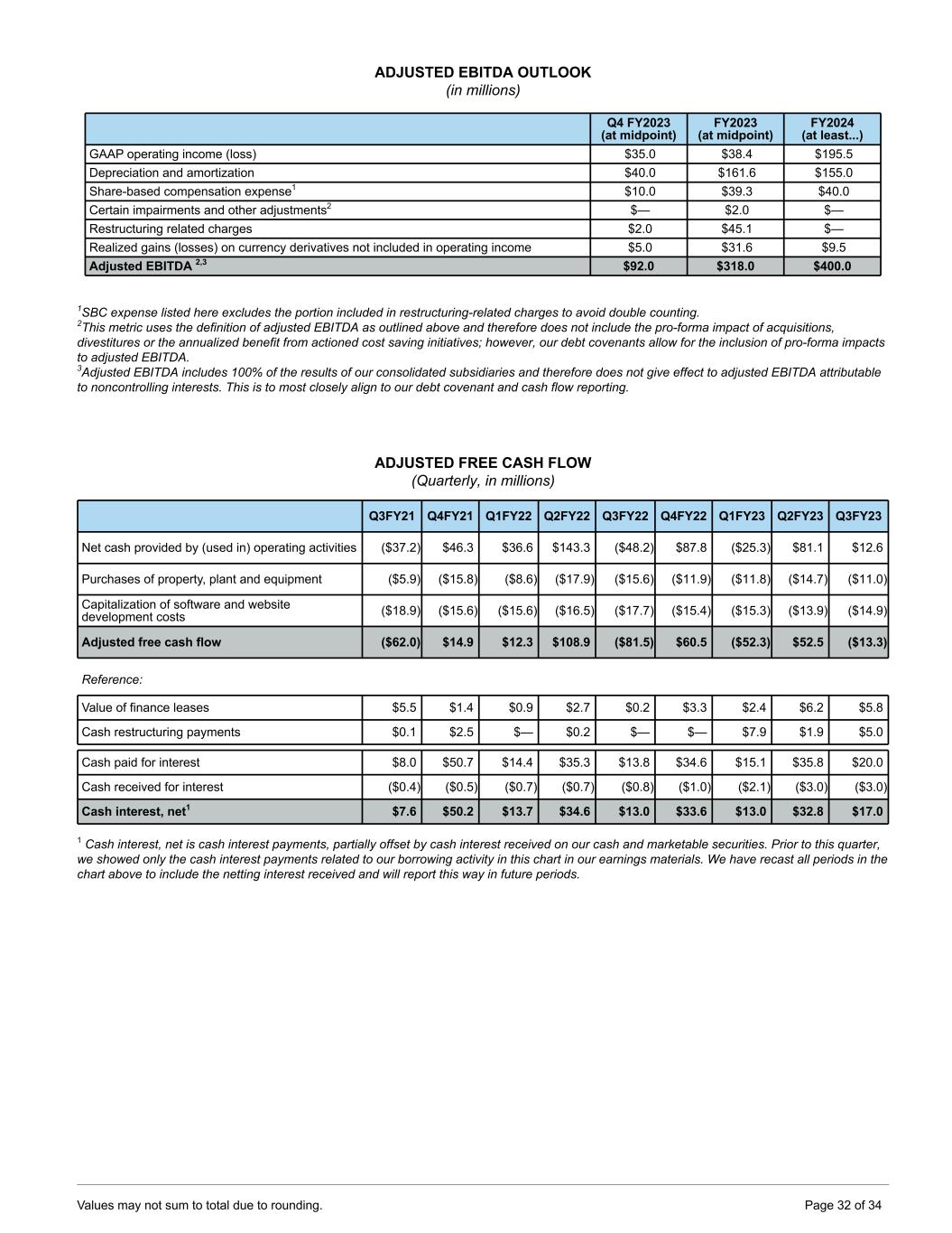 ADJUSTED EBITDA OUTLOOK (in millions) Q4 FY2023 (at midpoint) FY2023 (at midpoint) FY2024 (at least...) GAAP operating income (loss) $35.0 $38.4 $195.5 Depreciation and amortization $40.0 $161.6 $155.0 Share-based compensation expense1 $10.0 $39.3 $40.0 Certain impairments and other adjustments2 $— $2.0 $— Restructuring related charges $2.0 $45.1 $— Realized gains (losses) on currency derivatives not included in operating income $5.0 $31.6 $9.5 Adjusted EBITDA 2,3 $92.0 $318.0 $400.0 1SBC expense listed here excludes the portion included in restructuring-related charges to avoid double counting. 2This metric uses the definition of adjusted EBITDA as outlined above and therefore does not include the pro-forma impact of acquisitions, divestitures or the annualized benefit from actioned cost saving initiatives; however, our debt covenants allow for the inclusion of pro-forma impacts to adjusted EBITDA. 3Adjusted EBITDA includes 100% of the results of our consolidated subsidiaries and therefore does not give effect to adjusted EBITDA attributable to noncontrolling interests. This is to most closely align to our debt covenant and cash flow reporting. ADJUSTED FREE CASH FLOW (Quarterly, in millions) Q3FY21 Q4FY21 Q1FY22 Q2FY22 Q3FY22 Q4FY22 Q1FY23 Q2FY23 Q3FY23 Net cash provided by (used in) operating activities ($37.2) $46.3 $36.6 $143.3 ($48.2) $87.8 ($25.3) $81.1 $12.6 Purchases of property, plant and equipment ($5.9) ($15.8) ($8.6) ($17.9) ($15.6) ($11.9) ($11.8) ($14.7) ($11.0) Capitalization of software and website development costs ($18.9) ($15.6) ($15.6) ($16.5) ($17.7) ($15.4) ($15.3) ($13.9) ($14.9) Adjusted free cash flow ($62.0) $14.9 $12.3 $108.9 ($81.5) $60.5 ($52.3) $52.5 ($13.3) Reference: Value of finance leases $5.5 $1.4 $0.9 $2.7 $0.2 $3.3 $2.4 $6.2 $5.8 Cash restructuring payments $0.1 $2.5 $— $0.2 $— $— $7.9 $1.9 $5.0 Cash paid for interest $8.0 $50.7 $14.4 $35.3 $13.8 $34.6 $15.1 $35.8 $20.0 Cash received for interest ($0.4) ($0.5) ($0.7) ($0.7) ($0.8) ($1.0) ($2.1) ($3.0) ($3.0) Cash interest, net1 $7.6 $50.2 $13.7 $34.6 $13.0 $33.6 $13.0 $32.8 $17.0 1 Cash interest, net is cash interest payments, partially offset by cash interest received on our cash and marketable securities. Prior to this quarter, we showed only the cash interest payments related to our borrowing activity in this chart in our earnings materials. We have recast all periods in the chart above to include the netting interest received and will report this way in future periods. Values may not sum to total due to rounding. Page 32 of 34