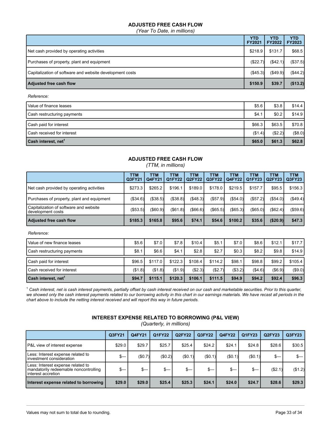ADJUSTED FREE CASH FLOW (Year To Date, in millions) YTD FY2021 YTD FY2022 YTD FY2023 Net cash provided by operating activities $218.9 $131.7 $68.5 Purchases of property, plant and equipment ($22.7) ($42.1) ($37.5) Capitalization of software and website development costs ($45.3) ($49.9) ($44.2) Adjusted free cash flow $150.9 $39.7 ($13.2) Reference: Value of finance leases $5.6 $3.8 $14.4 Cash restructuring payments $4.1 $0.2 $14.9 Cash paid for interest $66.3 $63.5 $70.8 Cash received for interest ($1.4) ($2.2) ($8.0) Cash interest, net1 $65.0 $61.3 $62.8 ADJUSTED FREE CASH FLOW (TTM, in millions) TTM Q3FY21 TTM Q4FY21 TTM Q1FY22 TTM Q2FY22 TTM Q3FY22 TTM Q4FY22 TTM Q1FY23 TTM Q2FY23 TTM Q3FY23 Net cash provided by operating activities $273.3 $265.2 $196.1 $189.0 $178.0 $219.5 $157.7 $95.5 $156.3 Purchases of property, plant and equipment ($34.6) ($38.5) ($38.8) ($48.3) ($57.9) ($54.0) ($57.2) ($54.0) ($49.4) Capitalization of software and website development costs ($53.5) ($60.9) ($61.8) ($66.6) ($65.5) ($65.3) ($65.0) ($62.4) ($59.6) Adjusted free cash flow $185.3 $165.8 $95.6 $74.1 $54.6 $100.2 $35.6 ($20.9) $47.3 Reference: Value of new finance leases $5.6 $7.0 $7.8 $10.4 $5.1 $7.0 $8.6 $12.1 $17.7 Cash restructuring payments $8.1 $6.6 $4.1 $2.8 $2.7 $0.3 $8.2 $9.8 $14.9 Cash paid for interest $96.5 $117.0 $122.3 $108.4 $114.2 $98.1 $98.8 $99.2 $105.4 Cash received for interest ($1.8) ($1.8) ($1.9) ($2.3) ($2.7) ($3.2) ($4.6) ($6.9) ($9.0) Cash interest, net1 $94.7 $115.1 $120.3 $106.1 $111.5 $94.9 $94.2 $92.4 $96.3 1 Cash interest, net is cash interest payments, partially offset by cash interest received on our cash and marketable securities. Prior to this quarter, we showed only the cash interest payments related to our borrowing activity in this chart in our earnings materials. We have recast all periods in the chart above to include the netting interest received and will report this way in future periods. INTEREST EXPENSE RELATED TO BORROWING (P&L VIEW) (Quarterly, in millions) Q3FY21 Q4FY21 Q1FY22 Q2FY22 Q3FY22 Q4FY22 Q1FY23 Q2FY23 Q3FY23 P&L view of interest expense $29.0 $29.7 $25.7 $25.4 $24.2 $24.1 $24.8 $28.6 $30.5 Less: Interest expense related to investment consideration $— ($0.7) ($0.2) ($0.1) ($0.1) ($0.1) ($0.1) $— $— Less: Interest expense related to mandatorily redeemable noncontrolling interest accretion $— $— $— $— $— $— $— ($2.1) ($1.2) Interest expense related to borrowing $29.0 $29.0 $25.4 $25.3 $24.1 $24.0 $24.7 $28.6 $29.3 Values may not sum to total due to rounding. Page 33 of 34