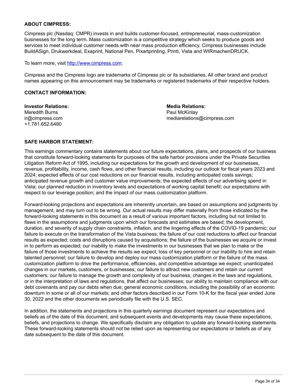 ABOUT CIMPRESS: Cimpress plc (Nasdaq: CMPR) invests in and builds customer-focused, entrepreneurial, mass-customization businesses for the long term. Mass customization is a competitive strategy which seeks to produce goods and services to meet individual customer needs with near mass production efficiency. Cimpress businesses include BuildASign, Drukwerkdeal, Exaprint, National Pen, Pixartprinting, Printi, Vista and WIRmachenDRUCK. To learn more, visit http://www.cimpress.com. Cimpress and the Cimpress logo are trademarks of Cimpress plc or its subsidiaries. All other brand and product names appearing on this announcement may be trademarks or registered trademarks of their respective holders. CONTACT INFORMATION: Investor Relations: Media Relations: Meredith Burns Paul McKinlay ir@cimpress.com mediarelations@cimpress.com +1.781.652.6480 SAFE HARBOR STATEMENT: This earnings commentary contains statements about our future expectations, plans, and prospects of our business that constitute forward-looking statements for purposes of the safe harbor provisions under the Private Securities Litigation Reform Act of 1995, including our expectations for the growth and development of our businesses, revenue, profitability, income, cash flows, and other financial results, including our outlook for fiscal years 2023 and 2024; expected effects of our cost reductions on our financial results, including anticipated costs savings; anticipated revenue growth and customer value improvements; the expected effects of our advertising spend in Vista; our planned reduction in inventory levels and expectations of working capital benefit; our expectations with respect to our leverage position; and the impact of our mass customization platform. Forward-looking projections and expectations are inherently uncertain, are based on assumptions and judgments by management, and may turn out to be wrong. Our actual results may differ materially from those indicated by the forward-looking statements in this document as a result of various important factors, including but not limited to flaws in the assumptions and judgments upon which our forecasts and estimates are based; the development, duration, and severity of supply chain constraints, inflation, and the lingering effects of the COVID-19 pandemic; our failure to execute on the transformation of the Vista business; the failure of our cost reductions to affect our financial results as expected; costs and disruptions caused by acquisitions; the failure of the businesses we acquire or invest in to perform as expected; our inability to make the investments in our businesses that we plan to make or the failure of those investments to achieve the results we expect; loss of key personnel or our inability to hire and retain talented personnel; our failure to develop and deploy our mass customization platform or the failure of the mass customization platform to drive the performance, efficiencies, and competitive advantage we expect; unanticipated changes in our markets, customers, or businesses; our failure to attract new customers and retain our current customers; our failure to manage the growth and complexity of our business; changes in the laws and regulations, or in the interpretation of laws and regulations, that affect our businesses; our ability to maintain compliance with our debt covenants and pay our debts when due; general economic conditions, including the possibility of an economic downturn in some or all of our markets; and other factors described in our Form 10-K for the fiscal year ended June 30, 2022 and the other documents we periodically file with the U.S. SEC. In addition, the statements and projections in this quarterly earnings document represent our expectations and beliefs as of the date of this document, and subsequent events and developments may cause these expectations, beliefs, and projections to change. We specifically disclaim any obligation to update any forward-looking statements. These forward-looking statements should not be relied upon as representing our expectations or beliefs as of any date subsequent to the date of this document. Page 34 of 34
