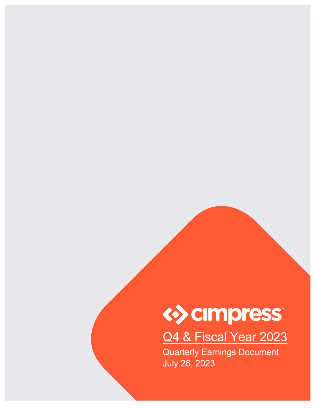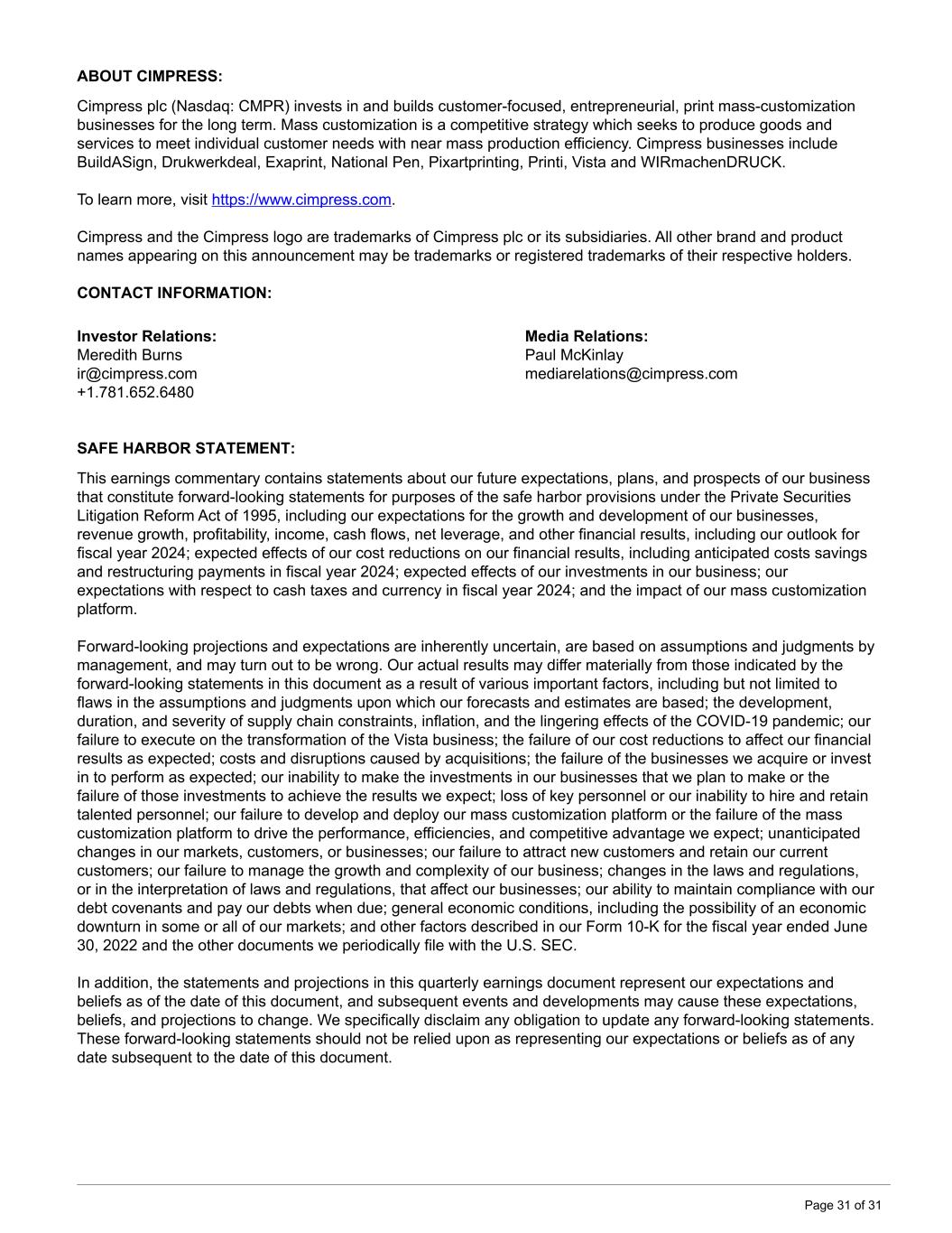 ABOUT CIMPRESS: Cimpress plc (Nasdaq: CMPR) invests in and builds customer-focused, entrepreneurial, print mass-customization businesses for the long term. Mass customization is a competitive strategy which seeks to produce goods and services to meet individual customer needs with near mass production efficiency. Cimpress businesses include BuildASign, Drukwerkdeal, Exaprint, National Pen, Pixartprinting, Printi, Vista and WIRmachenDRUCK. To learn more, visit https://www.cimpress.com. Cimpress and the Cimpress logo are trademarks of Cimpress plc or its subsidiaries. All other brand and product names appearing on this announcement may be trademarks or registered trademarks of their respective holders. CONTACT INFORMATION: Investor Relations: Media Relations: Meredith Burns Paul McKinlay ir@cimpress.com mediarelations@cimpress.com +1.781.652.6480 SAFE HARBOR STATEMENT: This earnings commentary contains statements about our future expectations, plans, and prospects of our business that constitute forward-looking statements for purposes of the safe harbor provisions under the Private Securities Litigation Reform Act of 1995, including our expectations for the growth and development of our businesses, revenue growth, profitability, income, cash flows, net leverage, and other financial results, including our outlook for fiscal year 2024; expected effects of our cost reductions on our financial results, including anticipated costs savings and restructuring payments in fiscal year 2024; expected effects of our investments in our business; our expectations with respect to cash taxes and currency in fiscal year 2024; and the impact of our mass customization platform. Forward-looking projections and expectations are inherently uncertain, are based on assumptions and judgments by management, and may turn out to be wrong. Our actual results may differ materially from those indicated by the forward-looking statements in this document as a result of various important factors, including but not limited to flaws in the assumptions and judgments upon which our forecasts and estimates are based; the development, duration, and severity of supply chain constraints, inflation, and the lingering effects of the COVID-19 pandemic; our failure to execute on the transformation of the Vista business; the failure of our cost reductions to affect our financial results as expected; costs and disruptions caused by acquisitions; the failure of the businesses we acquire or invest in to perform as expected; our inability to make the investments in our businesses that we plan to make or the failure of those investments to achieve the results we expect; loss of key personnel or our inability to hire and retain talented personnel; our failure to develop and deploy our mass customization platform or the failure of the mass customization platform to drive the performance, efficiencies, and competitive advantage we expect; unanticipated changes in our markets, customers, or businesses; our failure to attract new customers and retain our current customers; our failure to manage the growth and complexity of our business; changes in the laws and regulations, or in the interpretation of laws and regulations, that affect our businesses; our ability to maintain compliance with our debt covenants and pay our debts when due; general economic conditions, including the possibility of an economic downturn in some or all of our markets; and other factors described in our Form 10-K for the fiscal year ended June 30, 2022 and the other documents we periodically file with the U.S. SEC. In addition, the statements and projections in this quarterly earnings document represent our expectations and beliefs as of the date of this document, and subsequent events and developments may cause these expectations, beliefs, and projections to change. We specifically disclaim any obligation to update any forward-looking statements. These forward-looking statements should not be relied upon as representing our expectations or beliefs as of any date subsequent to the date of this document. Page 31 of 31