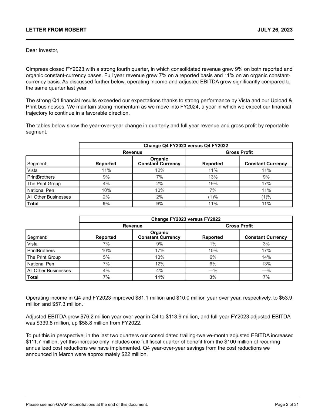 LETTER FROM ROBERT JULY 26, 2023 Dear Investor, Cimpress closed FY2023 with a strong fourth quarter, in which consolidated revenue grew 9% on both reported and organic constant-currency bases. Full year revenue grew 7% on a reported basis and 11% on an organic constant- currency basis. As discussed further below, operating income and adjusted EBITDA grew significantly compared to the same quarter last year. The strong Q4 financial results exceeded our expectations thanks to strong performance by Vista and our Upload & Print businesses. We maintain strong momentum as we move into FY2024, a year in which we expect our financial trajectory to continue in a favorable direction. The tables below show the year-over-year change in quarterly and full year revenue and gross profit by reportable segment. Change Q4 FY2023 versus Q4 FY2022 Revenue Gross Profit Segment: Reported Organic Constant Currency Reported Constant Currency Vista 11% 12% 11% 11% PrintBrothers 9% 7% 13% 9% The Print Group 4% 2% 19% 17% National Pen 10% 10% 7% 11% All Other Businesses 2% 2% (1)% (1)% Total 9% 9% 11% 11% Change FY2023 versus FY2022 Revenue Gross Profit Segment: Reported Organic Constant Currency Reported Constant Currency Vista 7% 9% 1% 3% PrintBrothers 10% 17% 10% 17% The Print Group 5% 13% 6% 14% National Pen 7% 12% 6% 13% All Other Businesses 4% 4% —% —% Total 7% 11% 3% 7% Operating income in Q4 and FY2023 improved $81.1 million and $10.0 million year over year, respectively, to $53.9 million and $57.3 million. Adjusted EBITDA grew $76.2 million year over year in Q4 to $113.9 million, and full-year FY2023 adjusted EBITDA was $339.8 million, up $58.8 million from FY2022. To put this in perspective, in the last two quarters our consolidated trailing-twelve-month adjusted EBITDA increased $111.7 million, yet this increase only includes one full fiscal quarter of benefit from the $100 million of recurring annualized cost reductions we have implemented. Q4 year-over-year savings from the cost reductions we announced in March were approximately $22 million. Please see non-GAAP reconciliations at the end of this document. Page 2 of 31