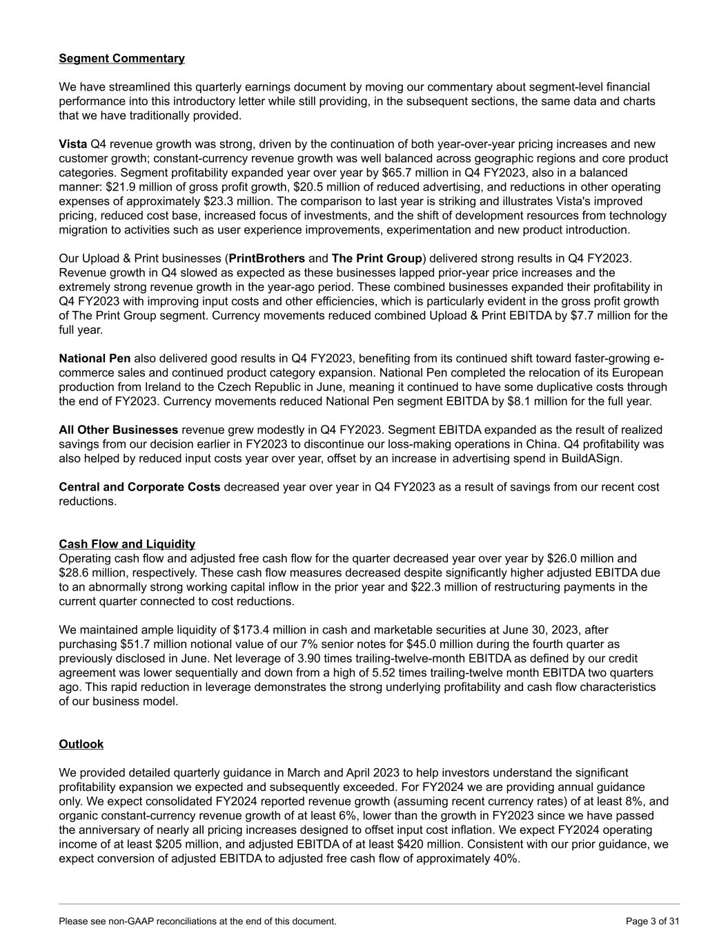 Segment Commentary We have streamlined this quarterly earnings document by moving our commentary about segment-level financial performance into this introductory letter while still providing, in the subsequent sections, the same data and charts that we have traditionally provided. Vista Q4 revenue growth was strong, driven by the continuation of both year-over-year pricing increases and new customer growth; constant-currency revenue growth was well balanced across geographic regions and core product categories. Segment profitability expanded year over year by $65.7 million in Q4 FY2023, also in a balanced manner: $21.9 million of gross profit growth, $20.5 million of reduced advertising, and reductions in other operating expenses of approximately $23.3 million. The comparison to last year is striking and illustrates Vista's improved pricing, reduced cost base, increased focus of investments, and the shift of development resources from technology migration to activities such as user experience improvements, experimentation and new product introduction. Our Upload & Print businesses (PrintBrothers and The Print Group) delivered strong results in Q4 FY2023. Revenue growth in Q4 slowed as expected as these businesses lapped prior-year price increases and the extremely strong revenue growth in the year-ago period. These combined businesses expanded their profitability in Q4 FY2023 with improving input costs and other efficiencies, which is particularly evident in the gross profit growth of The Print Group segment. Currency movements reduced combined Upload & Print EBITDA by $7.7 million for the full year. National Pen also delivered good results in Q4 FY2023, benefiting from its continued shift toward faster-growing e- commerce sales and continued product category expansion. National Pen completed the relocation of its European production from Ireland to the Czech Republic in June, meaning it continued to have some duplicative costs through the end of FY2023. Currency movements reduced National Pen segment EBITDA by $8.1 million for the full year. All Other Businesses revenue grew modestly in Q4 FY2023. Segment EBITDA expanded as the result of realized savings from our decision earlier in FY2023 to discontinue our loss-making operations in China. Q4 profitability was also helped by reduced input costs year over year, offset by an increase in advertising spend in BuildASign. Central and Corporate Costs decreased year over year in Q4 FY2023 as a result of savings from our recent cost reductions. Cash Flow and Liquidity Operating cash flow and adjusted free cash flow for the quarter decreased year over year by $26.0 million and $28.6 million, respectively. These cash flow measures decreased despite significantly higher adjusted EBITDA due to an abnormally strong working capital inflow in the prior year and $22.3 million of restructuring payments in the current quarter connected to cost reductions. We maintained ample liquidity of $173.4 million in cash and marketable securities at June 30, 2023, after purchasing $51.7 million notional value of our 7% senior notes for $45.0 million during the fourth quarter as previously disclosed in June. Net leverage of 3.90 times trailing-twelve-month EBITDA as defined by our credit agreement was lower sequentially and down from a high of 5.52 times trailing-twelve month EBITDA two quarters ago. This rapid reduction in leverage demonstrates the strong underlying profitability and cash flow characteristics of our business model. Outlook We provided detailed quarterly guidance in March and April 2023 to help investors understand the significant profitability expansion we expected and subsequently exceeded. For FY2024 we are providing annual guidance only. We expect consolidated FY2024 reported revenue growth (assuming recent currency rates) of at least 8%, and organic constant-currency revenue growth of at least 6%, lower than the growth in FY2023 since we have passed the anniversary of nearly all pricing increases designed to offset input cost inflation. We expect FY2024 operating income of at least $205 million, and adjusted EBITDA of at least $420 million. Consistent with our prior guidance, we expect conversion of adjusted EBITDA to adjusted free cash flow of approximately 40%. Please see non-GAAP reconciliations at the end of this document. Page 3 of 31
