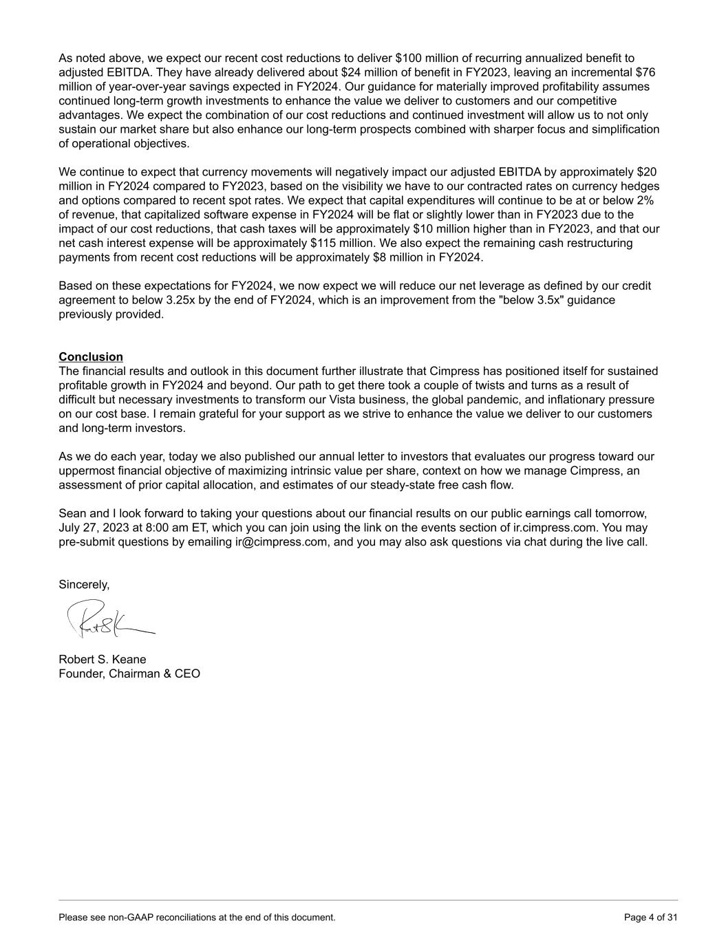As noted above, we expect our recent cost reductions to deliver $100 million of recurring annualized benefit to adjusted EBITDA. They have already delivered about $24 million of benefit in FY2023, leaving an incremental $76 million of year-over-year savings expected in FY2024. Our guidance for materially improved profitability assumes continued long-term growth investments to enhance the value we deliver to customers and our competitive advantages. We expect the combination of our cost reductions and continued investment will allow us to not only sustain our market share but also enhance our long-term prospects combined with sharper focus and simplification of operational objectives. We continue to expect that currency movements will negatively impact our adjusted EBITDA by approximately $20 million in FY2024 compared to FY2023, based on the visibility we have to our contracted rates on currency hedges and options compared to recent spot rates. We expect that capital expenditures will continue to be at or below 2% of revenue, that capitalized software expense in FY2024 will be flat or slightly lower than in FY2023 due to the impact of our cost reductions, that cash taxes will be approximately $10 million higher than in FY2023, and that our net cash interest expense will be approximately $115 million. We also expect the remaining cash restructuring payments from recent cost reductions will be approximately $8 million in FY2024. Based on these expectations for FY2024, we now expect we will reduce our net leverage as defined by our credit agreement to below 3.25x by the end of FY2024, which is an improvement from the "below 3.5x" guidance previously provided. Conclusion The financial results and outlook in this document further illustrate that Cimpress has positioned itself for sustained profitable growth in FY2024 and beyond. Our path to get there took a couple of twists and turns as a result of difficult but necessary investments to transform our Vista business, the global pandemic, and inflationary pressure on our cost base. I remain grateful for your support as we strive to enhance the value we deliver to our customers and long-term investors. As we do each year, today we also published our annual letter to investors that evaluates our progress toward our uppermost financial objective of maximizing intrinsic value per share, context on how we manage Cimpress, an assessment of prior capital allocation, and estimates of our steady-state free cash flow. Sean and I look forward to taking your questions about our financial results on our public earnings call tomorrow, July 27, 2023 at 8:00 am ET, which you can join using the link on the events section of ir.cimpress.com. You may pre-submit questions by emailing ir@cimpress.com, and you may also ask questions via chat during the live call. Sincerely, Robert S. Keane Founder, Chairman & CEO Please see non-GAAP reconciliations at the end of this document. Page 4 of 31