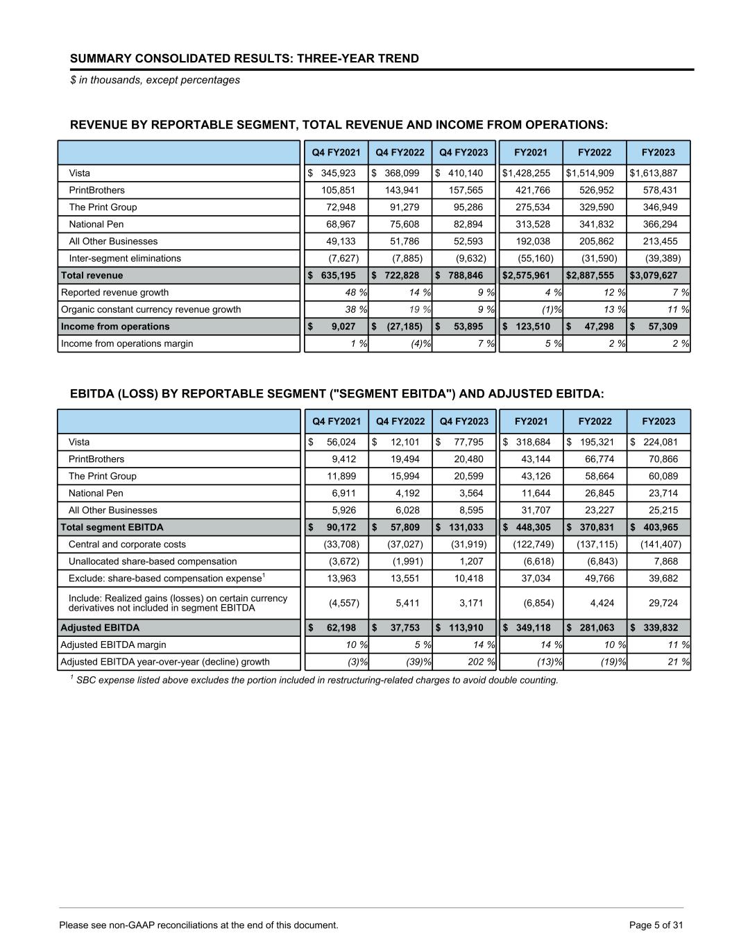 SUMMARY CONSOLIDATED RESULTS: THREE-YEAR TREND $ in thousands, except percentages REVENUE BY REPORTABLE SEGMENT, TOTAL REVENUE AND INCOME FROM OPERATIONS: Q4 FY2021 Q4 FY2022 Q4 FY2023 FY2021 FY2022 FY2023 Vista $ 345,923 $ 368,099 $ 410,140 $ 1,428,255 $ 1,514,909 $ 1,613,887 PrintBrothers 105,851 143,941 157,565 421,766 526,952 578,431 The Print Group 72,948 91,279 95,286 275,534 329,590 346,949 National Pen 68,967 75,608 82,894 313,528 341,832 366,294 All Other Businesses 49,133 51,786 52,593 192,038 205,862 213,455 Inter-segment eliminations (7,627) (7,885) (9,632) (55,160) (31,590) (39,389) Total revenue $ 635,195 $ 722,828 $ 788,846 $ 2,575,961 $ 2,887,555 $ 3,079,627 Reported revenue growth 48 % 14 % 9 % 4 % 12 % 7 % Organic constant currency revenue growth 38 % 19 % 9 % (1) % 13 % 11 % Income from operations $ 9,027 $ (27,185) $ 53,895 $ 123,510 $ 47,298 $ 57,309 Income from operations margin 1 % (4) % 7 % 5 % 2 % 2 % EBITDA (LOSS) BY REPORTABLE SEGMENT ("SEGMENT EBITDA") AND ADJUSTED EBITDA: Q4 FY2021 Q4 FY2022 Q4 FY2023 FY2021 FY2022 FY2023 Vista $ 56,024 $ 12,101 $ 77,795 $ 318,684 $ 195,321 $ 224,081 PrintBrothers 9,412 19,494 20,480 43,144 66,774 70,866 The Print Group 11,899 15,994 20,599 43,126 58,664 60,089 National Pen 6,911 4,192 3,564 11,644 26,845 23,714 All Other Businesses 5,926 6,028 8,595 31,707 23,227 25,215 Total segment EBITDA $ 90,172 $ 57,809 $ 131,033 $ 448,305 $ 370,831 $ 403,965 Central and corporate costs (33,708) (37,027) (31,919) (122,749) (137,115) (141,407) Unallocated share-based compensation (3,672) (1,991) 1,207 (6,618) (6,843) 7,868 Exclude: share-based compensation expense1 13,963 13,551 10,418 37,034 49,766 39,682 Include: Realized gains (losses) on certain currency derivatives not included in segment EBITDA (4,557) 5,411 3,171 (6,854) 4,424 29,724 Adjusted EBITDA $ 62,198 $ 37,753 $ 113,910 $ 349,118 $ 281,063 $ 339,832 Adjusted EBITDA margin 10 % 5 % 14 % 14 % 10 % 11 % Adjusted EBITDA year-over-year (decline) growth (3) % (39) % 202 % (13) % (19) % 21 % 1 SBC expense listed above excludes the portion included in restructuring-related charges to avoid double counting. Please see non-GAAP reconciliations at the end of this document. Page 5 of 31