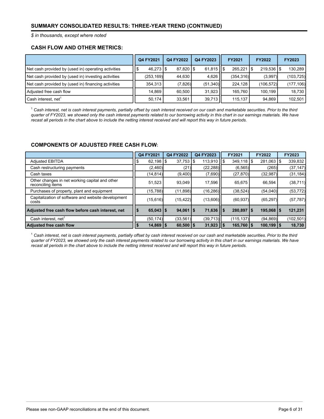 SUMMARY CONSOLIDATED RESULTS: THREE-YEAR TREND (CONTINUED) $ in thousands, except where noted CASH FLOW AND OTHER METRICS: Q4 FY2021 Q4 FY2022 Q4 FY2023 FY2021 FY2022 FY2023 Net cash provided by (used in) operating activities $ 46,273 $ 87,820 $ 61,815 $ 265,221 $ 219,536 $ 130,289 Net cash provided by (used in) investing activities (253,169) 44,630 4,626 (354,316) (3,997) (103,725) Net cash provided by (used in) financing activities 354,313 (7,826) (51,340) 224,128 (106,572) (177,106) Adjusted free cash flow 14,869 60,500 31,923 165,760 100,199 18,730 Cash interest, net1 50,174 33,561 39,713 115,137 94,869 102,501 1 Cash interest, net is cash interest payments, partially offset by cash interest received on our cash and marketable securities. Prior to the third quarter of FY2023, we showed only the cash interest payments related to our borrowing activity in this chart in our earnings materials. We have recast all periods in the chart above to include the netting interest received and will report this way in future periods. COMPONENTS OF ADJUSTED FREE CASH FLOW: Q4 FY2021 Q4 FY2022 Q4 FY2023 FY2021 FY2022 FY2023 Adjusted EBITDA $ 62,198 $ 37,753 $ 113,910 $ 349,118 $ 281,063 $ 339,832 Cash restructuring payments (2,460) (21) (22,288) (6,565) (265) (37,147) Cash taxes (14,814) (9,400) (7,690) (27,870) (32,987) (31,184) Other changes in net working capital and other reconciling items 51,523 93,049 17,596 65,675 66,594 (38,711) Purchases of property, plant and equipment (15,788) (11,898) (16,286) (38,524) (54,040) (53,772) Capitalization of software and website development costs (15,616) (15,422) (13,606) (60,937) (65,297) (57,787) Adjusted free cash flow before cash interest, net $ 65,043 $ 94,061 $ 71,636 $ 280,897 $ 195,068 $ 121,231 Cash interest, net1 (50,174) (33,561) (39,713) (115,137) (94,869) (102,501) Adjusted free cash flow $ 14,869 $ 60,500 $ 31,923 $ 165,760 $ 100,199 $ 18,730 1 Cash interest, net is cash interest payments, partially offset by cash interest received on our cash and marketable securities. Prior to the third quarter of FY2023, we showed only the cash interest payments related to our borrowing activity in this chart in our earnings materials. We have recast all periods in the chart above to include the netting interest received and will report this way in future periods. Please see non-GAAP reconciliations at the end of this document. Page 6 of 31