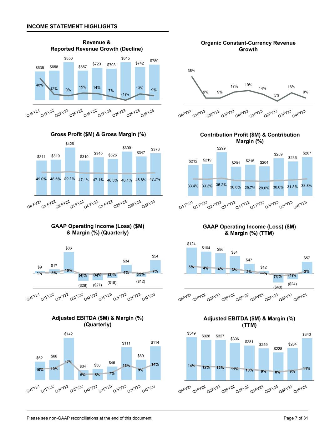 INCOME STATEMENT HIGHLIGHTS Revenue & Reported Revenue Growth (Decline) $635 $658 $850 $657 $723 $703 $845 $742 $789 48% 12% 9% 15% 14% 7% (1)% 13% 9% Q4FY21 Q1FY22 Q2FY22 Q3FY22 Q4FY22 Q1FY23 Q2FY23 Q3FY23 Q4FY23 Gross Profit ($M) & Gross Margin (%) $311 $319 $426 $310 $340 $326 $390 $347 $376 49.0% 48.5% 50.1% 47.1% 47.1% 46.3% 46.1% 46.8% 47.7% Q4 FY21 Q1 FY22 Q2 FY22 Q3 FY22 Q4 FY22 Q1 FY23 Q2FY23 Q3FY23 Q4FY23 GAAP Operating Income (Loss) ($M) & Margin (%) (Quarterly) $9 $17 $86 ($28) ($27) ($18) $34 ($12) $54 1% 3% 10% (4)% (4)% (3)% 4% (2)% 7% Q4FY21 Q1FY22 Q2FY22 Q3FY22 Q4FY22 Q1FY23 Q2FY23 Q3FY23 Q4FY23 Adjusted EBITDA ($M) & Margin (%) (Quarterly) $62 $68 $142 $34 $38 $46 $111 $69 $114 10% 10% 17% 5% 5% 7% 13% 9% 14% Q4FY21 Q1FY22 Q2FY22 Q3FY22 Q4FY22 Q1FY23 Q2FY23 Q3FY23 Q4FY23 Organic Constant-Currency Revenue Growth 38% 9% 9% 17% 19% 14% 5% 16% 9% Q4FY21 Q1FY22 Q2FY22 Q3FY22 Q4FY22 Q1FY23 Q2FY23 Q3FY23 Q4FY23 Contribution Profit ($M) & Contribution Margin (%) $212 $219 $299 $201 $215 $204 $259 $236 $267 33.4% 33.2% 35.2% 30.6% 29.7% 29.0% 30.6% 31.8% 33.8% Q4 FY21 Q1 FY22 Q2 FY22 Q3 FY22 Q4 FY22 Q1 FY23 Q2FY23 Q3FY23 Q4FY23 GAAP Operating Income (Loss) ($M) & Margin (%) (TTM) $124 $104 $96 $84 $47 $12 ($40) ($24) $57 5% 4% 4% 3% 2% —% (1)% (1)% 2% Q4FY21 Q1FY22 Q2FY22 Q3FY22 Q4FY22 Q1FY23 Q2FY23 Q3FY23 Q4FY23 Adjusted EBITDA ($M) & Margin (%) (TTM) $349 $328 $327 $306 $281 $259 $228 $264 $340 14% 12% 12% 11% 10% 9% 8% 9% 11% Q4FY21 Q1FY22 Q2FY22 Q3FY22 Q4FY22 Q1FY23 Q2FY23 Q3FY23 Q4FY23 Please see non-GAAP reconciliations at the end of this document. Page 7 of 31