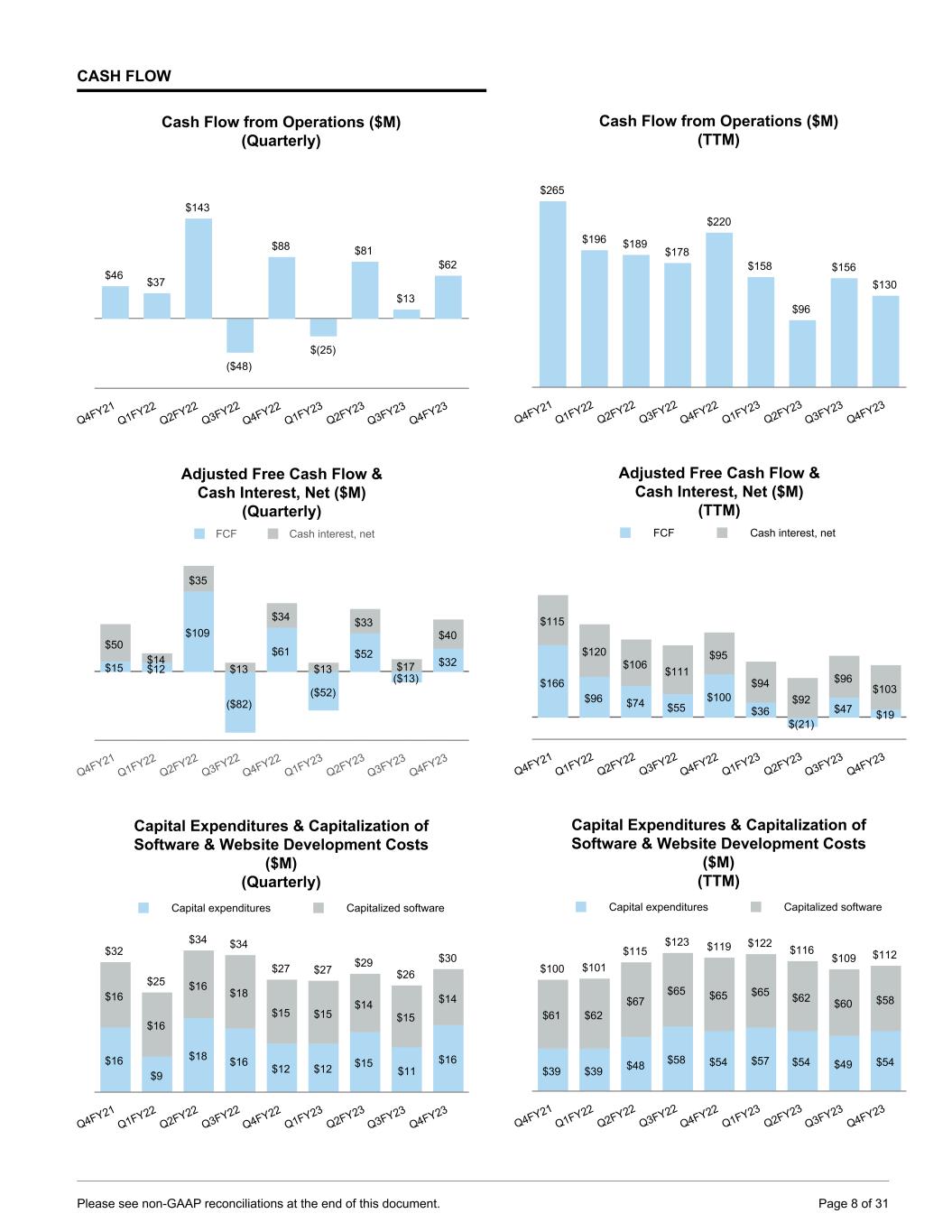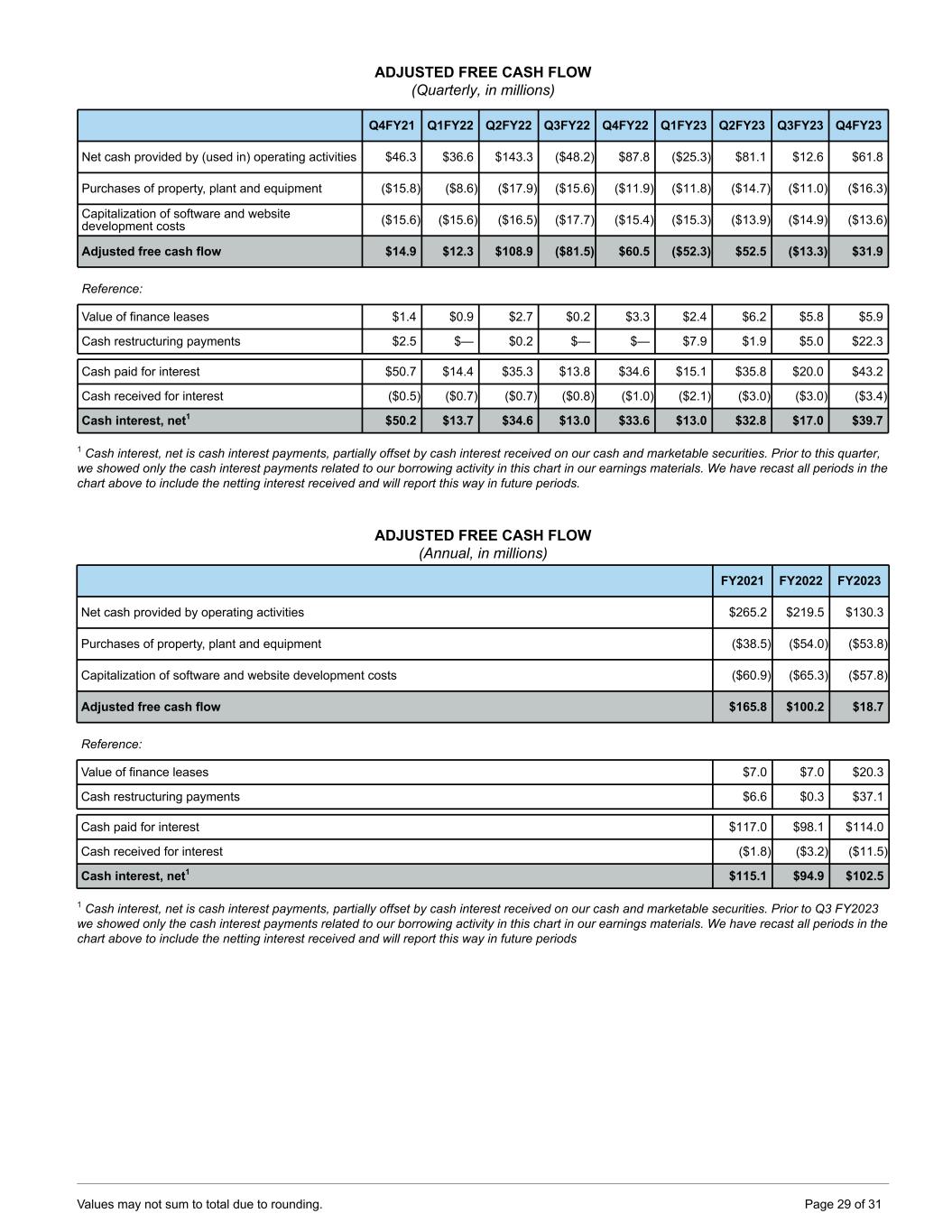 ADJUSTED FREE CASH FLOW (Quarterly, in millions) Q4FY21 Q1FY22 Q2FY22 Q3FY22 Q4FY22 Q1FY23 Q2FY23 Q3FY23 Q4FY23 Net cash provided by (used in) operating activities $46.3 $36.6 $143.3 ($48.2) $87.8 ($25.3) $81.1 $12.6 $61.8 Purchases of property, plant and equipment ($15.8) ($8.6) ($17.9) ($15.6) ($11.9) ($11.8) ($14.7) ($11.0) ($16.3) Capitalization of software and website development costs ($15.6) ($15.6) ($16.5) ($17.7) ($15.4) ($15.3) ($13.9) ($14.9) ($13.6) Adjusted free cash flow $14.9 $12.3 $108.9 ($81.5) $60.5 ($52.3) $52.5 ($13.3) $31.9 Reference: Value of finance leases $1.4 $0.9 $2.7 $0.2 $3.3 $2.4 $6.2 $5.8 $5.9 Cash restructuring payments $2.5 $— $0.2 $— $— $7.9 $1.9 $5.0 $22.3 Cash paid for interest $50.7 $14.4 $35.3 $13.8 $34.6 $15.1 $35.8 $20.0 $43.2 Cash received for interest ($0.5) ($0.7) ($0.7) ($0.8) ($1.0) ($2.1) ($3.0) ($3.0) ($3.4) Cash interest, net1 $50.2 $13.7 $34.6 $13.0 $33.6 $13.0 $32.8 $17.0 $39.7 1 Cash interest, net is cash interest payments, partially offset by cash interest received on our cash and marketable securities. Prior to this quarter, we showed only the cash interest payments related to our borrowing activity in this chart in our earnings materials. We have recast all periods in the chart above to include the netting interest received and will report this way in future periods. ADJUSTED FREE CASH FLOW (Annual, in millions) FY2021 FY2022 FY2023 Net cash provided by operating activities $265.2 $219.5 $130.3 Purchases of property, plant and equipment ($38.5) ($54.0) ($53.8) Capitalization of software and website development costs ($60.9) ($65.3) ($57.8) Adjusted free cash flow $165.8 $100.2 $18.7 Reference: Value of finance leases $7.0 $7.0 $20.3 Cash restructuring payments $6.6 $0.3 $37.1 Cash paid for interest $117.0 $98.1 $114.0 Cash received for interest ($1.8) ($3.2) ($11.5) Cash interest, net1 $115.1 $94.9 $102.5 1 Cash interest, net is cash interest payments, partially offset by cash interest received on our cash and marketable securities. Prior to Q3 FY2023 we showed only the cash interest payments related to our borrowing activity in this chart in our earnings materials. We have recast all periods in the chart above to include the netting interest received and will report this way in future periods Values may not sum to total due to rounding. Page 29 of 31