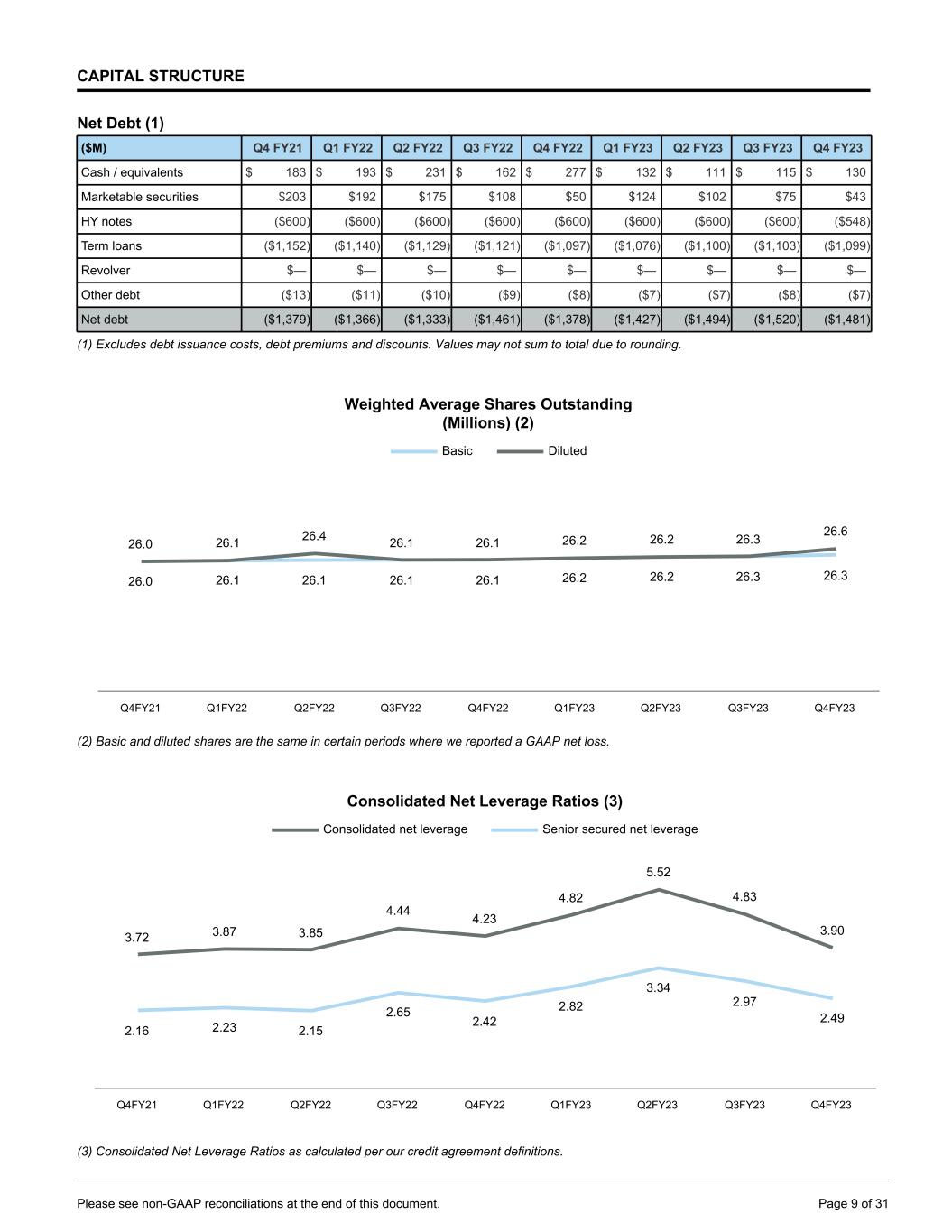 CAPITAL STRUCTURE Net Debt (1) ($M) Q4 FY21 Q1 FY22 Q2 FY22 Q3 FY22 Q4 FY22 Q1 FY23 Q2 FY23 Q3 FY23 Q4 FY23 Cash / equivalents $ 183 $ 193 $ 231 $ 162 $ 277 $ 132 $ 111 $ 115 $ 130 Marketable securities $203 $192 $175 $108 $50 $124 $102 $75 $43 HY notes ($600) ($600) ($600) ($600) ($600) ($600) ($600) ($600) ($548) Term loans ($1,152) ($1,140) ($1,129) ($1,121) ($1,097) ($1,076) ($1,100) ($1,103) ($1,099) Revolver $— $— $— $— $— $— $— $— $— Other debt ($13) ($11) ($10) ($9) ($8) ($7) ($7) ($8) ($7) Net debt ($1,379) ($1,366) ($1,333) ($1,461) ($1,378) ($1,427) ($1,494) ($1,520) ($1,481) (1) Excludes debt issuance costs, debt premiums and discounts. Values may not sum to total due to rounding. Weighted Average Shares Outstanding (Millions) (2) 26.0 26.1 26.1 26.1 26.1 26.2 26.2 26.3 26.3 26.0 26.1 26.4 26.1 26.1 26.2 26.2 26.3 26.6 Basic Diluted Q4FY21 Q1FY22 Q2FY22 Q3FY22 Q4FY22 Q1FY23 Q2FY23 Q3FY23 Q4FY23 (2) Basic and diluted shares are the same in certain periods where we reported a GAAP net loss. Consolidated Net Leverage Ratios (3) 3.72 3.87 3.85 4.44 4.23 4.82 5.52 4.83 3.90 2.16 2.23 2.15 2.65 2.42 2.82 3.34 2.97 2.49 Consolidated net leverage Senior secured net leverage Q4FY21 Q1FY22 Q2FY22 Q3FY22 Q4FY22 Q1FY23 Q2FY23 Q3FY23 Q4FY23 (3) Consolidated Net Leverage Ratios as calculated per our credit agreement definitions. Please see non-GAAP reconciliations at the end of this document. Page 9 of 31