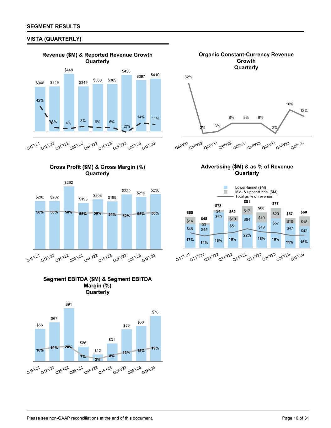 SEGMENT RESULTS VISTA (QUARTERLY) Revenue ($M) & Reported Revenue Growth Quarterly $346 $349 $448 $349 $368 $369 $438 $397 $410 42% 6% 4% 8% 6% 6% (2)% 14% 11% Q4FY21 Q1FY22 Q2FY22 Q3FY22 Q4FY22 Q1FY23 Q2FY23 Q3FY23 Q4FY23 Gross Profit ($M) & Gross Margin (%) Quarterly $202 $202 $262 $193 $208 $199 $229 $219 $230 58% 58% 58% 55% 56% 54% 52% 55% 56% Q4FY21 Q1FY22 Q2FY22 Q3FY22 Q4FY22 Q1FY23 Q2FY23 Q3FY23 Q4FY23 Segment EBITDA ($M) & Segment EBITDA Margin (%) Quarterly $56 $67 $91 $26 $12 $31 $55 $60 $78 16% 19% 20% 7% 3% 8% 13% 15% 19% Q4FY21 Q1FY22 Q2FY22 Q3FY22 Q4FY22 Q1FY23 Q2FY23 Q3FY23 Q4FY23 Organic Constant-Currency Revenue Growth Quarterly 32% 2% 3% 8% 8% 8% 2% 16% 12% Q4FY21 Q1FY22 Q2FY22 Q3FY22 Q4FY22 Q1FY23 Q2FY23 Q3FY23 Q4FY23 Advertising ($M) & as % of Revenue Quarterly $60 $48 $73 $62 $81 $68 $77 $57 $60 $46 $45 $69 $51 $64 $49 $57 $47 $42 $14 $3 $4 $10 $17 $19 $20 $10 $18 17% 14% 16% 18% 22% 18% 18% 15% 15% Lower-funnel ($M) Mid- & upper-funnel ($M) Total as % of revenue Q4 FY21 Q1 FY22 Q2 FY22 Q3 FY22 Q4 FY22 Q1 FY23 Q2FY23 Q3FY23 Q4FY23 Please see non-GAAP reconciliations at the end of this document. Page 10 of 31