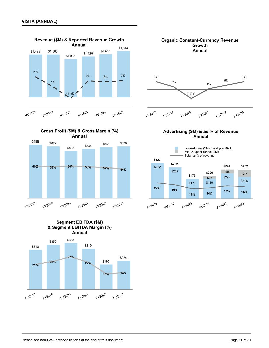 VISTA (ANNUAL) Revenue ($M) & Reported Revenue Growth Annual $1,499 $1,508 $1,337 $1,428 $1,515 $1,614 11% 1% (11)% 7% 6% 7% FY2018 FY2019 FY2020 FY2021 FY2022 FY2023 Gross Profit ($M) & Gross Margin (%) Annual $898 $879 $802 $834 $865 $876 60% 58% 60% 58% 57% 54% FY2018 FY2019 FY2020 FY2021 FY2022 FY2023 Segment EBITDA ($M) & Segment EBITDA Margin (%) Annual $310 $350 $363 $319 $195 $224 21% 23% 27% 22% 13% 14% FY2018 FY2019 FY2020 FY2021 FY2022 FY2023 Organic Constant-Currency Revenue Growth Annual 9% 3% (10)% 1% 5% 9% FY2018 FY2019 FY2020 FY2021 FY2022 FY2023 Advertising ($M) & as % of Revenue Annual $322 $282 $177 $206 $264 $262$322 $282 $177 $180 $229 $195 $26 $34 $67 22% 19% 13% 14% 17% 16% Lower-funnel ($M) [Total pre-2021] Mid- & upper-funnel ($M) Total as % of revenue FY2018 FY2019 FY2020 FY2021 FY2022 FY2023 Please see non-GAAP reconciliations at the end of this document. Page 11 of 31