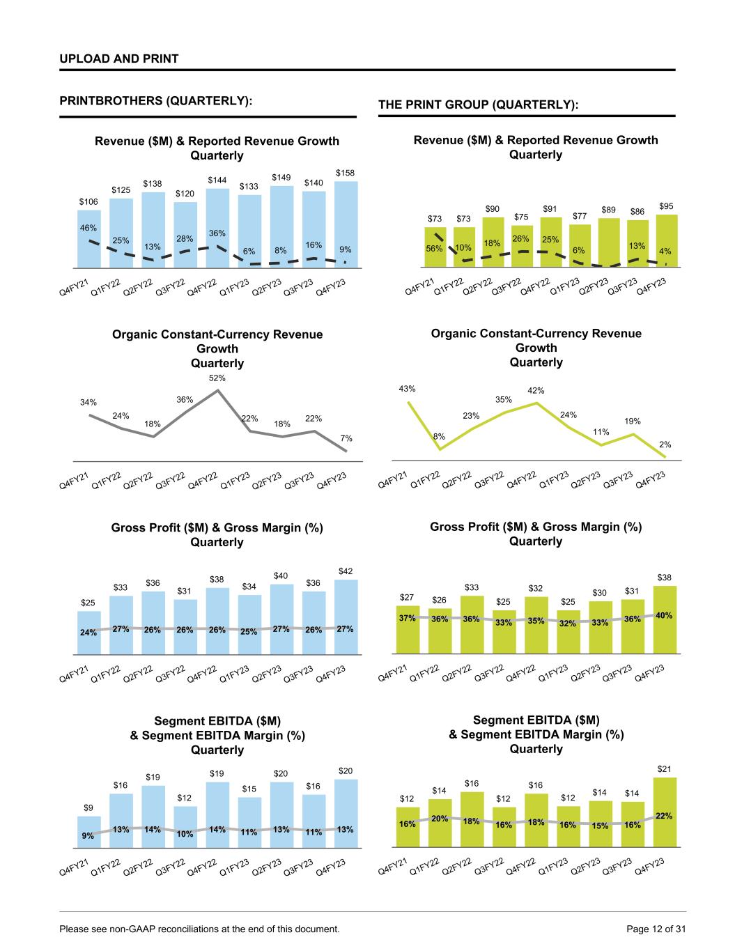 UPLOAD AND PRINT PRINTBROTHERS (QUARTERLY): Revenue ($M) & Reported Revenue Growth Quarterly $106 $125 $138 $120 $144 $133 $149 $140 $158 46% 25% 13% 28% 36% 6% 8% 16% 9% Q4FY21 Q1FY22 Q2FY22 Q3FY22 Q4FY22 Q1FY23 Q2FY23 Q3FY23 Q4FY23 Organic Constant-Currency Revenue Growth Quarterly 34% 24% 18% 36% 52% 22% 18% 22% 7% Q4FY21 Q1FY22 Q2FY22 Q3FY22 Q4FY22 Q1FY23 Q2FY23 Q3FY23 Q4FY23 Gross Profit ($M) & Gross Margin (%) Quarterly $25 $33 $36 $31 $38 $34 $40 $36 $42 24% 27% 26% 26% 26% 25% 27% 26% 27% Q4FY21 Q1FY22 Q2FY22 Q3FY22 Q4FY22 Q1FY23 Q2FY23 Q3FY23 Q4FY23 Segment EBITDA ($M) & Segment EBITDA Margin (%) Quarterly $9 $16 $19 $12 $19 $15 $20 $16 $20 9% 13% 14% 10% 14% 11% 13% 11% 13% Q4FY21 Q1FY22 Q2FY22 Q3FY22 Q4FY22 Q1FY23 Q2FY23 Q3FY23 Q4FY23 THE PRINT GROUP (QUARTERLY): Revenue ($M) & Reported Revenue Growth Quarterly $73 $73 $90 $75 $91 $77 $89 $86 $95 56% 10% 18% 26% 25% 6% 13% 4% Q4FY21 Q1FY22 Q2FY22 Q3FY22 Q4FY22 Q1FY23 Q2FY23 Q3FY23 Q4FY23 0 100 Organic Constant-Currency Revenue Growth Quarterly 43% 8% 23% 35% 42% 24% 11% 19% 2% Q4FY21 Q1FY22 Q2FY22 Q3FY22 Q4FY22 Q1FY23 Q2FY23 Q3FY23 Q4FY23 Gross Profit ($M) & Gross Margin (%) Quarterly $27 $26 $33 $25 $32 $25 $30 $31 $38 37% 36% 36% 33% 35% 32% 33% 36% 40% Q4FY21 Q1FY22 Q2FY22 Q3FY22 Q4FY22 Q1FY23 Q2FY23 Q3FY23 Q4FY23 Segment EBITDA ($M) & Segment EBITDA Margin (%) Quarterly $12 $14 $16 $12 $16 $12 $14 $14 $21 16% 20% 18% 16% 18% 16% 15% 16% 22% Q4FY21 Q1FY22 Q2FY22 Q3FY22 Q4FY22 Q1FY23 Q2FY23 Q3FY23 Q4FY23 Please see non-GAAP reconciliations at the end of this document. Page 12 of 31