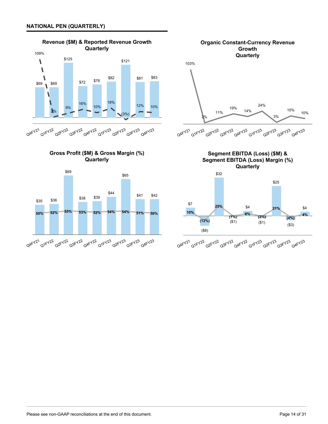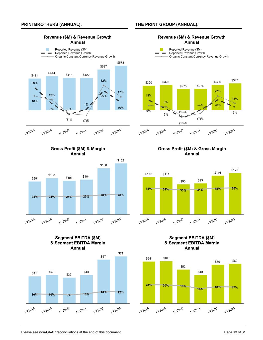 PRINTBROTHERS (ANNUAL): Revenue ($M) & Revenue Growth Annual $411 $444 $418 $422 $527 $578 29% 8% (6)% 1% 25% 10% 18% 13% (5)% (7)% 32% 17% Reported Revenue ($M) Reported Revenue Growth Organic Constant Currency Revenue Growth FY2018 FY2019 FY2020 FY2021 FY2022 FY2023 Gross Profit ($M) & Margin Annual $99 $108 $101 $104 $138 $152 24% 24% 24% 25% 26% 26% FY2018 FY2019 FY2020 FY2021 FY2022 FY2023 Segment EBITDA ($M) & Segment EBITDA Margin Annual $41 $43 $39 $43 $67 $71 10% 10% 9% 10% 13% 12% FY2018 FY2019 FY2020 FY2021 FY2022 FY2023 THE PRINT GROUP (ANNUAL): Revenue ($M) & Revenue Growth Annual $320 $326 $275 $276 $330 $347 19% 2% (16)% —% 20% 5%9% 6% (13)% (7)% 27% 13% Reported Revenue ($M) Reported Revenue Growth Organic Constant Currency Revenue Growth FY2018 FY2019 FY2020 FY2021 FY2022 FY2023 Gross Profit ($M) & Gross Margin Annual $112 $111 $90 $93 $116 $123 35% 34% 33% 34% 35% 36% FY2018 FY2019 FY2020 FY2021 FY2022 FY2023 Segment EBITDA ($M) & Segment EBITDA Margin Annual $64 $64 $52 $43 $59 $60 20% 20% 19% 16% 18% 17% FY2018 FY2019 FY2020 FY2021 FY2022 FY2023 Please see non-GAAP reconciliations at the end of this document. Page 13 of 31