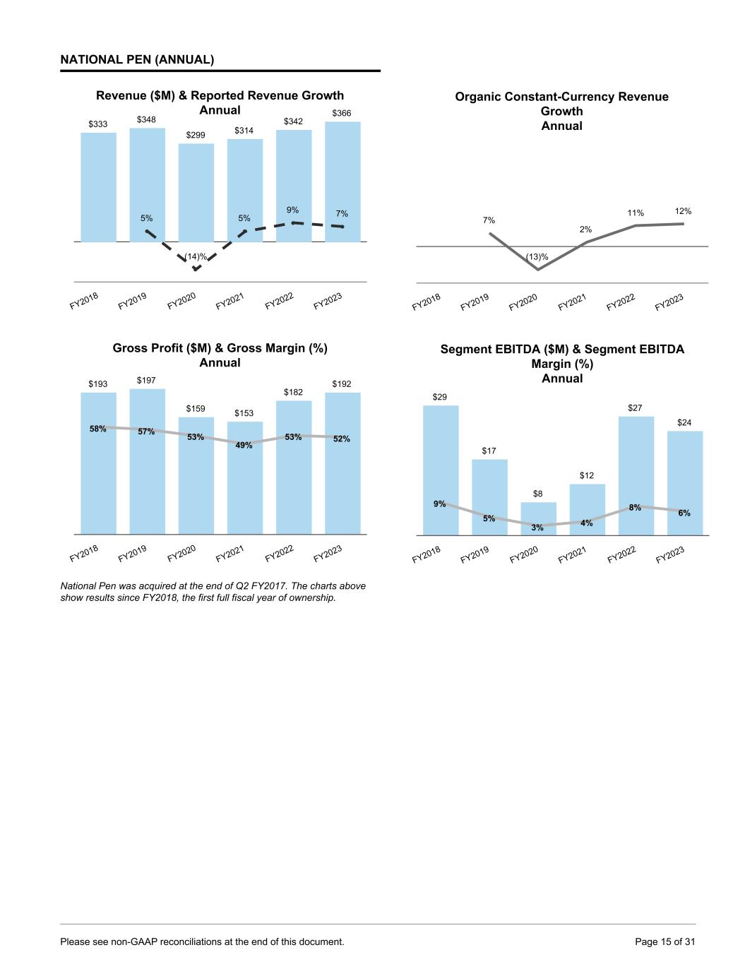 NATIONAL PEN (QUARTERLY) Revenue ($M) & Reported Revenue Growth Quarterly $69 $69 $125 $72 $76 $82 $121 $81 $83 109% 2% 9% 16% 10% 18% (3%) 12% 10% Q4FY21 Q1FY22 Q2FY22 Q3FY22 Q4FY22 Q1FY23 Q2FY23 Q3FY23 Q4FY23 Gross Profit ($M) & Gross Margin (%) Quarterly $35 $36 $69 $38 $39 $44 $65 $41 $42 50% 52% 55% 53% 52% 54% 54% 51% 50% Q4FY21 Q1FY22 Q2FY22 Q3FY22 Q4FY22 Q1FY23 Q2FY23 Q3FY23 Q4FY23 Organic Constant-Currency Revenue Growth Quarterly 103% 2% 11% 19% 14% 24% 3% 15% 10% Q4FY21 Q1FY22 Q2FY22 Q3FY22 Q4FY22 Q1FY23 Q2FY23 Q3FY23 Q4FY23 Segment EBITDA (Loss) ($M) & Segment EBITDA (Loss) Margin (%) Quarterly $7 ($8) $32 ($1) $4 ($1) $25 ($3) $4 10% (12%) 25% (1%) 6% (2%) 21% (4%) 4% Q4FY21 Q1FY22 Q2FY22 Q3FY22 Q4FY22 Q1FY23 Q2FY23 Q3FY23 Q4FY23 Please see non-GAAP reconciliations at the end of this document. Page 14 of 31