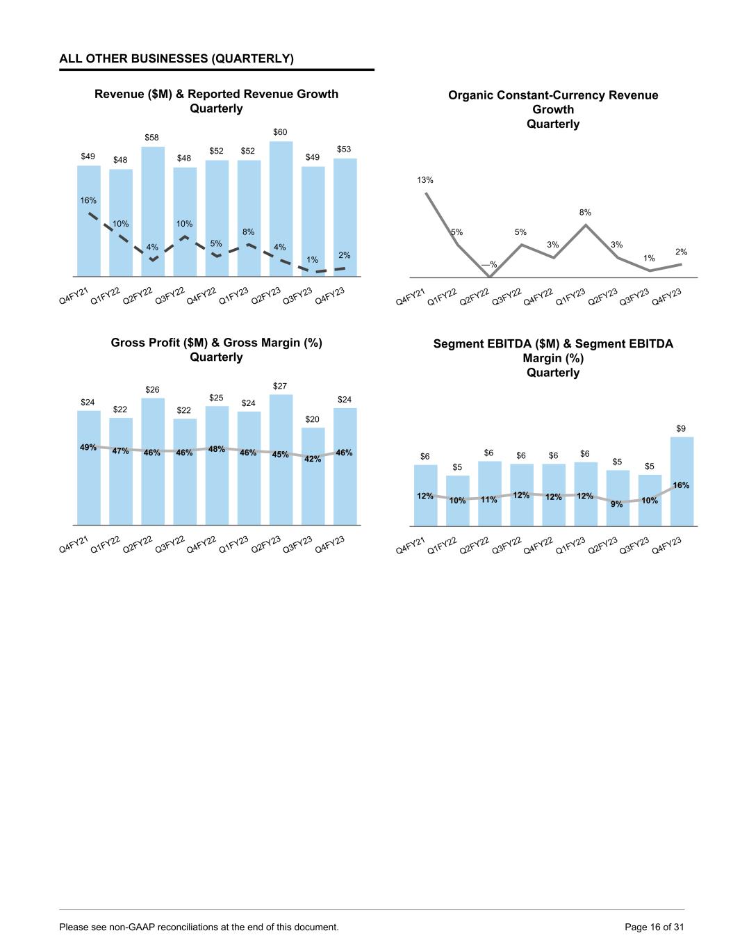 ALL OTHER BUSINESSES (QUARTERLY) Revenue ($M) & Reported Revenue Growth Quarterly $49 $48 $58 $48 $52 $52 $60 $49 $53 16% 10% 4% 10% 5% 8% 4% 1% 2% Q4FY21 Q1FY22 Q2FY22 Q3FY22 Q4FY22 Q1FY23 Q2FY23 Q3FY23 Q4FY23 Gross Profit ($M) & Gross Margin (%) Quarterly $24 $22 $26 $22 $25 $24 $27 $20 $24 49% 47% 46% 46% 48% 46% 45% 42% 46% Q4FY21 Q1FY22 Q2FY22 Q3FY22 Q4FY22 Q1FY23 Q2FY23 Q3FY23 Q4FY23 Organic Constant-Currency Revenue Growth Quarterly 13% 5% —% 5% 3% 8% 3% 1% 2% Q4FY21 Q1FY22 Q2FY22 Q3FY22 Q4FY22 Q1FY23 Q2FY23 Q3FY23 Q4FY23 Segment EBITDA ($M) & Segment EBITDA Margin (%) Quarterly $6 $5 $6 $6 $6 $6 $5 $5 $9 12% 10% 11% 12% 12% 12% 9% 10% 16% Q4FY21 Q1FY22 Q2FY22 Q3FY22 Q4FY22 Q1FY23 Q2FY23 Q3FY23 Q4FY23 Please see non-GAAP reconciliations at the end of this document. Page 16 of 31
