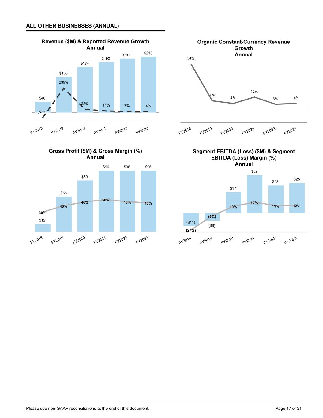 ALL OTHER BUSINESSES (ANNUAL) Revenue ($M) & Reported Revenue Growth Annual $40 $136 $174 $192 $206 $213 (57%) 239% 28% 11% 7% 4% FY2018 FY2019 FY2020 FY2021 FY2022 FY2023 Gross Profit ($M) & Gross Margin (%) Annual $12 $55 $80 $96 $96 $96 30% 40% 46% 50% 46% 45% FY2018 FY2019 FY2020 FY2021 FY2022 FY2023 Organic Constant-Currency Revenue Growth Annual 54% 7% 4% 12% 3% 4% FY2018 FY2019 FY2020 FY2021 FY2022 FY2023 Segment EBITDA (Loss) ($M) & Segment EBITDA (Loss) Margin (%) Annual ($11) ($6) $17 $32 $23 $25 (27%) (5%) 10% 17% 11% 12% FY2018 FY2019 FY2020 FY2021 FY2022 FY2023 Please see non-GAAP reconciliations at the end of this document. Page 17 of 31