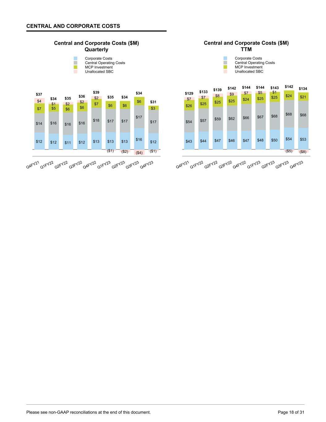 CENTRAL AND CORPORATE COSTS Central and Corporate Costs ($M) Quarterly $12 $12 $11 $12 $13 $13 $13 $16 $12 $14 $16 $16 $16 $18 $17 $17 $17 $17 $7 $5 $6 $6 $7 $6 $6 $6 $3 $4 $1 $2 $2 $2 ($1) ($2) ($4) ($1) $37 $34 $35 $36 $39 $35 $34 $34 $31 Corporate Costs Central Operating Costs MCP Investment Unallocated SBC Q4FY21 Q1FY22 Q2FY22 Q3FY22 Q4FY22 Q1FY23 Q2FY23 Q3FY23 Q4FY23 Central and Corporate Costs ($M) TTM $43 $44 $47 $46 $47 $48 $50 $54 $53 $54 $57 $59 $62 $66 $67 $68 $68 $68 $26 $25 $25 $25 $24 $25 $25 $24 $21$7 $7 $8 $9 $7 $5 $1 ($5) ($8) $129 $133 $139 $142 $144 $144 $143 $142 $134 Corporate Costs Central Operating Costs MCP Investment Unallocated SBC Q4FY21 Q1FY22 Q2FY22 Q3FY22 Q4FY22 Q1FY23 Q2FY23 Q3FY23 Q4FY23 Please see non-GAAP reconciliations at the end of this document. Page 18 of 31