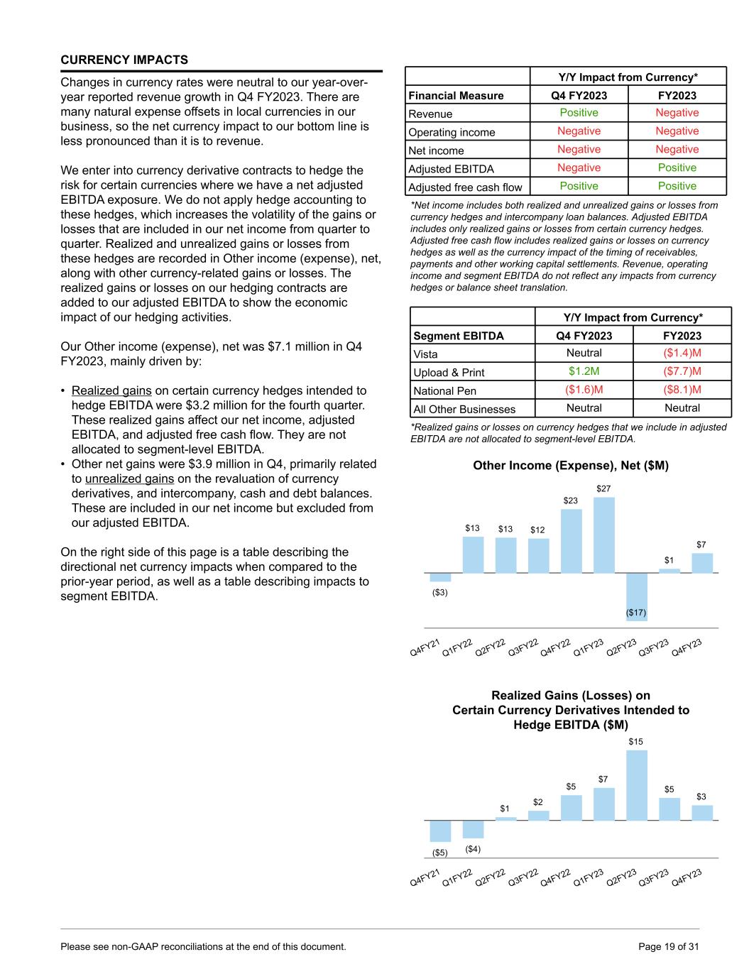 CURRENCY IMPACTS Changes in currency rates were neutral to our year-over- year reported revenue growth in Q4 FY2023. There are many natural expense offsets in local currencies in our business, so the net currency impact to our bottom line is less pronounced than it is to revenue. We enter into currency derivative contracts to hedge the risk for certain currencies where we have a net adjusted EBITDA exposure. We do not apply hedge accounting to these hedges, which increases the volatility of the gains or losses that are included in our net income from quarter to quarter. Realized and unrealized gains or losses from these hedges are recorded in Other income (expense), net, along with other currency-related gains or losses. The realized gains or losses on our hedging contracts are added to our adjusted EBITDA to show the economic impact of our hedging activities. Our Other income (expense), net was $7.1 million in Q4 FY2023, mainly driven by: • Realized gains on certain currency hedges intended to hedge EBITDA were $3.2 million for the fourth quarter. These realized gains affect our net income, adjusted EBITDA, and adjusted free cash flow. They are not allocated to segment-level EBITDA. • Other net gains were $3.9 million in Q4, primarily related to unrealized gains on the revaluation of currency derivatives, and intercompany, cash and debt balances. These are included in our net income but excluded from our adjusted EBITDA. On the right side of this page is a table describing the directional net currency impacts when compared to the prior-year period, as well as a table describing impacts to segment EBITDA. Y/Y Impact from Currency* Financial Measure Q4 FY2023 FY2023 Revenue Positive Negative Operating income Negative Negative Net income Negative Negative Adjusted EBITDA Negative Positive Adjusted free cash flow Positive Positive *Net income includes both realized and unrealized gains or losses from currency hedges and intercompany loan balances. Adjusted EBITDA includes only realized gains or losses from certain currency hedges. Adjusted free cash flow includes realized gains or losses on currency hedges as well as the currency impact of the timing of receivables, payments and other working capital settlements. Revenue, operating income and segment EBITDA do not reflect any impacts from currency hedges or balance sheet translation. Y/Y Impact from Currency* Segment EBITDA Q4 FY2023 FY2023 Vista Neutral ($1.4)M Upload & Print $1.2M ($7.7)M National Pen ($1.6)M ($8.1)M All Other Businesses Neutral Neutral *Realized gains or losses on currency hedges that we include in adjusted EBITDA are not allocated to segment-level EBITDA. Other Income (Expense), Net ($M) ($3) $13 $13 $12 $23 $27 ($17) $1 $7 Q4FY21 Q1FY22 Q2FY22 Q3FY22 Q4FY22 Q1FY23 Q2FY23 Q3FY23 Q4FY23 Realized Gains (Losses) on Certain Currency Derivatives Intended to Hedge EBITDA ($M) ($5) ($4) $1 $2 $5 $7 $15 $5 $3 Q4FY21 Q1FY22 Q2FY22 Q3FY22 Q4FY22 Q1FY23 Q2FY23 Q3FY23 Q4FY23 Please see non-GAAP reconciliations at the end of this document. Page 19 of 31