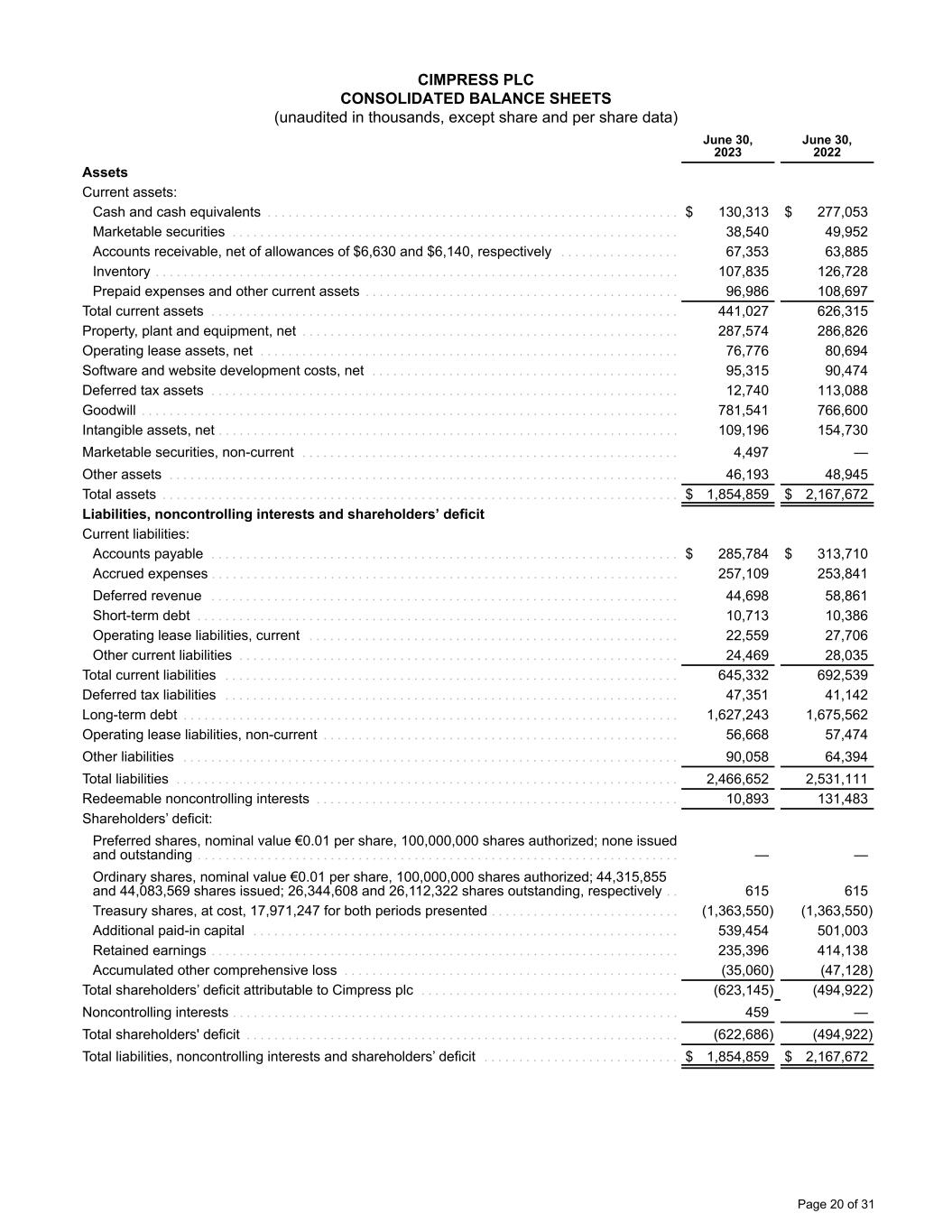 CIMPRESS PLC CONSOLIDATED BALANCE SHEETS (unaudited in thousands, except share and per share data) June 30, 2023 June 30, 2022 Assets Current assets: Cash and cash equivalents . . . . . . . . . . . . . . . . . . . . . . . . . . . . . . . . . . . . . . . . . . . . . . . . . . . . . . . . . . . $ 130,313 $ 277,053 Marketable securities . . . . . . . . . . . . . . . . . . . . . . . . . . . . . . . . . . . . . . . . . . . . . . . . . . . . . . . . . . . . . . . . 38,540 49,952 Accounts receivable, net of allowances of $6,630 and $6,140, respectively . . . . . . . . . . . . . . . . . 67,353 63,885 Inventory . . . . . . . . . . . . . . . . . . . . . . . . . . . . . . . . . . . . . . . . . . . . . . . . . . . . . . . . . . . . . . . . . . . . . . . . . . . 107,835 126,728 Prepaid expenses and other current assets . . . . . . . . . . . . . . . . . . . . . . . . . . . . . . . . . . . . . . . . . . . . . 96,986 108,697 Total current assets . . . . . . . . . . . . . . . . . . . . . . . . . . . . . . . . . . . . . . . . . . . . . . . . . . . . . . . . . . . . . . . . . . . 441,027 626,315 Property, plant and equipment, net . . . . . . . . . . . . . . . . . . . . . . . . . . . . . . . . . . . . . . . . . . . . . . . . . . . . . . 287,574 286,826 Operating lease assets, net . . . . . . . . . . . . . . . . . . . . . . . . . . . . . . . . . . . . . . . . . . . . . . . . . . . . . . . . . . . . 76,776 80,694 Software and website development costs, net . . . . . . . . . . . . . . . . . . . . . . . . . . . . . . . . . . . . . . . . . . . . 95,315 90,474 Deferred tax assets . . . . . . . . . . . . . . . . . . . . . . . . . . . . . . . . . . . . . . . . . . . . . . . . . . . . . . . . . . . . . . . . . . . 12,740 113,088 Goodwill . . . . . . . . . . . . . . . . . . . . . . . . . . . . . . . . . . . . . . . . . . . . . . . . . . . . . . . . . . . . . . . . . . . . . . . . . . . . . 781,541 766,600 Intangible assets, net . . . . . . . . . . . . . . . . . . . . . . . . . . . . . . . . . . . . . . . . . . . . . . . . . . . . . . . . . . . . . . . . . . 109,196 154,730 Marketable securities, non-current . . . . . . . . . . . . . . . . . . . . . . . . . . . . . . . . . . . . . . . . . . . . . . . . . . . . . . 4,497 — Other assets . . . . . . . . . . . . . . . . . . . . . . . . . . . . . . . . . . . . . . . . . . . . . . . . . . . . . . . . . . . . . . . . . . . . . . . . . 46,193 48,945 Total assets . . . . . . . . . . . . . . . . . . . . . . . . . . . . . . . . . . . . . . . . . . . . . . . . . . . . . . . . . . . . . . . . . . . . . . . . . . $ 1,854,859 $ 2,167,672 Liabilities, noncontrolling interests and shareholders’ deficit Current liabilities: Accounts payable . . . . . . . . . . . . . . . . . . . . . . . . . . . . . . . . . . . . . . . . . . . . . . . . . . . . . . . . . . . . . . . . . . . $ 285,784 $ 313,710 Accrued expenses . . . . . . . . . . . . . . . . . . . . . . . . . . . . . . . . . . . . . . . . . . . . . . . . . . . . . . . . . . . . . . . . . . . 257,109 253,841 Deferred revenue . . . . . . . . . . . . . . . . . . . . . . . . . . . . . . . . . . . . . . . . . . . . . . . . . . . . . . . . . . . . . . . . . . . 44,698 58,861 Short-term debt . . . . . . . . . . . . . . . . . . . . . . . . . . . . . . . . . . . . . . . . . . . . . . . . . . . . . . . . . . . . . . . . . . . . . 10,713 10,386 Operating lease liabilities, current . . . . . . . . . . . . . . . . . . . . . . . . . . . . . . . . . . . . . . . . . . . . . . . . . . . . . 22,559 27,706 Other current liabilities . . . . . . . . . . . . . . . . . . . . . . . . . . . . . . . . . . . . . . . . . . . . . . . . . . . . . . . . . . . . . . . 24,469 28,035 Total current liabilities . . . . . . . . . . . . . . . . . . . . . . . . . . . . . . . . . . . . . . . . . . . . . . . . . . . . . . . . . . . . . . . . . 645,332 692,539 Deferred tax liabilities . . . . . . . . . . . . . . . . . . . . . . . . . . . . . . . . . . . . . . . . . . . . . . . . . . . . . . . . . . . . . . . . . 47,351 41,142 Long-term debt . . . . . . . . . . . . . . . . . . . . . . . . . . . . . . . . . . . . . . . . . . . . . . . . . . . . . . . . . . . . . . . . . . . . . . . 1,627,243 1,675,562 Operating lease liabilities, non-current . . . . . . . . . . . . . . . . . . . . . . . . . . . . . . . . . . . . . . . . . . . . . . . . . . . 56,668 57,474 Other liabilities . . . . . . . . . . . . . . . . . . . . . . . . . . . . . . . . . . . . . . . . . . . . . . . . . . . . . . . . . . . . . . . . . . . . . . . 90,058 64,394 Total liabilities . . . . . . . . . . . . . . . . . . . . . . . . . . . . . . . . . . . . . . . . . . . . . . . . . . . . . . . . . . . . . . . . . . . . . . . . 2,466,652 2,531,111 Redeemable noncontrolling interests . . . . . . . . . . . . . . . . . . . . . . . . . . . . . . . . . . . . . . . . . . . . . . . . . . . . 10,893 131,483 Shareholders’ deficit: Preferred shares, nominal value €0.01 per share, 100,000,000 shares authorized; none issued and outstanding . . . . . . . . . . . . . . . . . . . . . . . . . . . . . . . . . . . . . . . . . . . . . . . . . . . . . . . . . . . . . . . . . . . . . — — Ordinary shares, nominal value €0.01 per share, 100,000,000 shares authorized; 44,315,855 and 44,083,569 shares issued; 26,344,608 and 26,112,322 shares outstanding, respectively . . 615 615 Treasury shares, at cost, 17,971,247 for both periods presented . . . . . . . . . . . . . . . . . . . . . . . . . . . (1,363,550) (1,363,550) Additional paid-in capital . . . . . . . . . . . . . . . . . . . . . . . . . . . . . . . . . . . . . . . . . . . . . . . . . . . . . . . . . . . . . 539,454 501,003 Retained earnings . . . . . . . . . . . . . . . . . . . . . . . . . . . . . . . . . . . . . . . . . . . . . . . . . . . . . . . . . . . . . . . . . . . 235,396 414,138 Accumulated other comprehensive loss . . . . . . . . . . . . . . . . . . . . . . . . . . . . . . . . . . . . . . . . . . . . . . . . (35,060) (47,128) Total shareholders’ deficit attributable