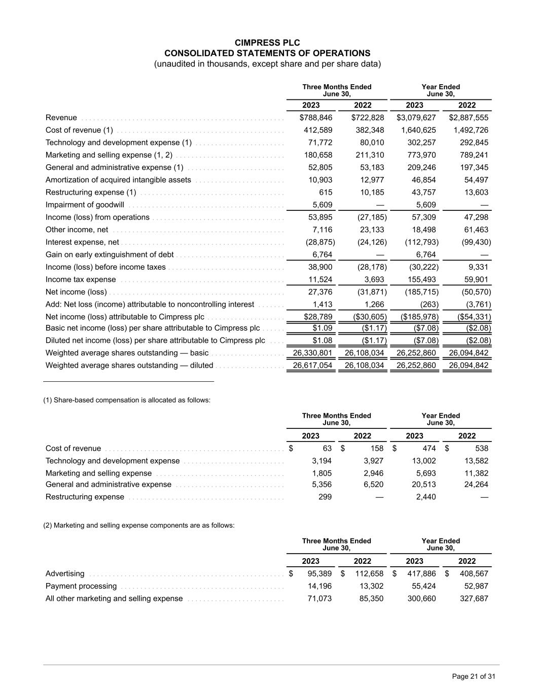 CIMPRESS PLC CONSOLIDATED STATEMENTS OF OPERATIONS (unaudited in thousands, except share and per share data) Three Months Ended June 30, Year Ended June 30, 2023 2022 2023 2022 Revenue . . . . . . . . . . . . . . . . . . . . . . . . . . . . . . . . . . . . . . . . . . . . . . . . . . . . $788,846 $722,828 $3,079,627 $2,887,555 Cost of revenue (1) . . . . . . . . . . . . . . . . . . . . . . . . . . . . . . . . . . . . . . . . . . . 412,589 382,348 1,640,625 1,492,726 Technology and development expense (1) . . . . . . . . . . . . . . . . . . . . . . . 71,772 80,010 302,257 292,845 Marketing and selling expense (1, 2) . . . . . . . . . . . . . . . . . . . . . . . . . . . . 180,658 211,310 773,970 789,241 General and administrative expense (1) . . . . . . . . . . . . . . . . . . . . . . . . . 52,805 53,183 209,246 197,345 Amortization of acquired intangible assets . . . . . . . . . . . . . . . . . . . . . . . 10,903 12,977 46,854 54,497 Restructuring expense (1) . . . . . . . . . . . . . . . . . . . . . . . . . . . . . . . . . . . . . 615 10,185 43,757 13,603 Impairment of goodwill . . . . . . . . . . . . . . . . . . . . . . . . . . . . . . . . . . . . . . . . 5,609 — 5,609 — Income (loss) from operations . . . . . . . . . . . . . . . . . . . . . . . . . . . . . . . . . . 53,895 (27,185) 57,309 47,298 Other income, net . . . . . . . . . . . . . . . . . . . . . . . . . . . . . . . . . . . . . . . . . . . . 7,116 23,133 18,498 61,463 Interest expense, net . . . . . . . . . . . . . . . . . . . . . . . . . . . . . . . . . . . . . . . . . . (28,875) (24,126) (112,793) (99,430) Gain on early extinguishment of debt . . . . . . . . . . . . . . . . . . . . . . . . . . . . 6,764 — 6,764 — Income (loss) before income taxes . . . . . . . . . . . . . . . . . . . . . . . . . . . . . . 38,900 (28,178) (30,222) 9,331 Income tax expense . . . . . . . . . . . . . . . . . . . . . . . . . . . . . . . . . . . . . . . . . . 11,524 3,693 155,493 59,901 Net income (loss) . . . . . . . . . . . . . . . . . . . . . . . . . . . . . . . . . . . . . . . . . . . . . 27,376 (31,871) (185,715) (50,570) Add: Net loss (income) attributable to noncontrolling interest . . . . . . . 1,413 1,266 (263) (3,761) Net income (loss) attributable to Cimpress plc . . . . . . . . . . . . . . . . . . . . $28,789 ($30,605) ($185,978) ($54,331) Basic net income (loss) per share attributable to Cimpress plc . . . . . . $1.09 ($1.17) ($7.08) ($2.08) Diluted net income (loss) per share attributable to Cimpress plc . . . . $1.08 ($1.17) ($7.08) ($2.08) Weighted average shares outstanding — basic . . . . . . . . . . . . . . . . . . . 26,330,801 26,108,034 26,252,860 26,094,842 Weighted average shares outstanding — diluted . . . . . . . . . . . . . . . . . . 26,617,054 26,108,034 26,252,860 26,094,842 ____________________________________________ (1) Share-based compensation is allocated as follows: Three Months Ended June 30, Year Ended June 30, 2023 2022 2023 2022 Cost of revenue . . . . . . . . . . . . . . . . . . . . . . . . . . . . . . . . . . . . . . . . . . . . . . $ 63 $ 158 $ 474 $ 538 Technology and development expense . . . . . . . . . . . . . . . . . . . . . . . . . . 3,194 3,927 13,002 13,582 Marketing and selling expense . . . . . . . . . . . . . . . . . . . . . . . . . . . . . . . . . 1,805 2,946 5,693 11,382 General and administrative expense . . . . . . . . . . . . . . . . . . . . . . . . . . . . 5,356 6,520 20,513 24,264 Restructuring expense . . . . . . . . . . . . . . . . . . . . . . . . . . . . . . . . . . . . . . . . 299 — 2,440 — (2) Marketing and selling expense components are as follows: Three Months Ended June 30, Year Ended June 30, 2023 2022 2023 2022 Advertising . . . . . . . . . . . . . . . . . . . . . . . . . . . . . . . . . . . . . . . . . . . . . . . . . . $ 95,389 $ 112,658 $ 417,886 $ 408,567 Payment processing . . . . . . . . . . . . . . . . . . . . . . . . . . . . . . . . . . . . . . . . . . 14,196 13,302 55,424 52,987 All other marketing and selling expense . . . . . . . . . . . . . . . . . . . . . . . . . 71,073 85,350 300,660 327,687 Page 21 of 31