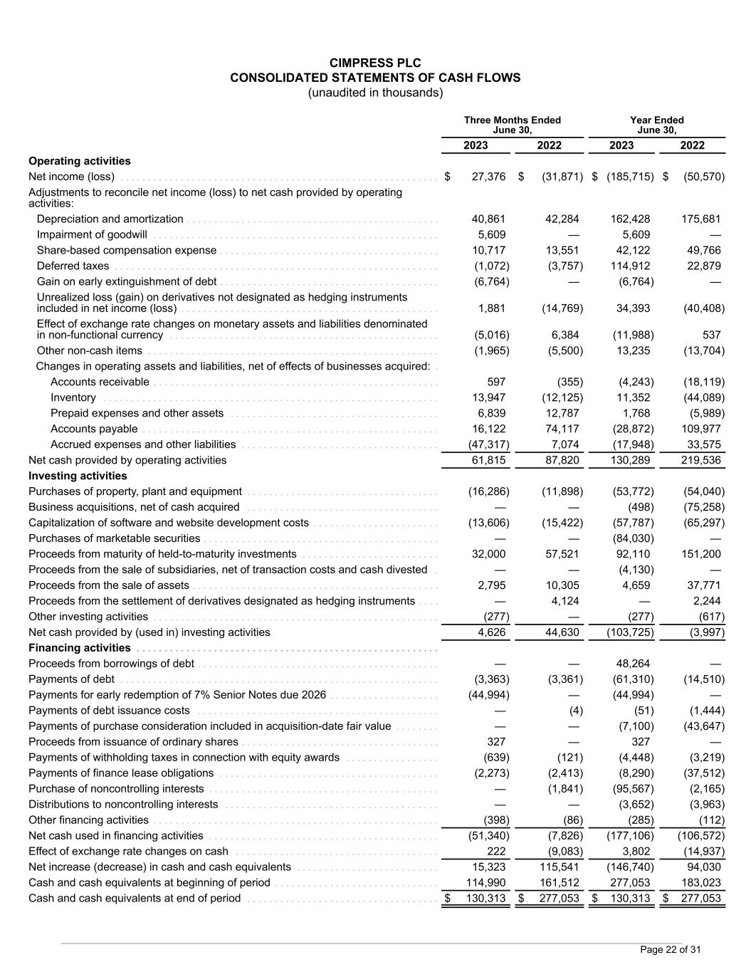 CIMPRESS PLC CONSOLIDATED STATEMENTS OF CASH FLOWS (unaudited in thousands) Three Months Ended June 30, Year Ended June 30, 2023 2022 2023 2022 Operating activities Net income (loss) . . . . . . . . . . . . . . . . . . . . . . . . . . . . . . . . . . . . . . . . . . . . . . . . . . . . . . . . . . $ 27,376 $ (31,871) $ (185,715) $ (50,570) Adjustments to reconcile net income (loss) to net cash provided by operating activities: Depreciation and amortization . . . . . . . . . . . . . . . . . . . . . . . . . . . . . . . . . . . . . . . . . . . . . . 40,861 42,284 162,428 175,681 Impairment of goodwill . . . . . . . . . . . . . . . . . . . . . . . . . . . . . . . . . . . . . . . . . . . . . . . . . . . . 5,609 — 5,609 — Share-based compensation expense . . . . . . . . . . . . . . . . . . . . . . . . . . . . . . . . . . . . . . . . 10,717 13,551 42,122 49,766 Deferred taxes . . . . . . . . . . . . . . . . . . . . . . . . . . . . . . . . . . . . . . . . . . . . . . . . . . . . . . . . . . . (1,072) (3,757) 114,912 22,879 Gain on early extinguishment of debt . . . . . . . . . . . . . . . . . . . . . . . . . . . . . . . . . . . . . . . . (6,764) — (6,764) — Unrealized loss (gain) on derivatives not designated as hedging instruments included in net income (loss) . . . . . . . . . . . . . . . . . . . . . . . . . . . . . . . . . . . . . . . . . . . . . . . 1,881 (14,769) 34,393 (40,408) Effect of exchange rate changes on monetary assets and liabilities denominated in non-functional currency . . . . . . . . . . . . . . . . . . . . . . . . . . . . . . . . . . . . . . . . . . . . . . . . . (5,016) 6,384 (11,988) 537 Other non-cash items . . . . . . . . . . . . . . . . . . . . . . . . . . . . . . . . . . . . . . . . . . . . . . . . . . . . . (1,965) (5,500) 13,235 (13,704) Changes in operating assets and liabilities, net of effects of businesses acquired: . Accounts receivable . . . . . . . . . . . . . . . . . . . . . . . . . . . . . . . . . . . . . . . . . . . . . . . . . . . . 597 (355) (4,243) (18,119) Inventory . . . . . . . . . . . . . . . . . . . . . . . . . . . . . . . . . . . . . . . . . . . . . . . . . . . . . . . . . . . . . 13,947 (12,125) 11,352 (44,089) Prepaid expenses and other assets . . . . . . . . . . . . . . . . . . . . . . . . . . . . . . . . . . . . . . 6,839 12,787 1,768 (5,989) Accounts payable . . . . . . . . . . . . . . . . . . . . . . . . . . . . . . . . . . . . . . . . . . . . . . . . . . . . . . 16,122 74,117 (28,872) 109,977 Accrued expenses and other liabilities . . . . . . . . . . . . . . . . . . . . . . . . . . . . . . . . . . . . (47,317) 7,074 (17,948) 33,575 Net cash provided by operating activities 61,815 87,820 130,289 219,536 Investing activities Purchases of property, plant and equipment . . . . . . . . . . . . . . . . . . . . . . . . . . . . . . . . . . . (16,286) (11,898) (53,772) (54,040) Business acquisitions, net of cash acquired . . . . . . . . . . . . . . . . . . . . . . . . . . . . . . . . . . . — — (498) (75,258) Capitalization of software and website development costs . . . . . . . . . . . . . . . . . . . . . . . (13,606) (15,422) (57,787) (65,297) Purchases of marketable securities . . . . . . . . . . . . . . . . . . . . . . . . . . . . . . . . . . . . . . . . . . . — — (84,030) — Proceeds from maturity of held-to-maturity investments . . . . . . . . . . . . . . . . . . . . . . . . . 32,000 57,521 92,110 151,200 Proceeds from the sale of subsidiaries, net of transaction costs and cash divested . — — (4,130) — Proceeds from the sale of assets . . . . . . . . . . . . . . . . . . . . . . . . . . . . . . . . . . . . . . . . . . . . . 2,795 10,305 4,659 37,771 Proceeds from the settlement of derivatives designated as hedging instruments . . . . — 4,124 — 2,244 Other investing activities . . . . . . . . . . . . . . . . . . . . . . . . . . . . . . . . . . . . . . . . . . . . . . . . . . . . (277) — (277) (617) Net cash provided by (used in) investing activities 4,626 44,630 (103,725) (3,997) Financing activities . . . . . . . . . . . . . . . . . . . . . . . . . . . . . . . . . . . . . . . . . . . . . . . . . . . . . . . Proceeds from borrowings of debt . . . . . . . . . . . . . . . . . . . . . . . . . . . . . . . . . . . . . . . . . . . . — — 48,264 — Payments of debt . . . . . . . . . . . . . . . . . . . . . . . . . . . . . . . . . . . . . . . . . . . . . . . . . . . . . . . . . . (3,363) (3,361) (61,310) (14,510) Payments for early redemption of 7% Senior Notes due 2026 . . . . . . . . . . . . . . . . . . . . (44,994) — (44,994) — Payments of debt issuance costs . . . . . . . . . . . . . . . . . . . . . . . . . . . . . . . . . . . . . . . . . . . . — (4) (51) (1,444) Payments of purchase consideration included in acquisition-date fair value . . . . . . . . — — (7,100) (43,647) Proceeds from issuance of ordinary shares . . . . . . . . . . . . . . . . . . . . . . . . . . . . . . . . . . . . 327 — 327 — Payments of withholding taxes in connection with equity awards . . . . . . . . . . . . . . . . . (639) (121) (4,448) (3,219) Payments of finance lease obligations . . . . . . . . . . . . . . . . . . . . . . . . . . . . . . . . . . . . . . . . (2,273) (2,413) (8,290) (37,512) Purchase of noncontrolling interests . . . . . . . . . . . . . . . . . . . . . . . . . . . . . . . . . . . . . . . . . . — (1,841) (95,567) (2,165) Distributions to noncontrolling interests . . . . . . . . . . . . . . . . . . . . . . . . . . . . . . . . . . . . . . . — — (3,652) (3,963) Other financing activities . . . . . . . . . . . . . . . . . . . . . . . . . . . . . . . . . . . . . . . . . . . . . . . . . . . . (398) (86) (285) (112) Net cash used in financing activities . . . . . . . . . . . . . . . . . . . . . . . . . . . . . . . . . . . . . . . . . . (51,340) (7,826) (177,106) (106,572) Effect of exchange rate changes on cash . . . . . . . . . . . . . . . . . . . . . . . . . . . . . . . . . . . . . 222 (9,083) 3,802 (14,937) Net 