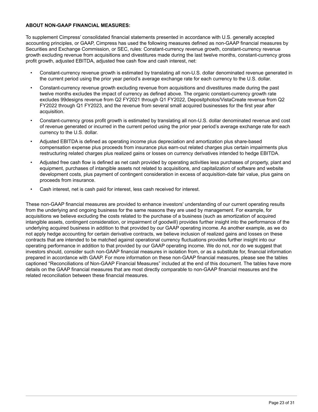 ABOUT NON-GAAP FINANCIAL MEASURES: To supplement Cimpress’ consolidated financial statements presented in accordance with U.S. generally accepted accounting principles, or GAAP, Cimpress has used the following measures defined as non-GAAP financial measures by Securities and Exchange Commission, or SEC, rules: Constant-currency revenue growth, constant-currency revenue growth excluding revenue from acquisitions and divestitures made during the last twelve months, constant-currency gross profit growth, adjusted EBITDA, adjusted free cash flow and cash interest, net: • Constant-currency revenue growth is estimated by translating all non-U.S. dollar denominated revenue generated in the current period using the prior year period’s average exchange rate for each currency to the U.S. dollar. • Constant-currency revenue growth excluding revenue from acquisitions and divestitures made during the past twelve months excludes the impact of currency as defined above. The organic constant-currency growth rate excludes 99designs revenue from Q2 FY2021 through Q1 FY2022, Depositphotos/VistaCreate revenue from Q2 FY2022 through Q1 FY2023, and the revenue from several small acquired businesses for the first year after acquisition. • Constant-currency gross profit growth is estimated by translating all non-U.S. dollar denominated revenue and cost of revenue generated or incurred in the current period using the prior year period’s average exchange rate for each currency to the U.S. dollar. • Adjusted EBITDA is defined as operating income plus depreciation and amortization plus share-based compensation expense plus proceeds from insurance plus earn-out related charges plus certain impairments plus restructuring related charges plus realized gains or losses on currency derivatives intended to hedge EBITDA. • Adjusted free cash flow is defined as net cash provided by operating activities less purchases of property, plant and equipment, purchases of intangible assets not related to acquisitions, and capitalization of software and website development costs, plus payment of contingent consideration in excess of acquisition-date fair value, plus gains on proceeds from insurance. • Cash interest, net is cash paid for interest, less cash received for interest. These non-GAAP financial measures are provided to enhance investors' understanding of our current operating results from the underlying and ongoing business for the same reasons they are used by management. For example, for acquisitions we believe excluding the costs related to the purchase of a business (such as amortization of acquired intangible assets, contingent consideration, or impairment of goodwill) provides further insight into the performance of the underlying acquired business in addition to that provided by our GAAP operating income. As another example, as we do not apply hedge accounting for certain derivative contracts, we believe inclusion of realized gains and losses on these contracts that are intended to be matched against operational currency fluctuations provides further insight into our operating performance in addition to that provided by our GAAP operating income. We do not, nor do we suggest that investors should, consider such non-GAAP financial measures in isolation from, or as a substitute for, financial information prepared in accordance with GAAP. For more information on these non-GAAP financial measures, please see the tables captioned “Reconciliations of Non-GAAP Financial Measures” included at the end of this document. The tables have more details on the GAAP financial measures that are most directly comparable to non-GAAP financial measures and the related reconciliation between these financial measures. Page 23 of 31