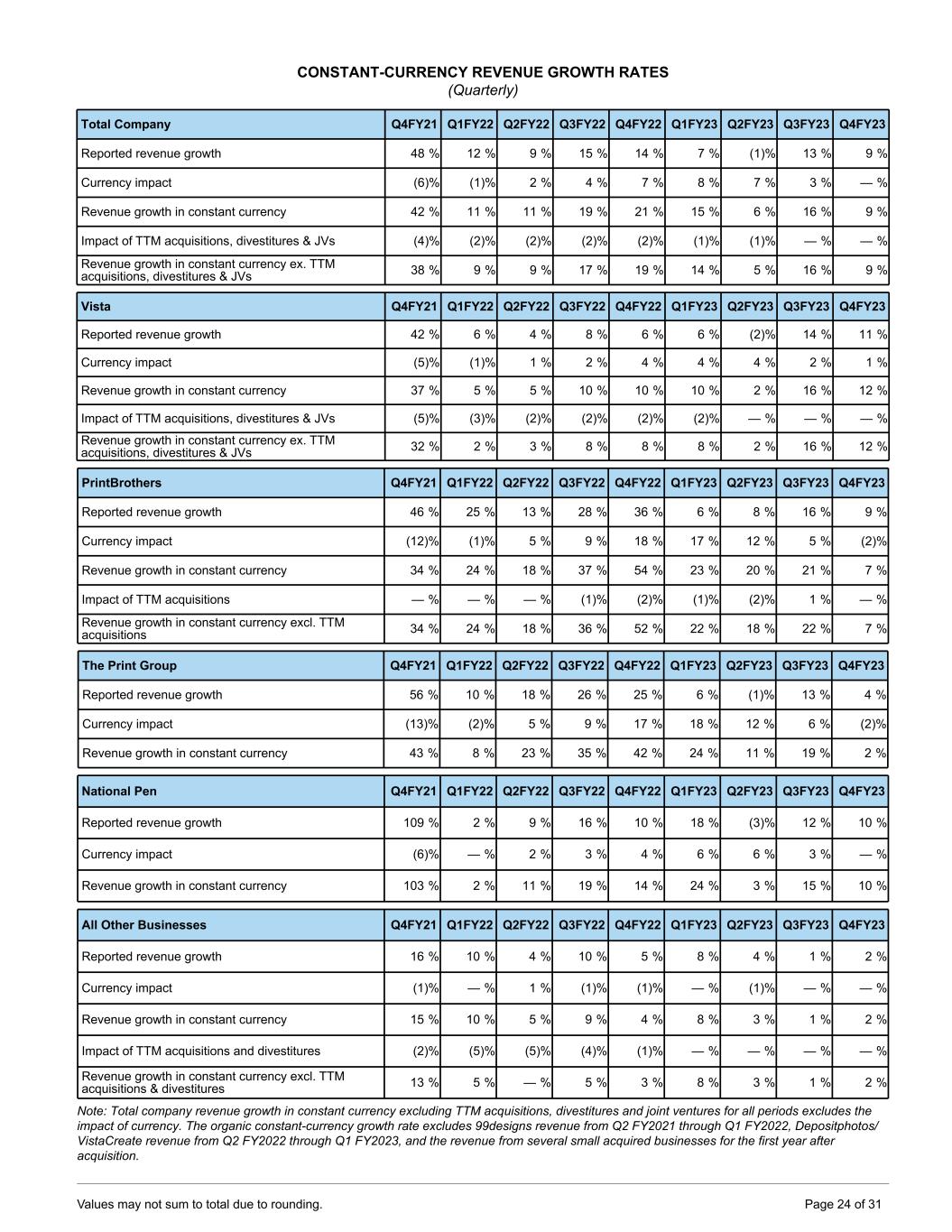 CONSTANT-CURRENCY REVENUE GROWTH RATES (Quarterly) Total Company Q4FY21 Q1FY22 Q2FY22 Q3FY22 Q4FY22 Q1FY23 Q2FY23 Q3FY23 Q4FY23 Reported revenue growth 48 % 12 % 9 % 15 % 14 % 7 % (1) % 13 % 9 % Currency impact (6) % (1) % 2 % 4 % 7 % 8 % 7 % 3 % — % Revenue growth in constant currency 42 % 11 % 11 % 19 % 21 % 15 % 6 % 16 % 9 % Impact of TTM acquisitions, divestitures & JVs (4) % (2) % (2) % (2) % (2) % (1) % (1) % — % — % Revenue growth in constant currency ex. TTM acquisitions, divestitures & JVs 38 % 9 % 9 % 17 % 19 % 14 % 5 % 16 % 9 % Vista Q4FY21 Q1FY22 Q2FY22 Q3FY22 Q4FY22 Q1FY23 Q2FY23 Q3FY23 Q4FY23 Reported revenue growth 42 % 6 % 4 % 8 % 6 % 6 % (2) % 14 % 11 % Currency impact (5) % (1) % 1 % 2 % 4 % 4 % 4 % 2 % 1 % Revenue growth in constant currency 37 % 5 % 5 % 10 % 10 % 10 % 2 % 16 % 12 % Impact of TTM acquisitions, divestitures & JVs (5) % (3) % (2) % (2) % (2) % (2) % — % — % — % Revenue growth in constant currency ex. TTM acquisitions, divestitures & JVs 32 % 2 % 3 % 8 % 8 % 8 % 2 % 16 % 12 % PrintBrothers Q4FY21 Q1FY22 Q2FY22 Q3FY22 Q4FY22 Q1FY23 Q2FY23 Q3FY23 Q4FY23 Reported revenue growth 46 % 25 % 13 % 28 % 36 % 6 % 8 % 16 % 9 % Currency impact (12) % (1) % 5 % 9 % 18 % 17 % 12 % 5 % (2) % Revenue growth in constant currency 34 % 24 % 18 % 37 % 54 % 23 % 20 % 21 % 7 % Impact of TTM acquisitions — % — % — % (1) % (2) % (1) % (2) % 1 % — % Revenue growth in constant currency excl. TTM acquisitions 34 % 24 % 18 % 36 % 52 % 22 % 18 % 22 % 7 % The Print Group Q4FY21 Q1FY22 Q2FY22 Q3FY22 Q4FY22 Q1FY23 Q2FY23 Q3FY23 Q4FY23 Reported revenue growth 56 % 10 % 18 % 26 % 25 % 6 % (1) % 13 % 4 % Currency impact (13) % (2) % 5 % 9 % 17 % 18 % 12 % 6 % (2) % Revenue growth in constant currency 43 % 8 % 23 % 35 % 42 % 24 % 11 % 19 % 2 % National Pen Q4FY21 Q1FY22 Q2FY22 Q3FY22 Q4FY22 Q1FY23 Q2FY23 Q3FY23 Q4FY23 Reported revenue growth 109 % 2 % 9 % 16 % 10 % 18 % (3) % 12 % 10 % Currency impact (6) % — % 2 % 3 % 4 % 6 % 6 % 3 % — % Revenue growth in constant currency 103 % 2 % 11 % 19 % 14 % 24 % 3 % 15 % 10 % All Other Businesses Q4FY21 Q1FY22 Q2FY22 Q3FY22 Q4FY22 Q1FY23 Q2FY23 Q3FY23 Q4FY23 Reported revenue growth 16 % 10 % 4 % 10 % 5 % 8 % 4 % 1 % 2 % Currency impact (1) % — % 1 % (1) % (1) % — % (1) % — % — % Revenue growth in constant currency 15 % 10 % 5 % 9 % 4 % 8 % 3 % 1 % 2 % Impact of TTM acquisitions and divestitures (2) % (5) % (5) % (4) % (1) % — % — % — % — % Revenue growth in constant currency excl. TTM acquisitions & divestitures 13 % 5 % — % 5 % 3 % 8 % 3 % 1 % 2 % Note: Total company revenue growth in constant currency excluding TTM acquisitions, divestitures and joint ventures for all periods excludes the impact of currency. The organic constant-currency growth rate excludes 99designs revenue from Q2 FY2021 through Q1 FY2022, Depositphotos/ VistaCreate revenue from Q2 FY2022 through Q1 FY2023, and the revenue from several small acquired businesses for the first year after acquisition. Values may not sum to total due to rounding. Page 24 of 31