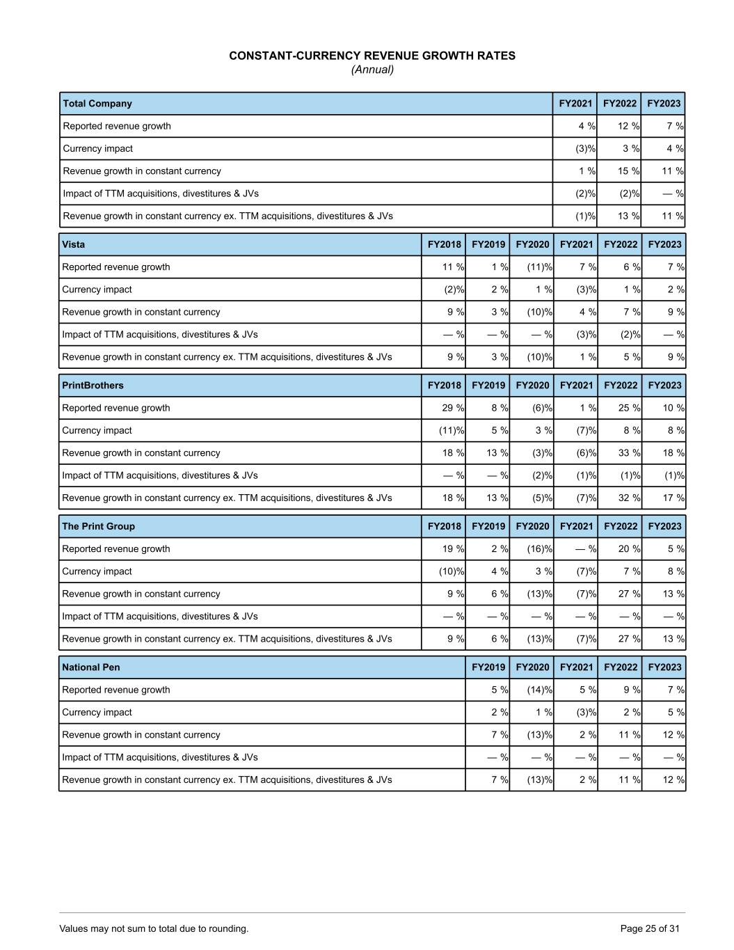 CONSTANT-CURRENCY REVENUE GROWTH RATES (Annual) Total Company FY2021 FY2022 FY2023 Reported revenue growth 4 % 12 % 7 % Currency impact (3) % 3 % 4 % Revenue growth in constant currency 1 % 15 % 11 % Impact of TTM acquisitions, divestitures & JVs (2) % (2) % — % Revenue growth in constant currency ex. TTM acquisitions, divestitures & JVs (1) % 13 % 11 % Vista FY2018 FY2019 FY2020 FY2021 FY2022 FY2023 Reported revenue growth 11 % 1 % (11) % 7 % 6 % 7 % Currency impact (2) % 2 % 1 % (3) % 1 % 2 % Revenue growth in constant currency 9 % 3 % (10) % 4 % 7 % 9 % Impact of TTM acquisitions, divestitures & JVs — % — % — % (3) % (2) % — % Revenue growth in constant currency ex. TTM acquisitions, divestitures & JVs 9 % 3 % (10) % 1 % 5 % 9 % PrintBrothers FY2018 FY2019 FY2020 FY2021 FY2022 FY2023 Reported revenue growth 29 % 8 % (6) % 1 % 25 % 10 % Currency impact (11) % 5 % 3 % (7) % 8 % 8 % Revenue growth in constant currency 18 % 13 % (3) % (6) % 33 % 18 % Impact of TTM acquisitions, divestitures & JVs — % — % (2) % (1) % (1) % (1) % Revenue growth in constant currency ex. TTM acquisitions, divestitures & JVs 18 % 13 % (5) % (7) % 32 % 17 % The Print Group FY2018 FY2019 FY2020 FY2021 FY2022 FY2023 Reported revenue growth 19 % 2 % (16) % — % 20 % 5 % Currency impact (10) % 4 % 3 % (7) % 7 % 8 % Revenue growth in constant currency 9 % 6 % (13) % (7) % 27 % 13 % Impact of TTM acquisitions, divestitures & JVs — % — % — % — % — % — % Revenue growth in constant currency ex. TTM acquisitions, divestitures & JVs 9 % 6 % (13) % (7) % 27 % 13 % National Pen FY2019 FY2020 FY2021 FY2022 FY2023 Reported revenue growth 5 % (14) % 5 % 9 % 7 % Currency impact 2 % 1 % (3) % 2 % 5 % Revenue growth in constant currency 7 % (13) % 2 % 11 % 12 % Impact of TTM acquisitions, divestitures & JVs — % — % — % — % — % Revenue growth in constant currency ex. TTM acquisitions, divestitures & JVs 7 % (13) % 2 % 11 % 12 % Values may not sum to total due to rounding. Page 25 of 31