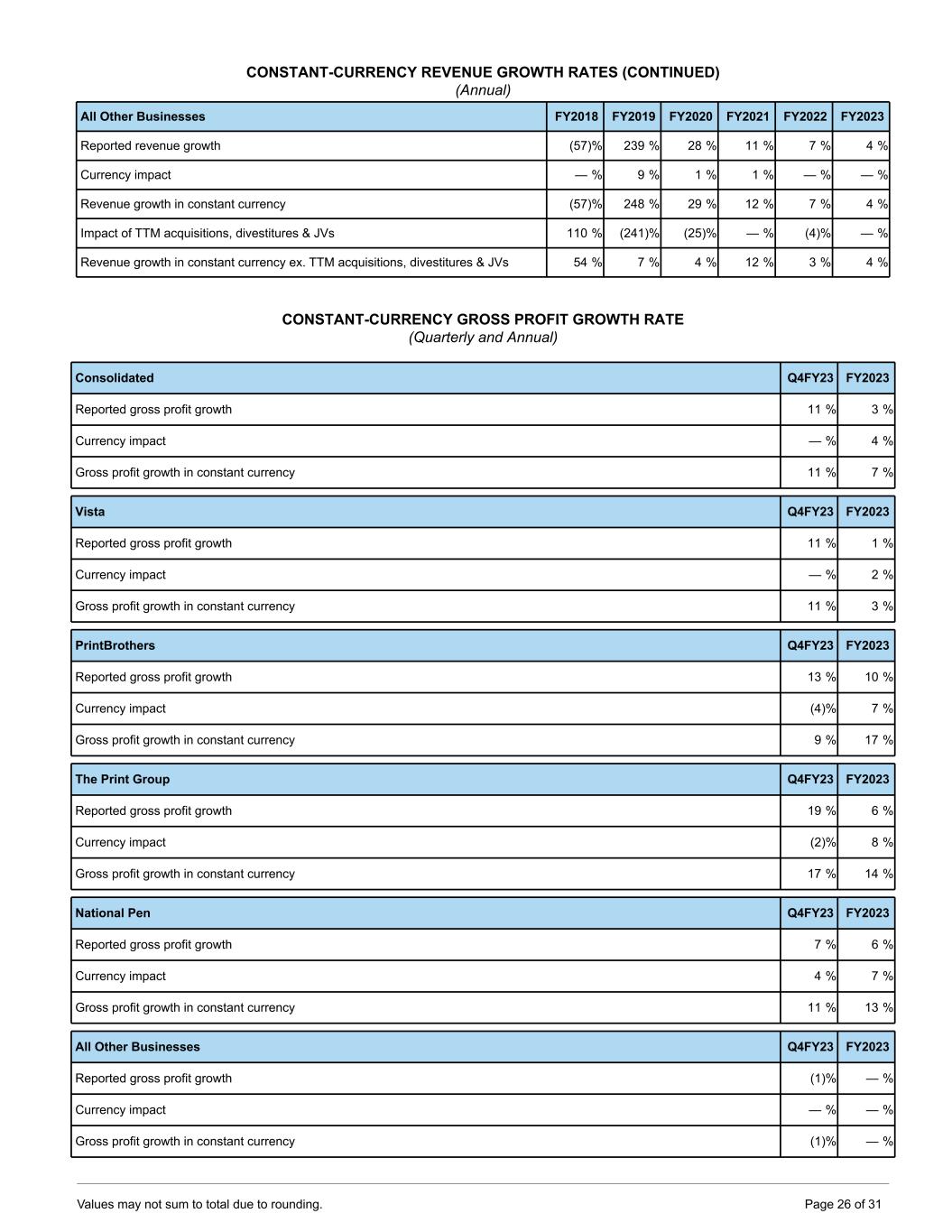 CONSTANT-CURRENCY REVENUE GROWTH RATES (CONTINUED) (Annual) All Other Businesses FY2018 FY2019 FY2020 FY2021 FY2022 FY2023 Reported revenue growth (57) % 239 % 28 % 11 % 7 % 4 % Currency impact — % 9 % 1 % 1 % — % — % Revenue growth in constant currency (57) % 248 % 29 % 12 % 7 % 4 % Impact of TTM acquisitions, divestitures & JVs 110 % (241) % (25) % — % (4) % — % Revenue growth in constant currency ex. TTM acquisitions, divestitures & JVs 54 % 7 % 4 % 12 % 3 % 4 % CONSTANT-CURRENCY GROSS PROFIT GROWTH RATE (Quarterly and Annual) Consolidated Q4FY23 FY2023 Reported gross profit growth 11 % 3 % Currency impact — % 4 % Gross profit growth in constant currency 11 % 7 % Vista Q4FY23 FY2023 Reported gross profit growth 11 % 1 % Currency impact — % 2 % Gross profit growth in constant currency 11 % 3 % PrintBrothers Q4FY23 FY2023 Reported gross profit growth 13 % 10 % Currency impact (4) % 7 % Gross profit growth in constant currency 9 % 17 % The Print Group Q4FY23 FY2023 Reported gross profit growth 19 % 6 % Currency impact (2) % 8 % Gross profit growth in constant currency 17 % 14 % National Pen Q4FY23 FY2023 Reported gross profit growth 7 % 6 % Currency impact 4 % 7 % Gross profit growth in constant currency 11 % 13 % All Other Businesses Q4FY23 FY2023 Reported gross profit growth (1) % — % Currency impact — % — % Gross profit growth in constant currency (1) % — % Values may not sum to total due to rounding. Page 26 of 31