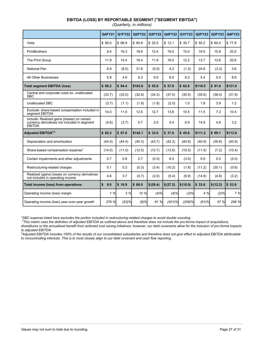 EBITDA (LOSS) BY REPORTABLE SEGMENT ("SEGMENT EBITDA") (Quarterly, in millions) Q4FY21 Q1FY22 Q2FY22 Q3FY22 Q4FY22 Q1FY23 Q2FY23 Q3FY23 Q4FY23 Vista $ 56.0 $ 66.9 $ 90.8 $ 25.5 $ 12.1 $ 30.7 $ 55.2 $ 60.4 $ 77.8 PrintBrothers 9.4 16.3 18.6 12.4 19.5 15.0 19.5 15.9 20.5 The Print Group 11.9 14.4 16.4 11.9 16.0 12.2 13.7 13.6 20.6 National Pen 6.9 (8.0) 31.6 (0.9) 4.2 (1.3) 24.8 (3.3) 3.6 All Other Businesses 5.9 4.9 6.3 6.0 6.0 6.2 5.4 5.0 8.6 Total segment EBITDA (loss) $ 90.2 $ 94.4 $ 163.6 $ 55.0 $ 57.8 $ 62.8 $ 118.5 $ 91.6 $ 131.0 Central and corporate costs ex. unallocated SBC (33.7) (33.0) (32.8) (34.3) (37.0) (35.5) (35.6) (38.4) (31.9) Unallocated SBC (3.7) (1.1) (1.9) (1.8) (2.0) 1.0 1.8 3.9 1.2 Exclude: share-based compensation included in segment EBITDA 14.0 11.0 12.5 12.7 13.6 10.5 11.5 7.2 10.4 Include: Realized gains (losses) on certain currency derivatives not included in segment EBITDA (4.6) (3.7) 0.7 2.0 5.4 6.9 14.9 4.8 3.2 Adjusted EBITDA2,3 $ 62.2 $ 67.6 $ 142.1 $ 33.6 $ 37.8 $ 45.6 $ 111.2 $ 69.1 $ 113.9 Depreciation and amortization (44.5) (44.4) (45.3) (43.7) (42.3) (40.9) (40.9) (39.8) (40.9) Share-based compensation expense1 (14.0) (11.0) (12.5) (12.7) (13.6) (10.5) (11.5) (7.2) (10.4) Certain impairments and other adjustments 0.7 0.8 2.7 (0.3) 6.5 (3.5) 0.9 0.5 (5.0) Restructuring-related charges 0.1 0.3 (0.3) (3.4) (10.2) (1.8) (11.2) (30.1) (0.6) Realized (gains) losses on currency derivatives not included in operating income 4.6 3.7 (0.7) (2.0) (5.4) (6.9) (14.9) (4.8) (3.2) Total income (loss) from operations $ 9.0 $ 16.9 $ 86.0 $ (28.4) $ (27.2) $ (18.0) $ 33.6 $ (12.2) $ 53.9 Operating income (loss) margin 1 % 3 % 10 % (4) % (4) % (3) % 4 % (2) % 7 % Operating income (loss) year-over-year growth 376 % (53) % (9) % 81 % (401) % (206) % (61) % 57 % 298 % 1SBC expense listed here excludes the portion included in restructuring-related charges to avoid double counting. 2This metric uses the definition of adjusted EBITDA as outlined above and therefore does not include the pro-forma impact of acquisitions, divestitures or the annualized benefit from actioned cost saving initiatives; however, our debt covenants allow for the inclusion of pro-forma impacts to adjusted EBITDA. 3Adjusted EBITDA includes 100% of the results of our consolidated subsidiaries and therefore does not give effect to adjusted EBITDA attributable to noncontrolling interests. This is to most closely align to our debt covenant and cash flow reporting. Values may not sum to total due to rounding. Page 27 of 31