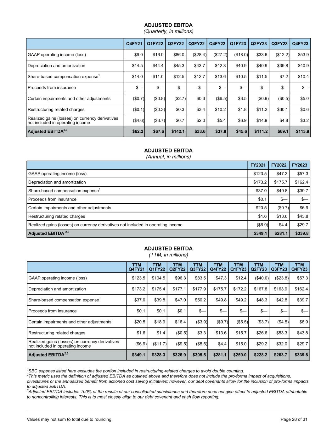 ADJUSTED EBITDA (Quarterly, in millions) Q4FY21 Q1FY22 Q2FY22 Q3FY22 Q4FY22 Q1FY23 Q2FY23 Q3FY23 Q4FY23 GAAP operating income (loss) $9.0 $16.9 $86.0 ($28.4) ($27.2) ($18.0) $33.6 ($12.2) $53.9 Depreciation and amortization $44.5 $44.4 $45.3 $43.7 $42.3 $40.9 $40.9 $39.8 $40.9 Share-based compensation expense1 $14.0 $11.0 $12.5 $12.7 $13.6 $10.5 $11.5 $7.2 $10.4 Proceeds from insurance $— $— $— $— $— $— $— $— $— Certain impairments and other adjustments ($0.7) ($0.8) ($2.7) $0.3 ($6.5) $3.5 ($0.9) ($0.5) $5.0 Restructuring related charges ($0.1) ($0.3) $0.3 $3.4 $10.2 $1.8 $11.2 $30.1 $0.6 Realized gains (losses) on currency derivatives not included in operating income ($4.6) ($3.7) $0.7 $2.0 $5.4 $6.9 $14.9 $4.8 $3.2 Adjusted EBITDA2,3 $62.2 $67.6 $142.1 $33.6 $37.8 $45.6 $111.2 $69.1 $113.9 ADJUSTED EBITDA (Annual, in millions) FY2021 FY2022 FY2023 GAAP operating income (loss) $123.5 $47.3 $57.3 Depreciation and amortization $173.2 $175.7 $162.4 Share-based compensation expense1 $37.0 $49.8 $39.7 Proceeds from insurance $0.1 $— $— Certain impairments and other adjustments $20.5 ($9.7) $6.9 Restructuring related charges $1.6 $13.6 $43.8 Realized gains (losses) on currency derivatives not included in operating income ($6.9) $4.4 $29.7 Adjusted EBITDA 2,3 $349.1 $281.1 $339.8 ADJUSTED EBITDA (TTM, in millions) TTM Q4FY21 TTM Q1FY22 TTM Q2FY22 TTM Q3FY22 TTM Q4FY22 TTM Q1FY23 TTM Q2FY23 TTM Q3FY23 TTM Q4FY23 GAAP operating income (loss) $123.5 $104.5 $96.3 $83.5 $47.3 $12.4 ($40.0) ($23.8) $57.3 Depreciation and amortization $173.2 $175.4 $177.1 $177.9 $175.7 $172.2 $167.8 $163.9 $162.4 Share-based compensation expense1 $37.0 $39.8 $47.0 $50.2 $49.8 $49.2 $48.3 $42.8 $39.7 Proceeds from insurance $0.1 $0.1 $0.1 $— $— $— $— $— $— Certain impairments and other adjustments $20.5 $18.9 $16.4 ($3.9) ($9.7) ($5.5) ($3.7) ($4.5) $6.9 Restructuring related charges $1.6 $1.4 ($0.5) $3.3 $13.6 $15.7 $26.6 $53.3 $43.8 Realized gains (losses) on currency derivatives not included in operating income ($6.9) ($11.7) ($9.5) ($5.5) $4.4 $15.0 $29.2 $32.0 $29.7 Adjusted EBITDA2,3 $349.1 $328.3 $326.9 $305.5 $281.1 $259.0 $228.2 $263.7 $339.8 1SBC expense listed here excludes the portion included in restructuring-related charges to avoid double counting. 2This metric uses the definition of adjusted EBITDA as outlined above and therefore does not include the pro-forma impact of acquisitions, divestitures or the annualized benefit from actioned cost saving initiatives; however, our debt covenants allow for the inclusion of pro-forma impacts to adjusted EBITDA. 3Adjusted EBITDA includes 100% of the results of our consolidated subsidiaries and therefore does not give effect to adjusted EBITDA attributable to noncontrolling interests. This is to most closely align to our debt covenant and cash flow reporting. Values may not sum to total due to rounding. Page 28 of 31