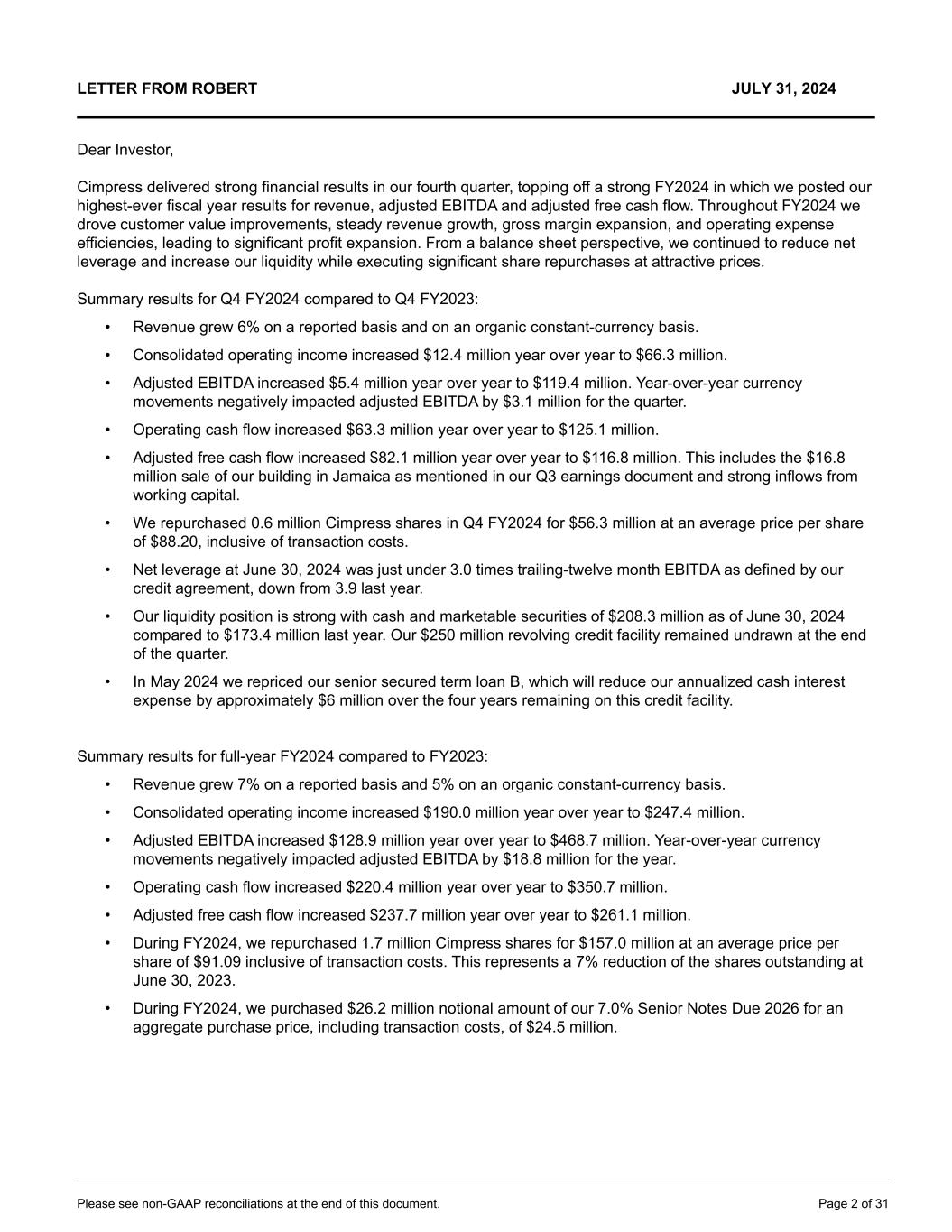 LETTER FROM ROBERT JULY 31, 2024 Dear Investor, Cimpress delivered strong financial results in our fourth quarter, topping off a strong FY2024 in which we posted our highest-ever fiscal year results for revenue, adjusted EBITDA and adjusted free cash flow. Throughout FY2024 we drove customer value improvements, steady revenue growth, gross margin expansion, and operating expense efficiencies, leading to significant profit expansion. From a balance sheet perspective, we continued to reduce net leverage and increase our liquidity while executing significant share repurchases at attractive prices. Summary results for Q4 FY2024 compared to Q4 FY2023: • Revenue grew 6% on a reported basis and on an organic constant-currency basis. • Consolidated operating income increased $12.4 million year over year to $66.3 million. • Adjusted EBITDA increased $5.4 million year over year to $119.4 million. Year-over-year currency movements negatively impacted adjusted EBITDA by $3.1 million for the quarter. • Operating cash flow increased $63.3 million year over year to $125.1 million. • Adjusted free cash flow increased $82.1 million year over year to $116.8 million. This includes the $16.8 million sale of our building in Jamaica as mentioned in our Q3 earnings document and strong inflows from working capital. • We repurchased 0.6 million Cimpress shares in Q4 FY2024 for $56.3 million at an average price per share of $88.20, inclusive of transaction costs. • Net leverage at June 30, 2024 was just under 3.0 times trailing-twelve month EBITDA as defined by our credit agreement, down from 3.9 last year. • Our liquidity position is strong with cash and marketable securities of $208.3 million as of June 30, 2024 compared to $173.4 million last year. Our $250 million revolving credit facility remained undrawn at the end of the quarter. • In May 2024 we repriced our senior secured term loan B, which will reduce our annualized cash interest expense by approximately $6 million over the four years remaining on this credit facility. Summary results for full-year FY2024 compared to FY2023: • Revenue grew 7% on a reported basis and 5% on an organic constant-currency basis. • Consolidated operating income increased $190.0 million year over year to $247.4 million. • Adjusted EBITDA increased $128.9 million year over year to $468.7 million. Year-over-year currency movements negatively impacted adjusted EBITDA by $18.8 million for the year. • Operating cash flow increased $220.4 million year over year to $350.7 million. • Adjusted free cash flow increased $237.7 million year over year to $261.1 million. • During FY2024, we repurchased 1.7 million Cimpress shares for $157.0 million at an average price per share of $91.09 inclusive of transaction costs. This represents a 7% reduction of the shares outstanding at June 30, 2023. • During FY2024, we purchased $26.2 million notional amount of our 7.0% Senior Notes Due 2026 for an aggregate purchase price, including transaction costs, of $24.5 million. Please see non-GAAP reconciliations at the end of this document. Page 2 of 31